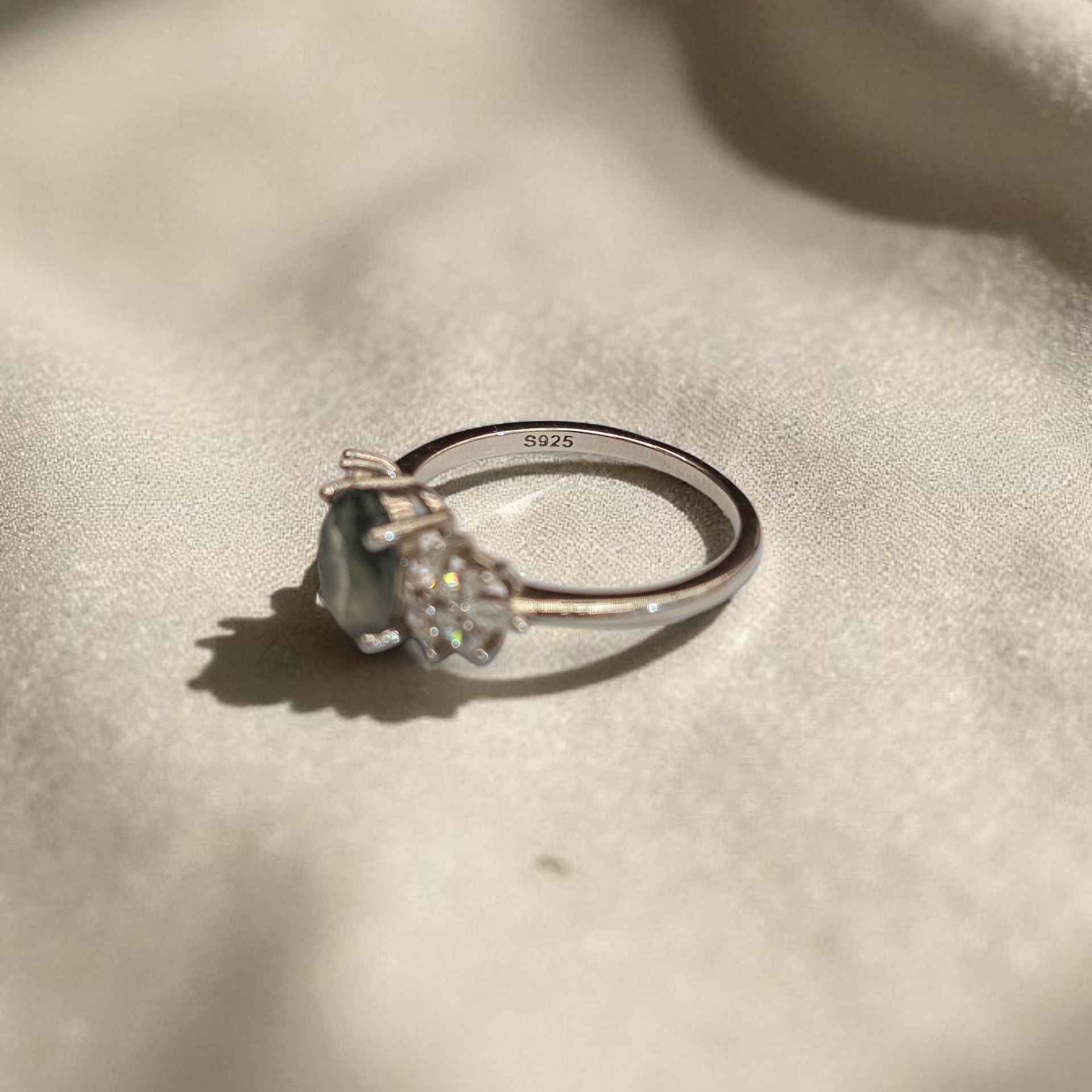 Anello realizzato artigialmente in argento 925 con gemme preziose nel castone centrale.