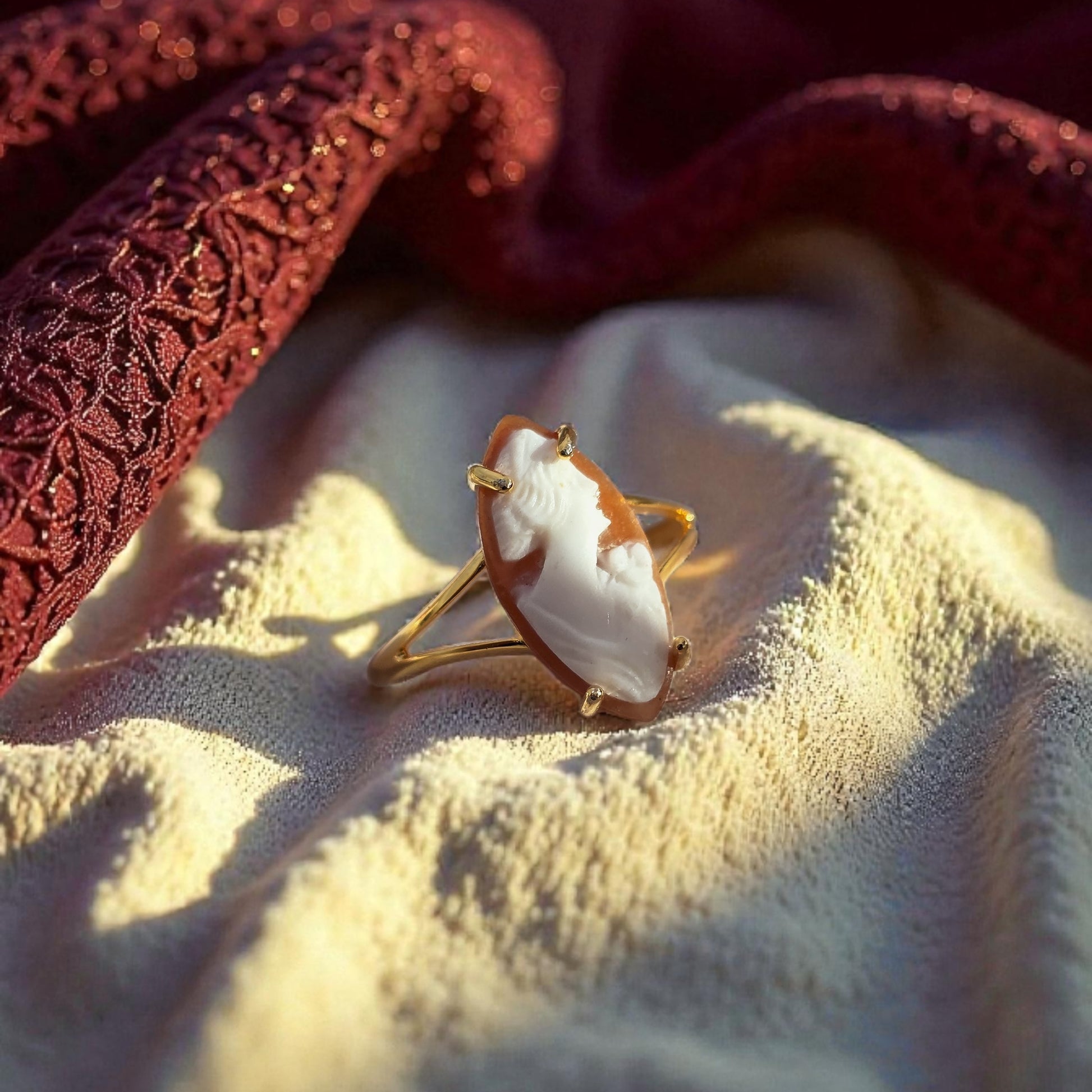 Il cammeo è incastonato su una montatura a spoletta. È realizzato in argento 925: la superficie è rifinita con rodiatura oro 9k.