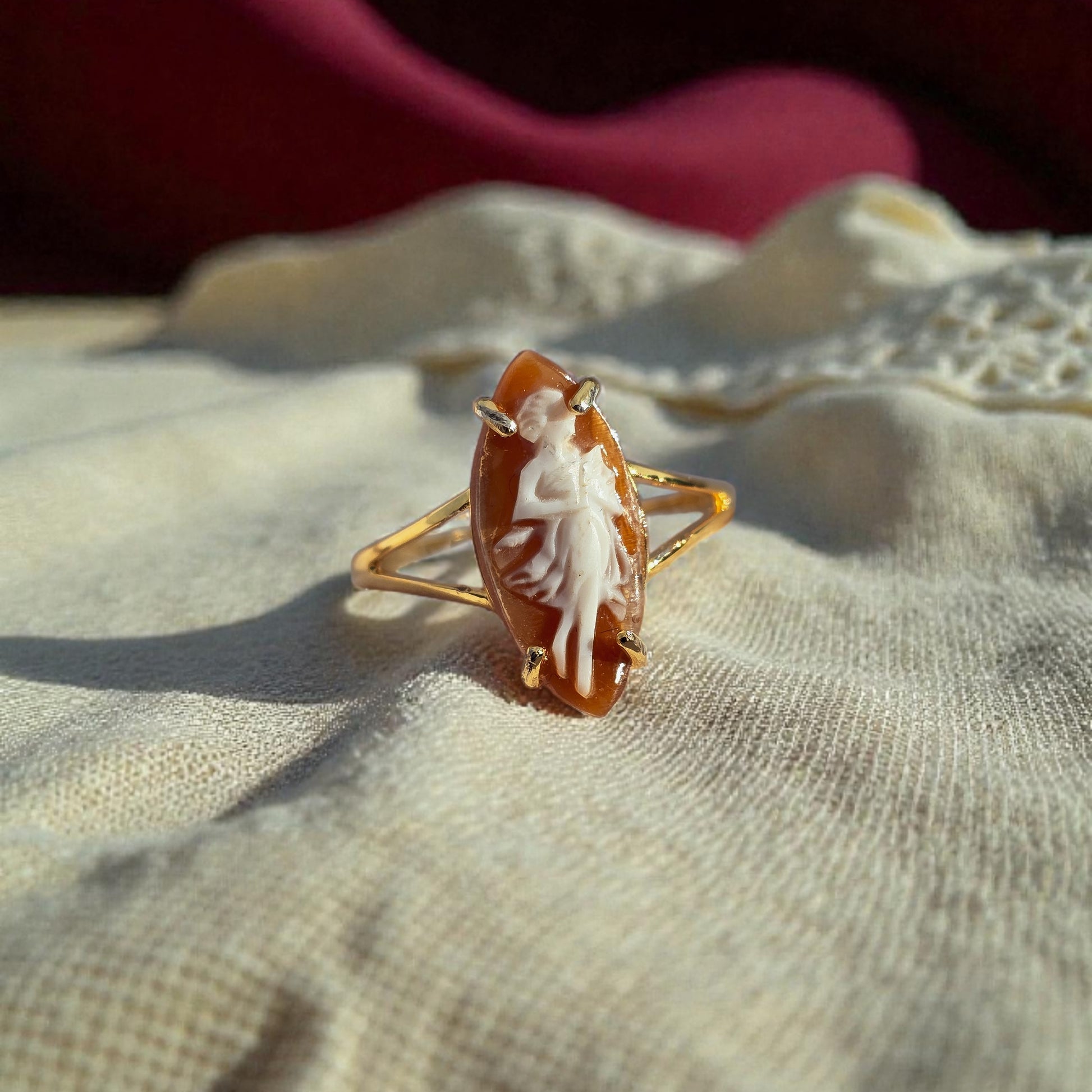 Il cammeo, raffigurante la fanciulla con una piccola Luna in grembo, è incastonato su una montatura a spoletta. È realizzato in argento 925: la superficie è rifinita con rodiatura oro 9k.