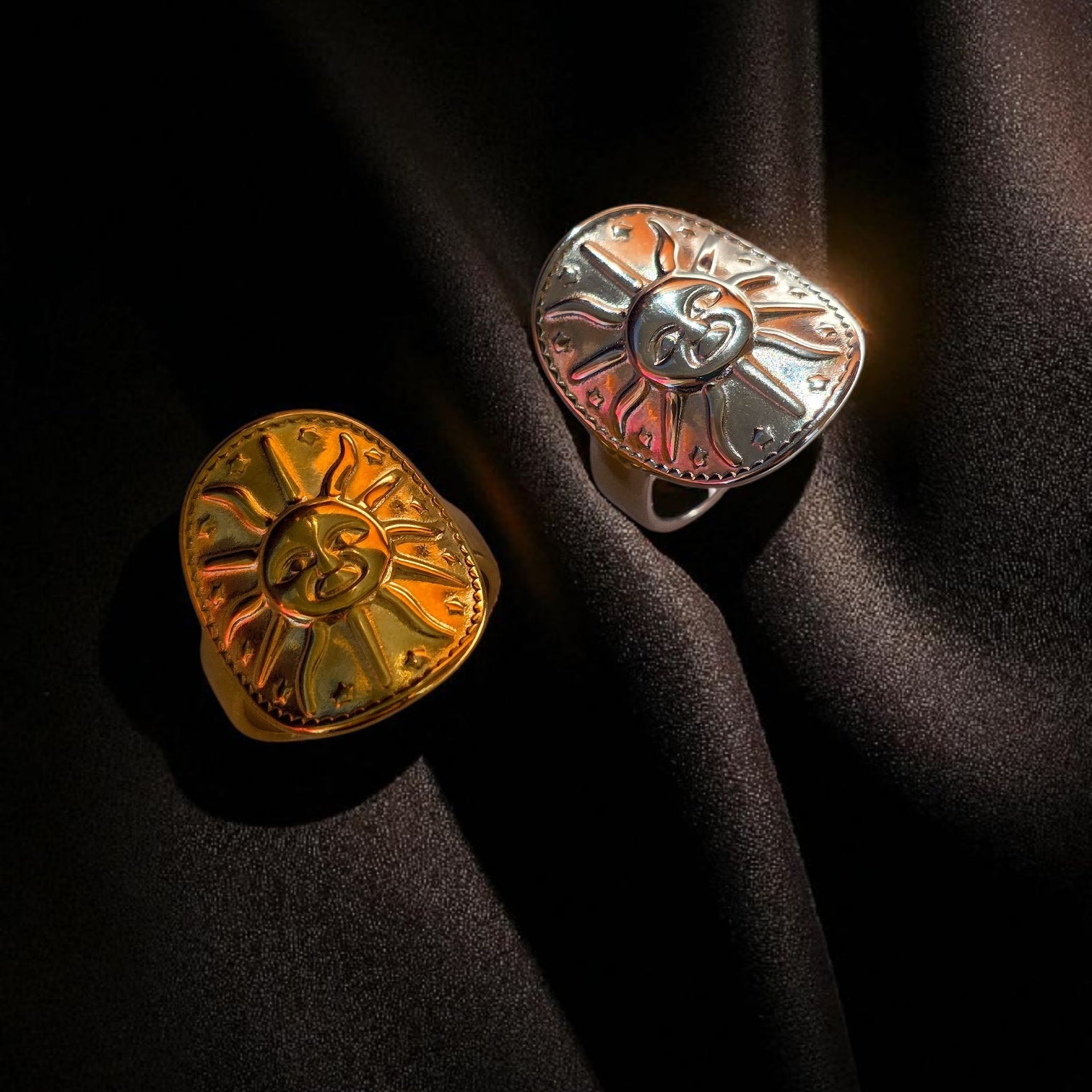 Anello scolpito su struttura a scudo, saldato a una fedina regolabile.