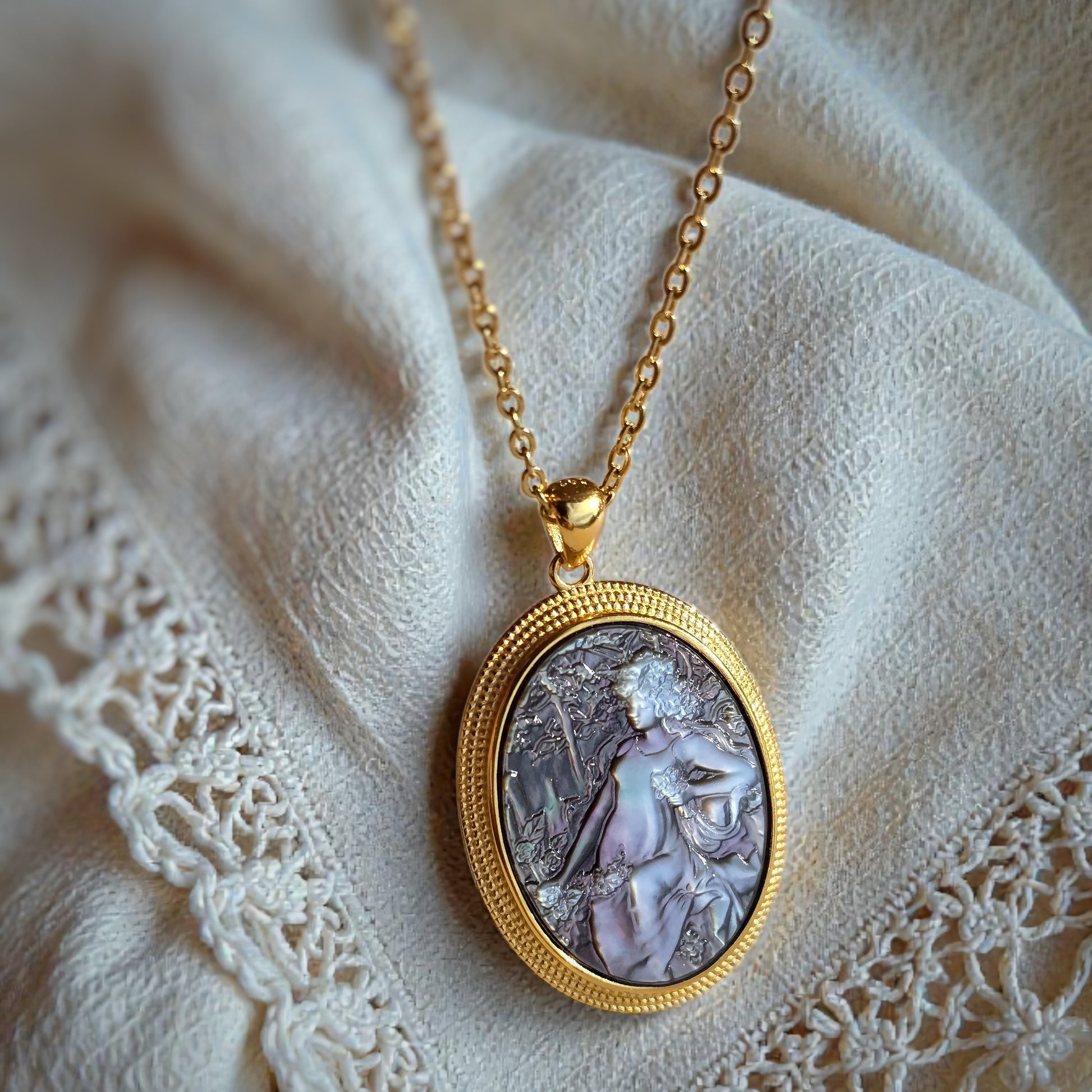 Girocollo con veneziana finissima e leggermente ritòrta a spirale con pendente cammeo in madreperla nera, cassato su montatura in filigrana argento 925 galvanizzato oro 24k.