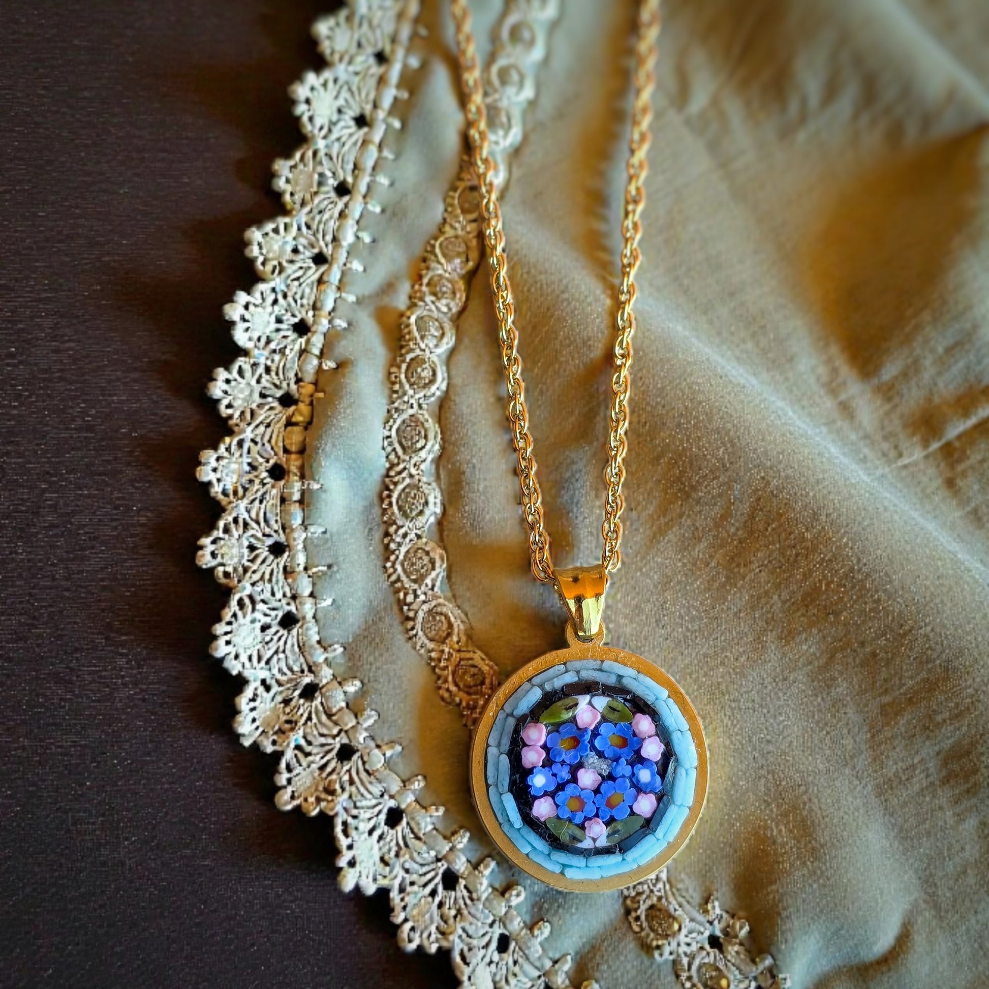 Ciondolino tondo realizzato completamente a mano, partendo dalla tecnica antica del micromosaico romano.