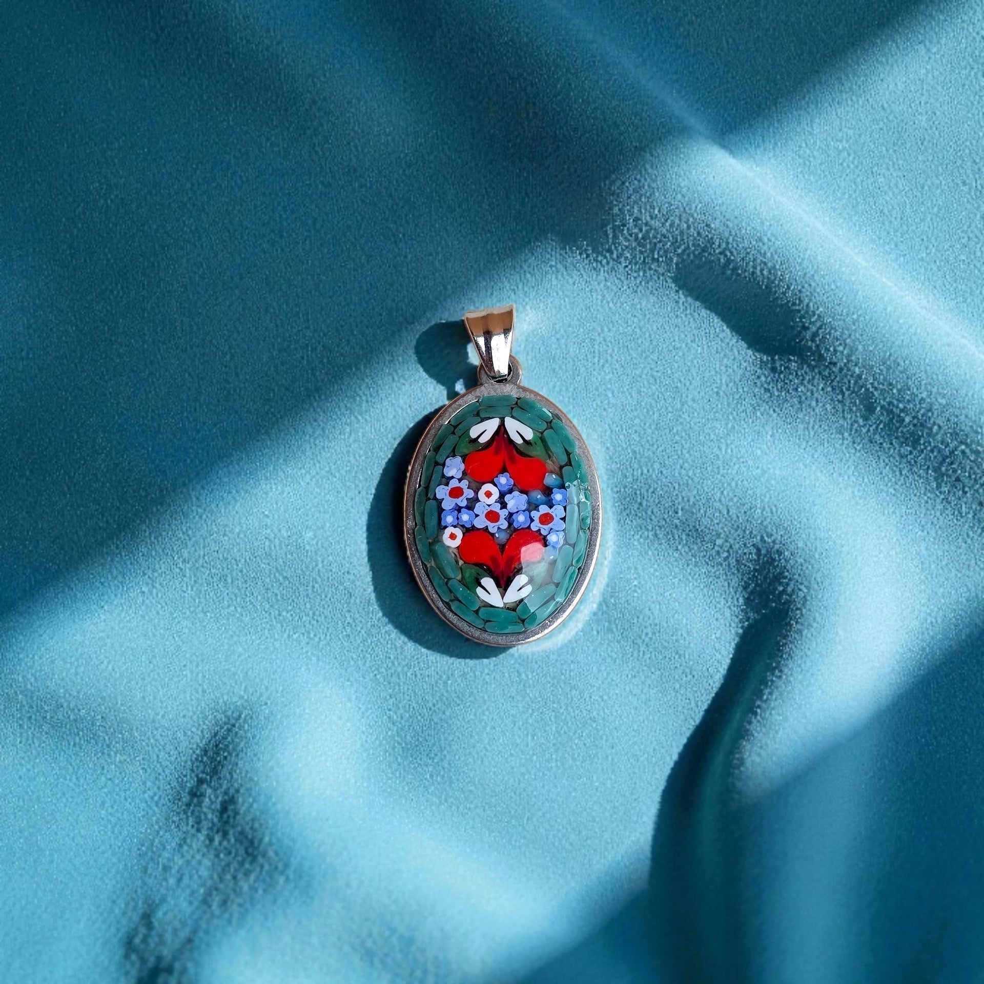 Ciondolino ovale realizzato completamente a mano, partendo dalla tecnica antica del micromosaico romano.