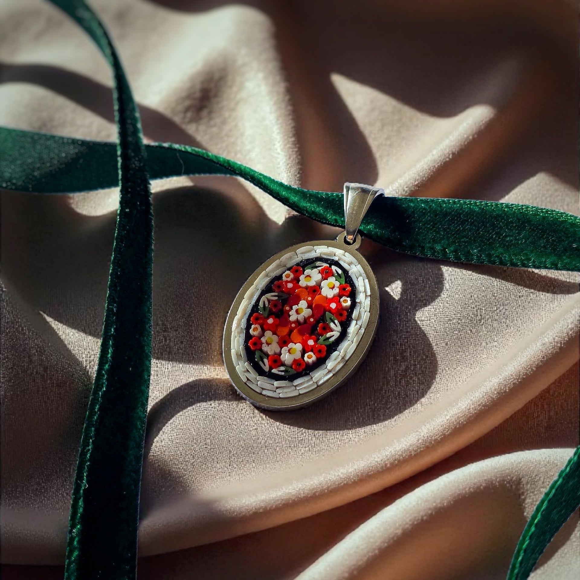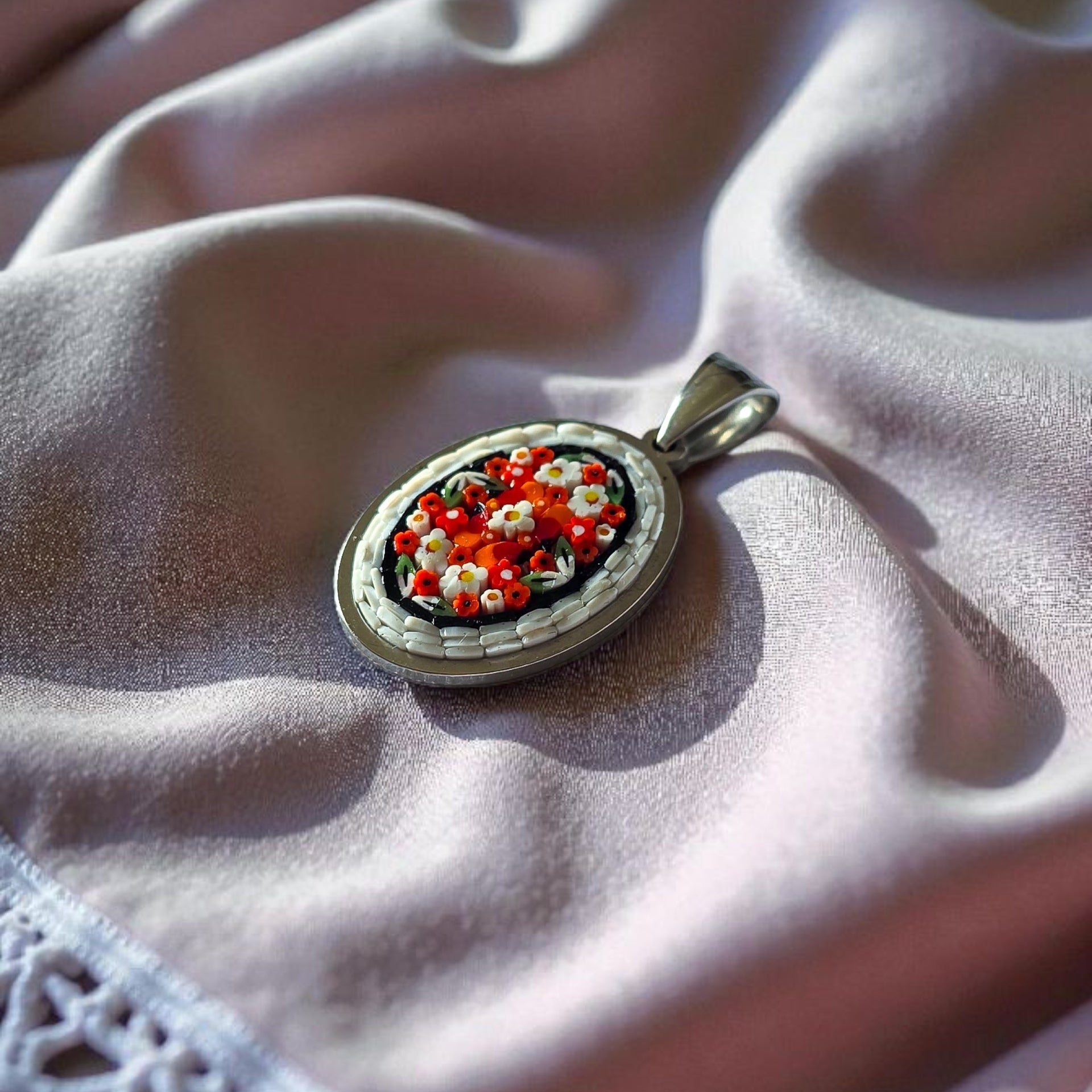 Ciondolino tondo realizzato completamente a mano, partendo dalla tecnica antica del micromosaico romano.