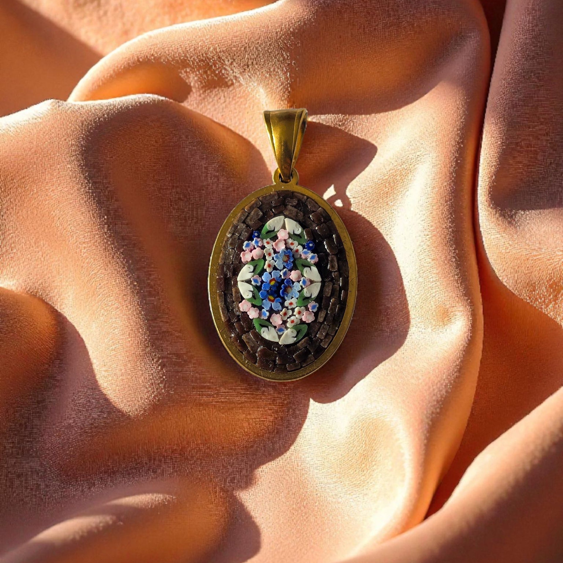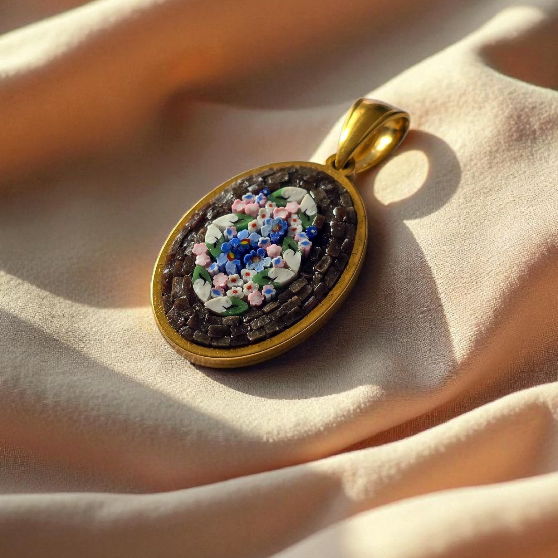 Ciondolino tondo realizzato completamente a mano, partendo dalla tecnica antica del micromosaico romano.
