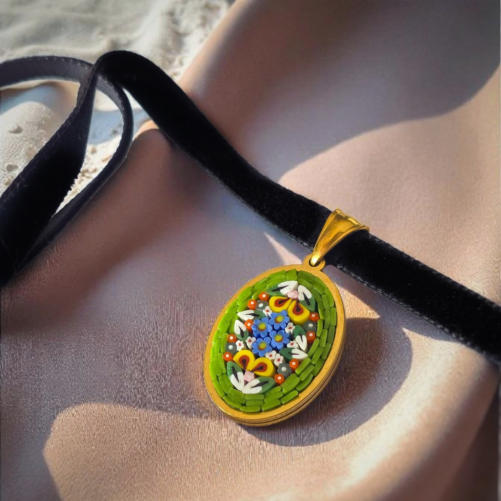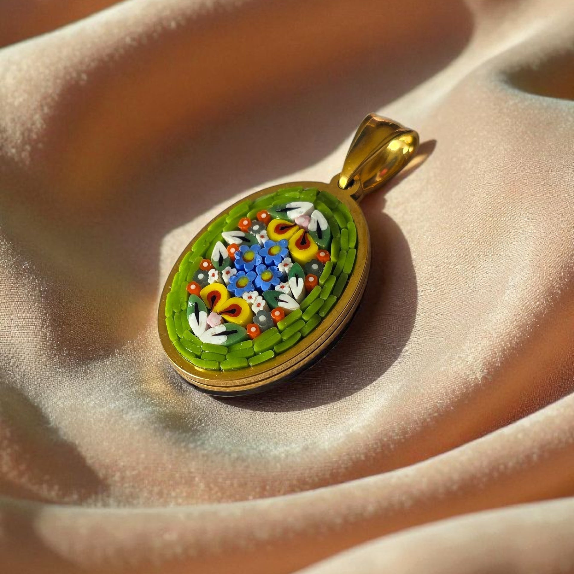 Ciondolino tondo realizzato completamente a mano, partendo dalla tecnica antica del micromosaico romano.