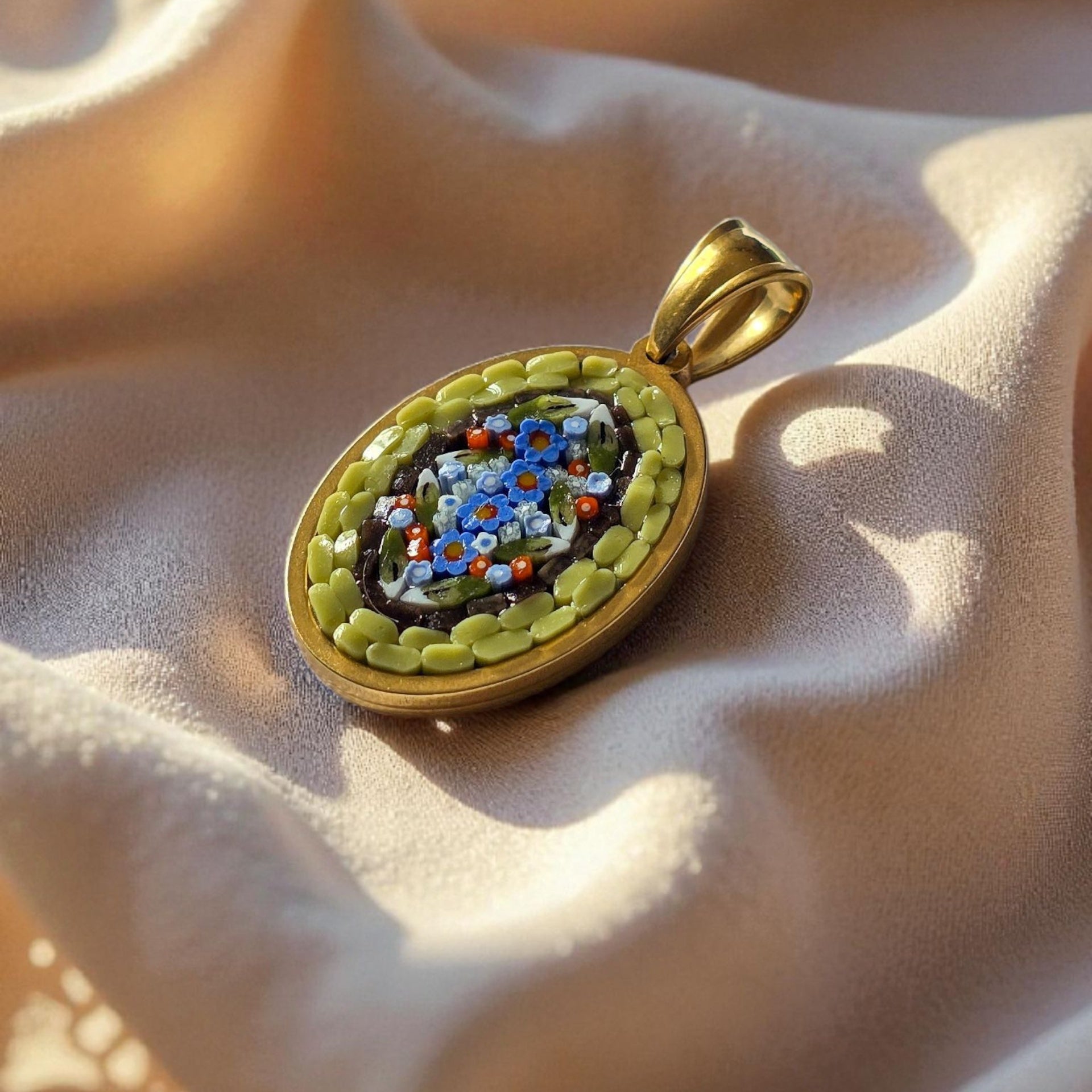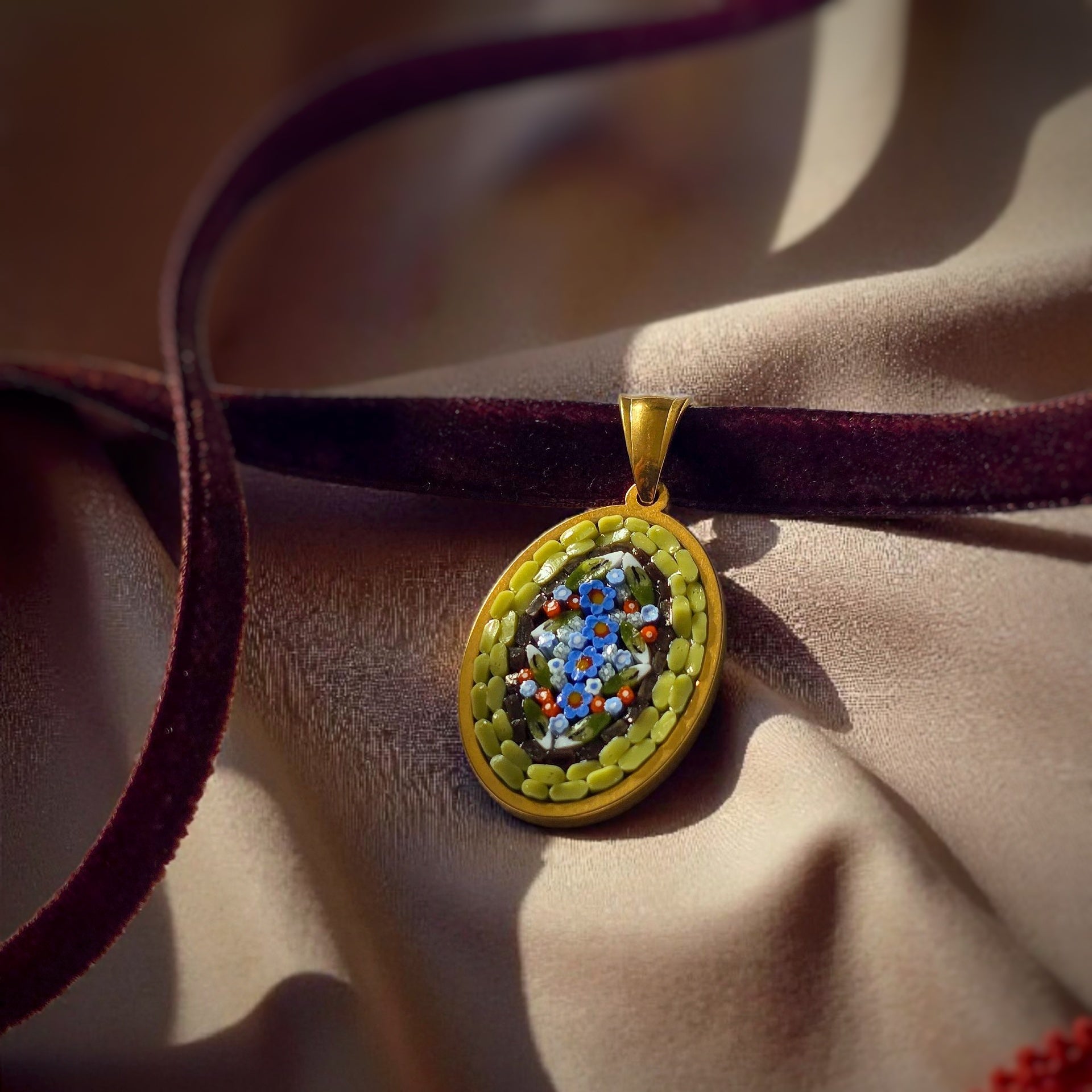 Ciondolino tondo realizzato completamente a mano, partendo dalla tecnica antica del micromosaico romano.