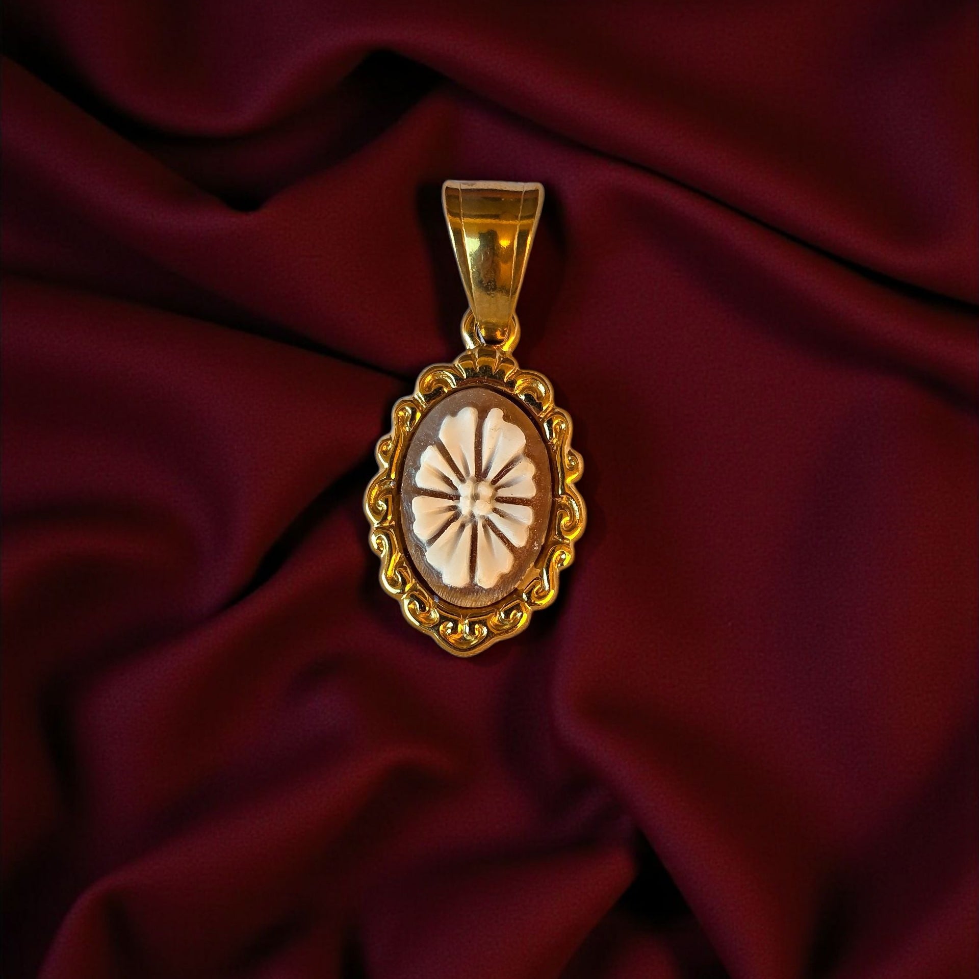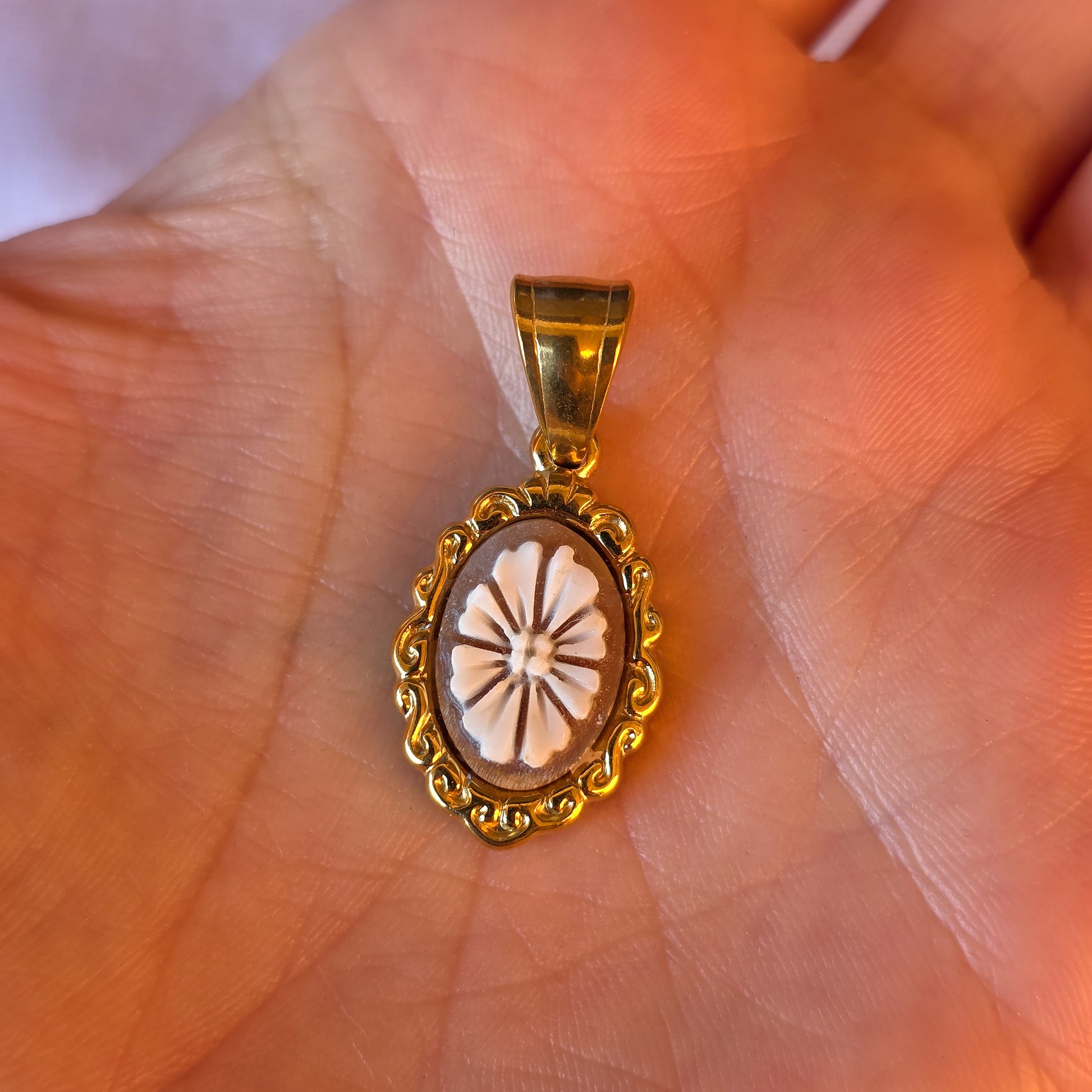 Ciondolo con cameo realizzato in conchiglia sardonica, intagliata a mano e montata su acciaio 316L placcato oro 18k.