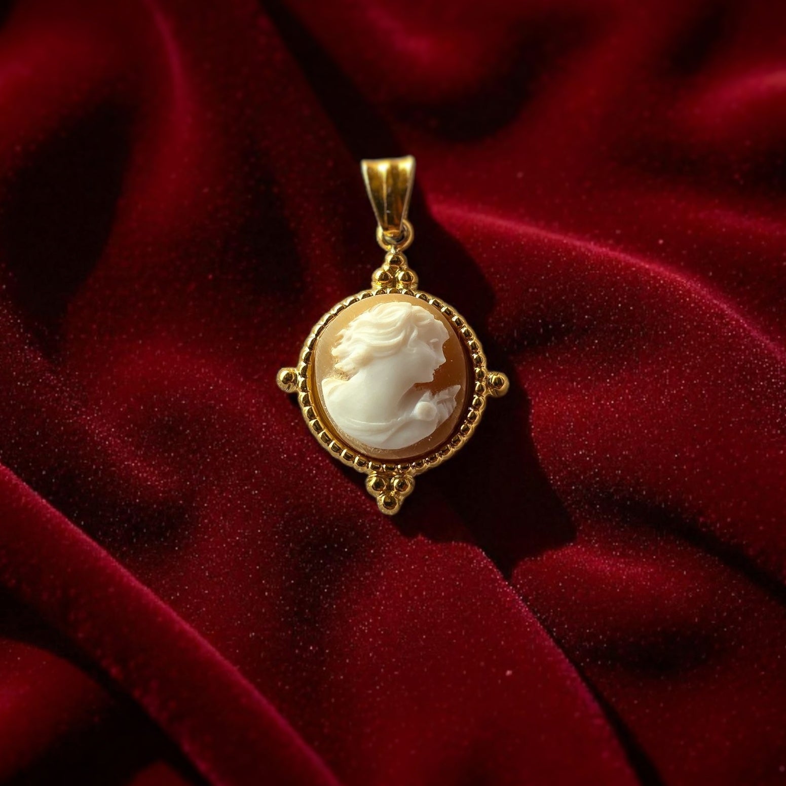 Ciondolo con cameo realizzato in conchiglia sardonica, intagliata a mano e montata su acciaio 316L placcato oro 18k.