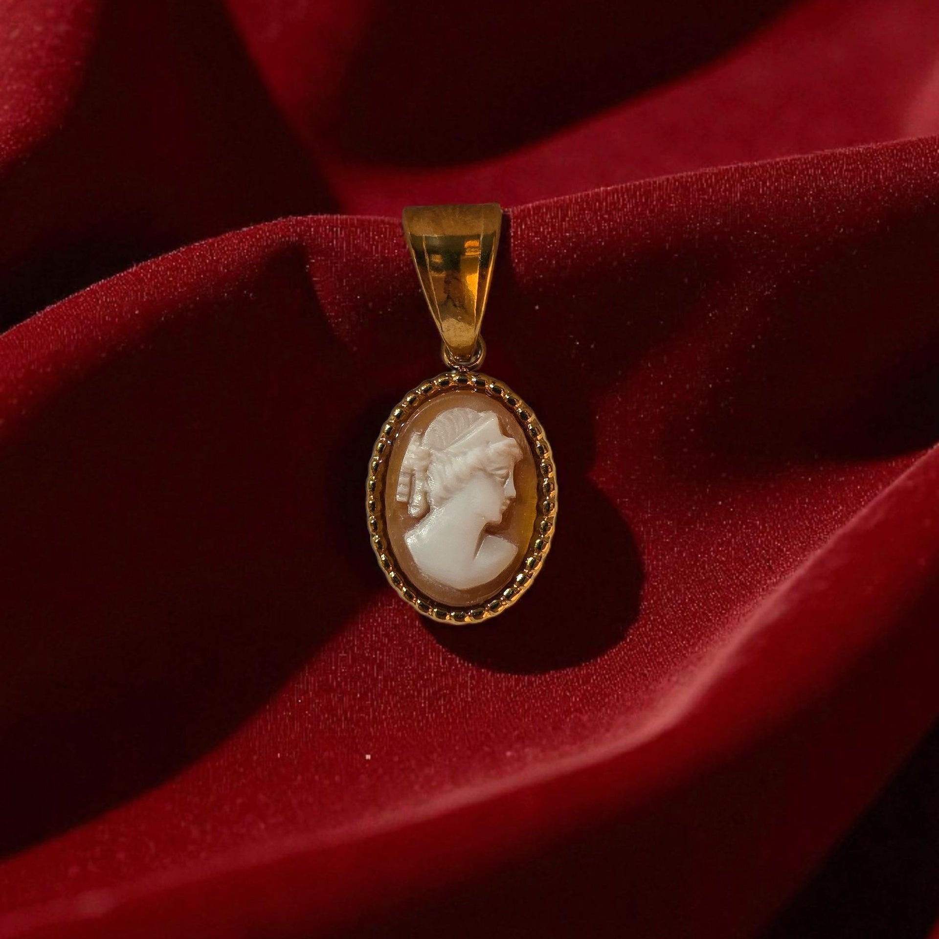 Ciondolo con cameo realizzato in conchiglia sardonica, intagliata a mano e montata su acciaio 316L placcato oro 18k.