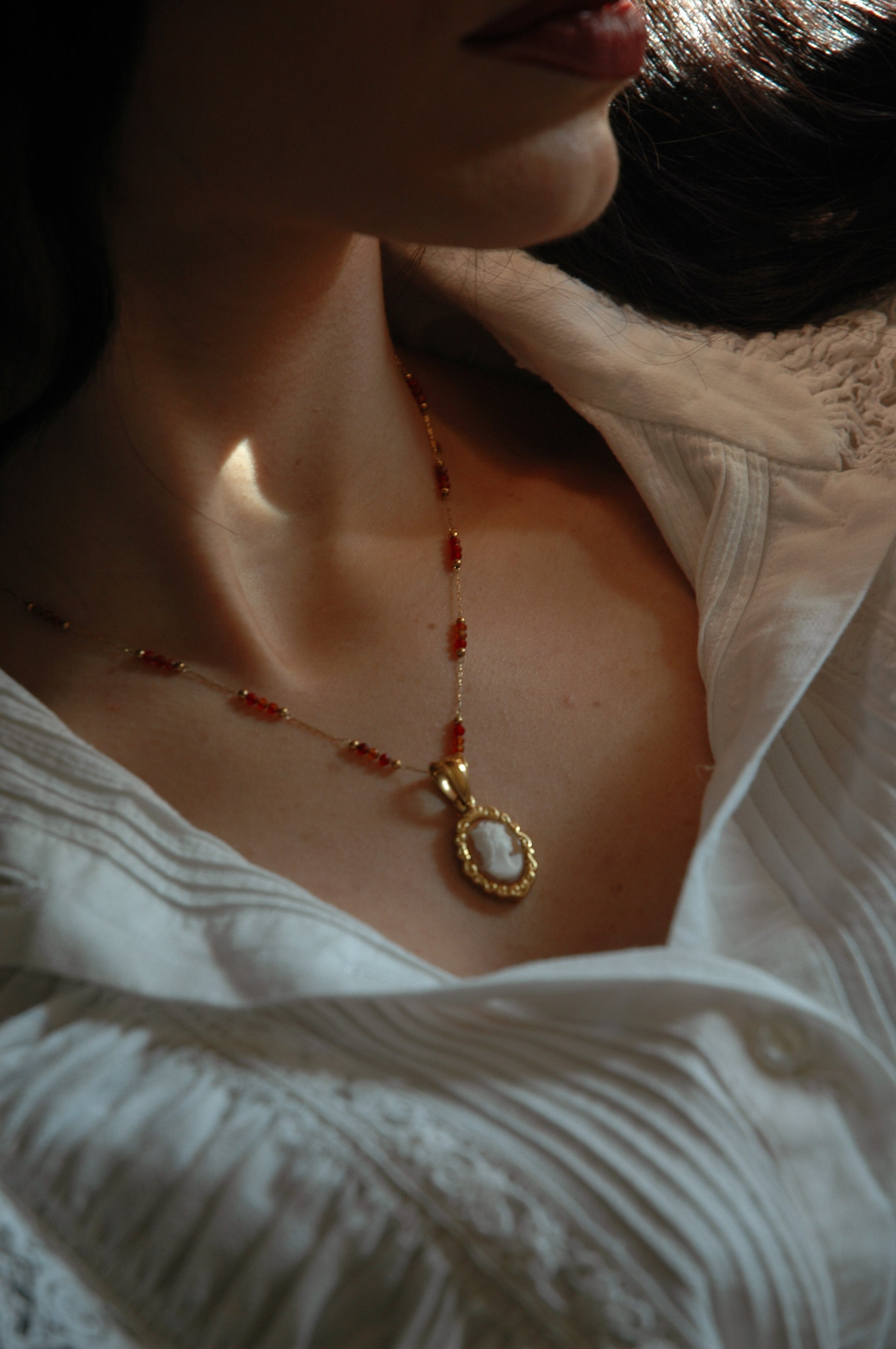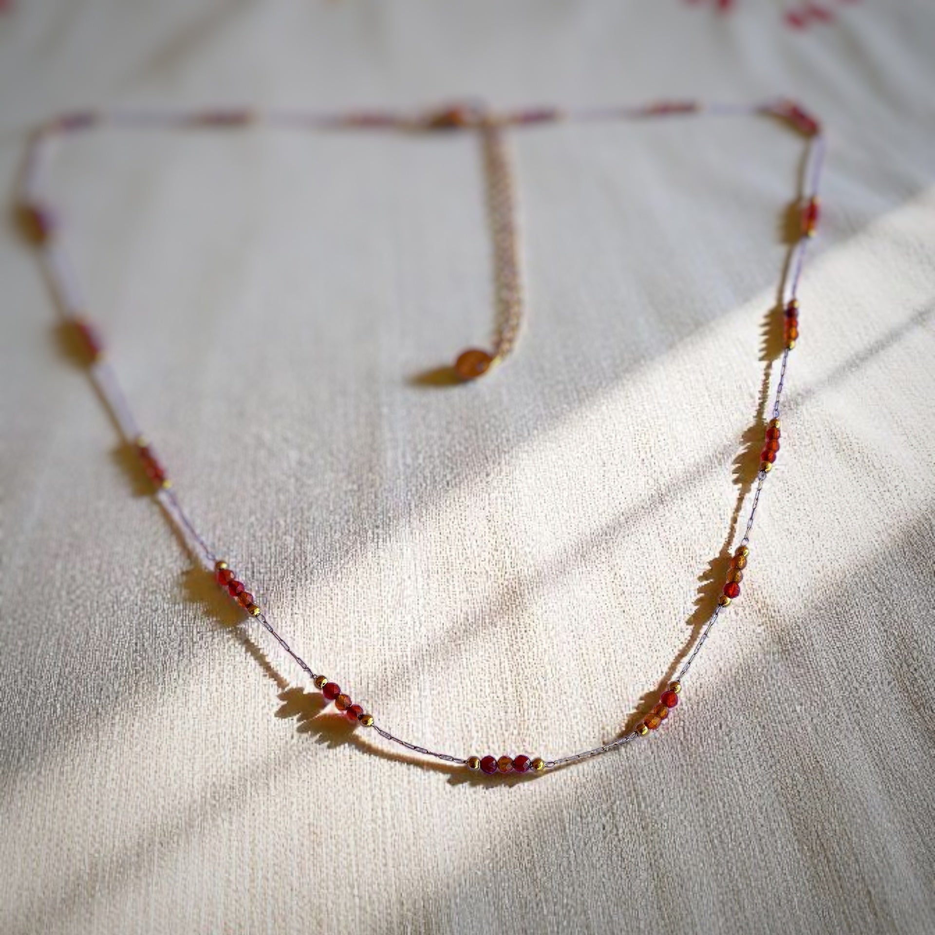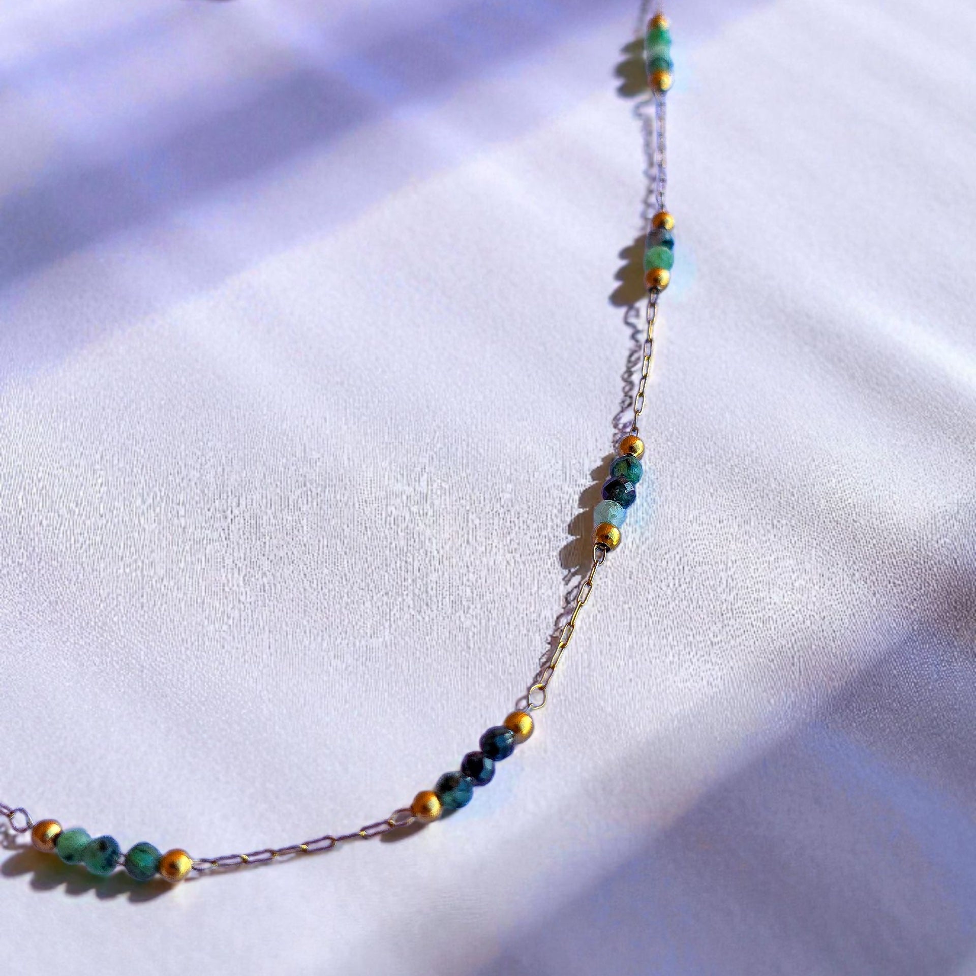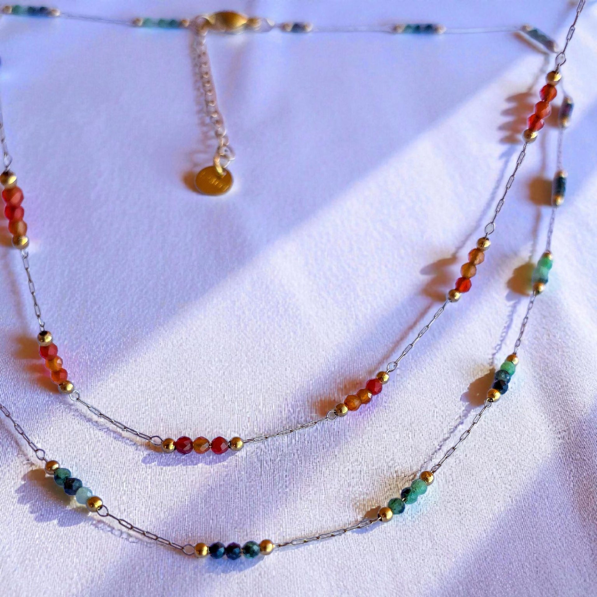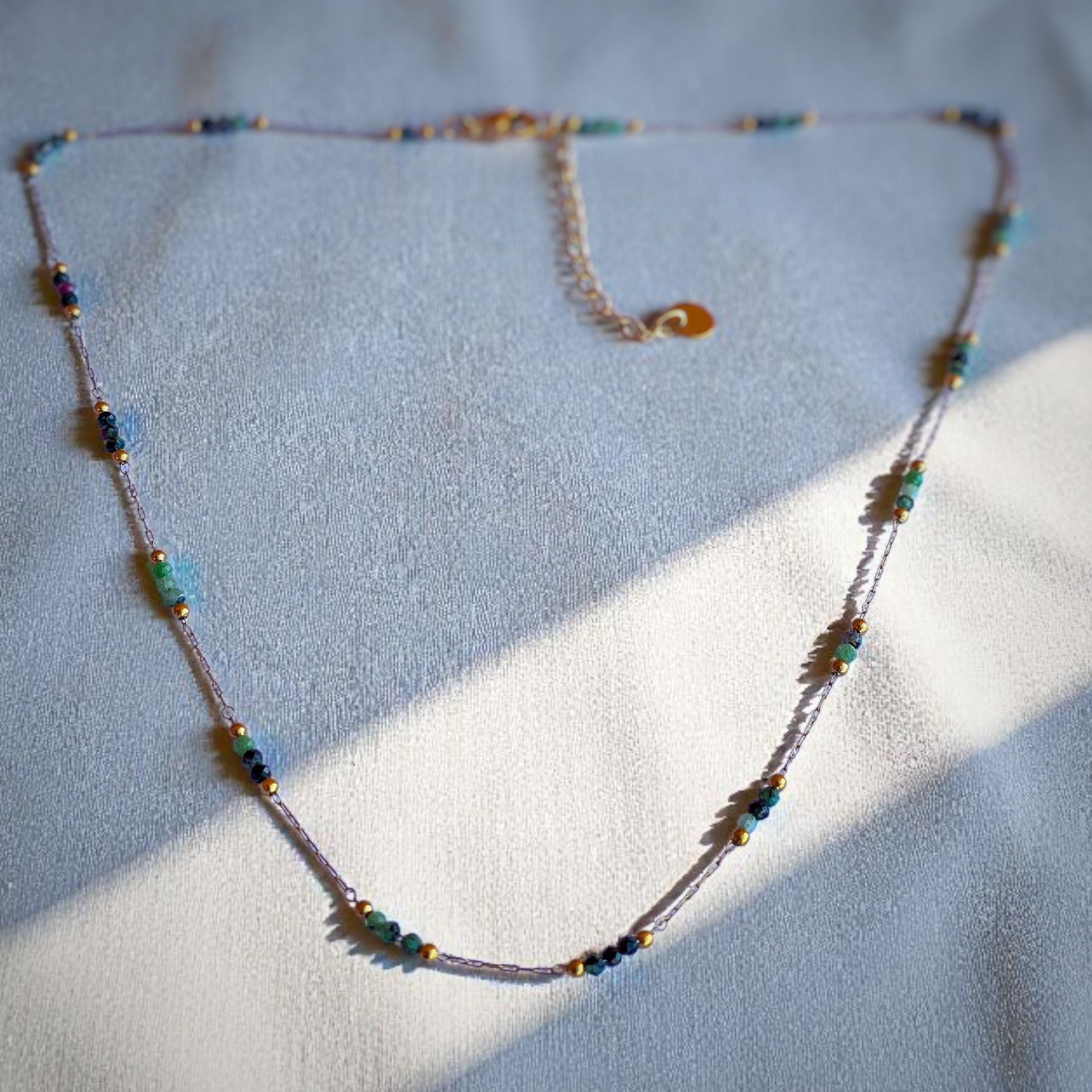 Girocollo realizzato a mano: una catenina finissima, minimale, in acciaio 316L galvanizzato oro 18k, è ritmata da piccole perline di pietre dure naturali sfaccettate, dai toni caldi: corniola arancione e zoosite verde.