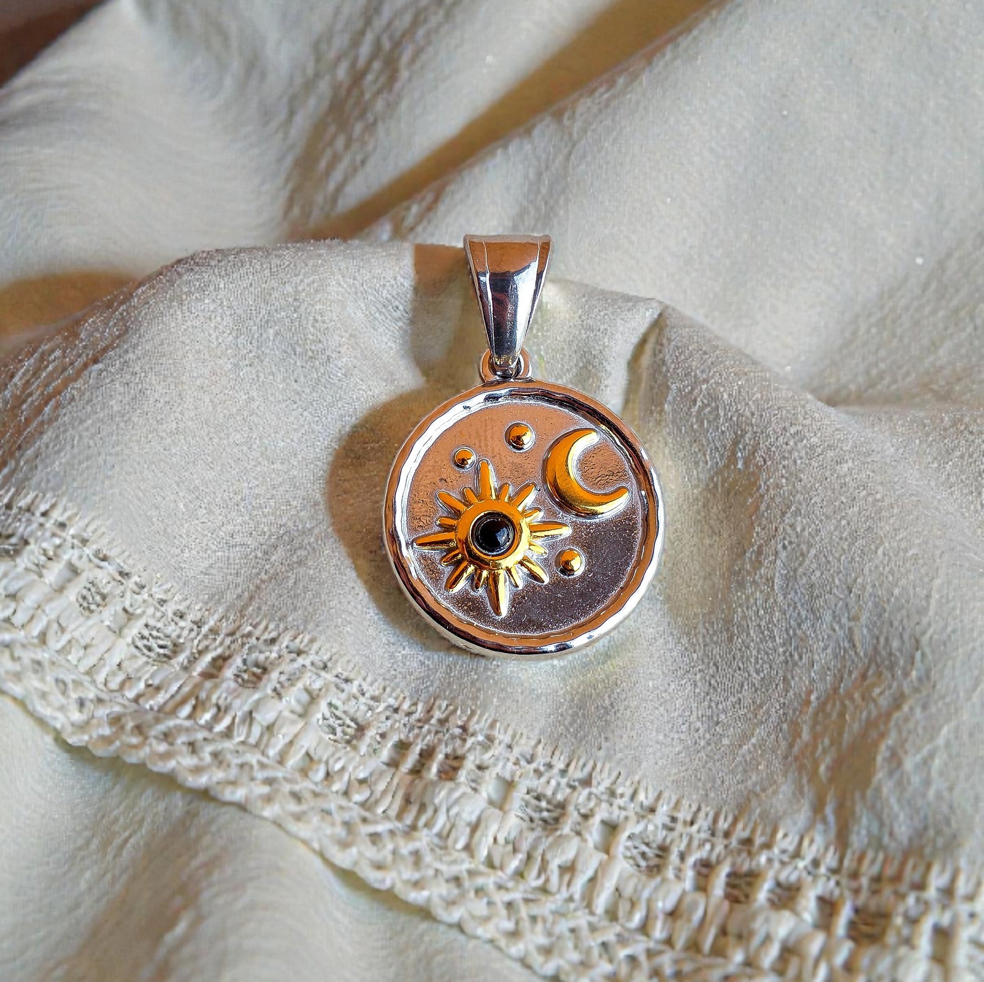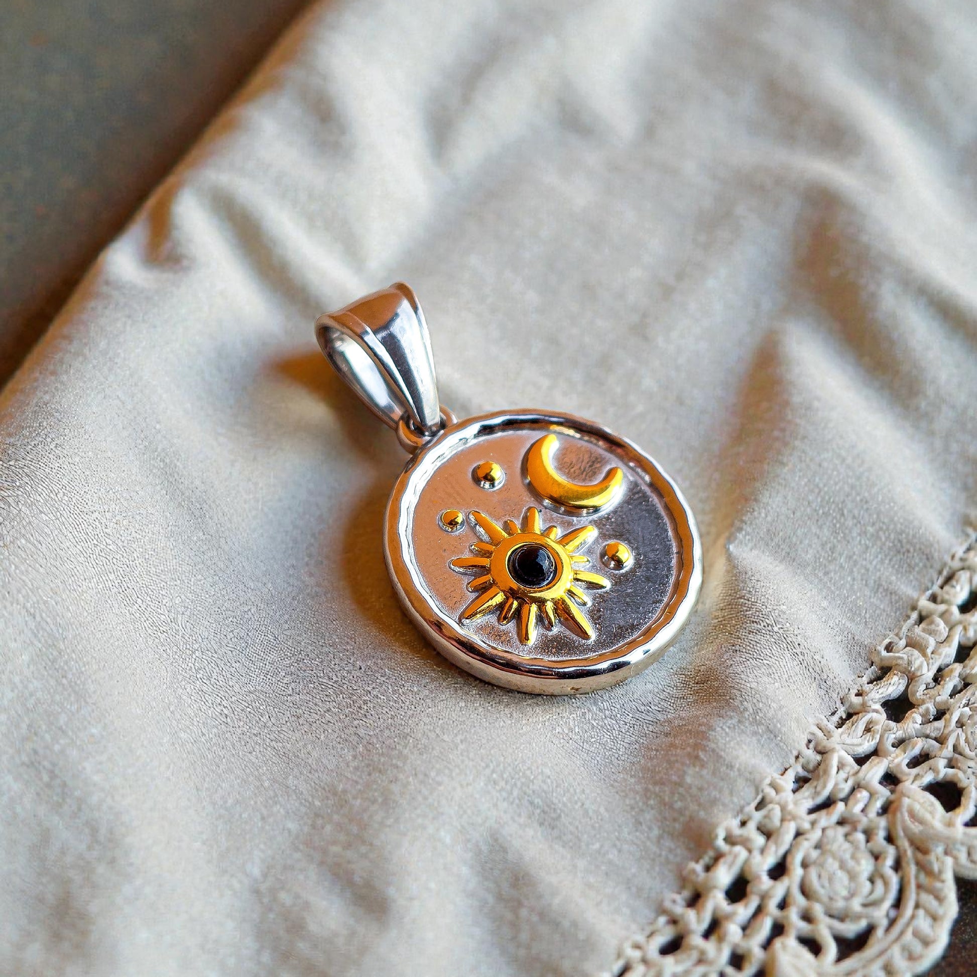 Ciondolo circolare in acciaio 316L galvanizzato argento 925 e oro 18k e onice nera.