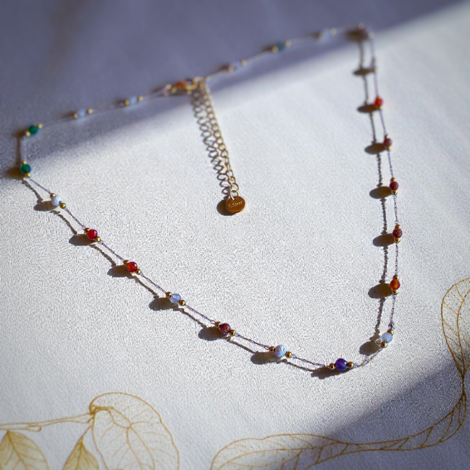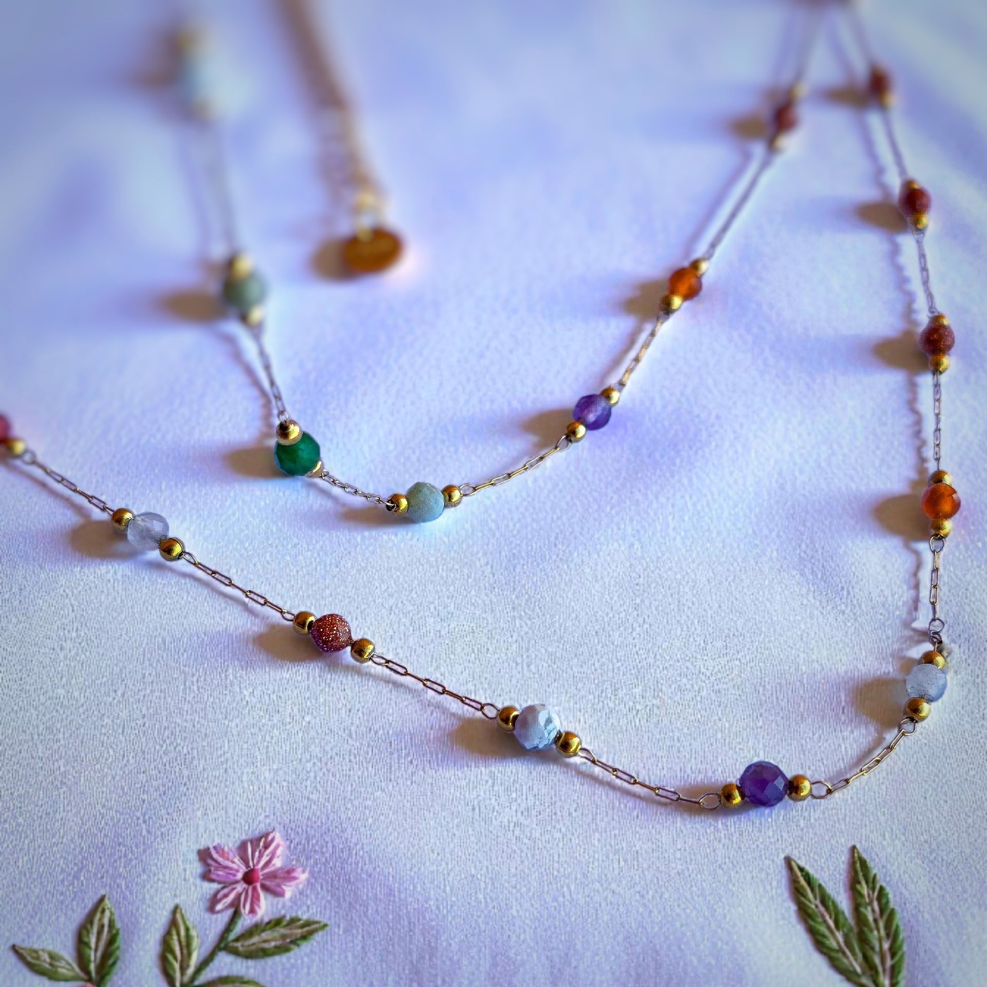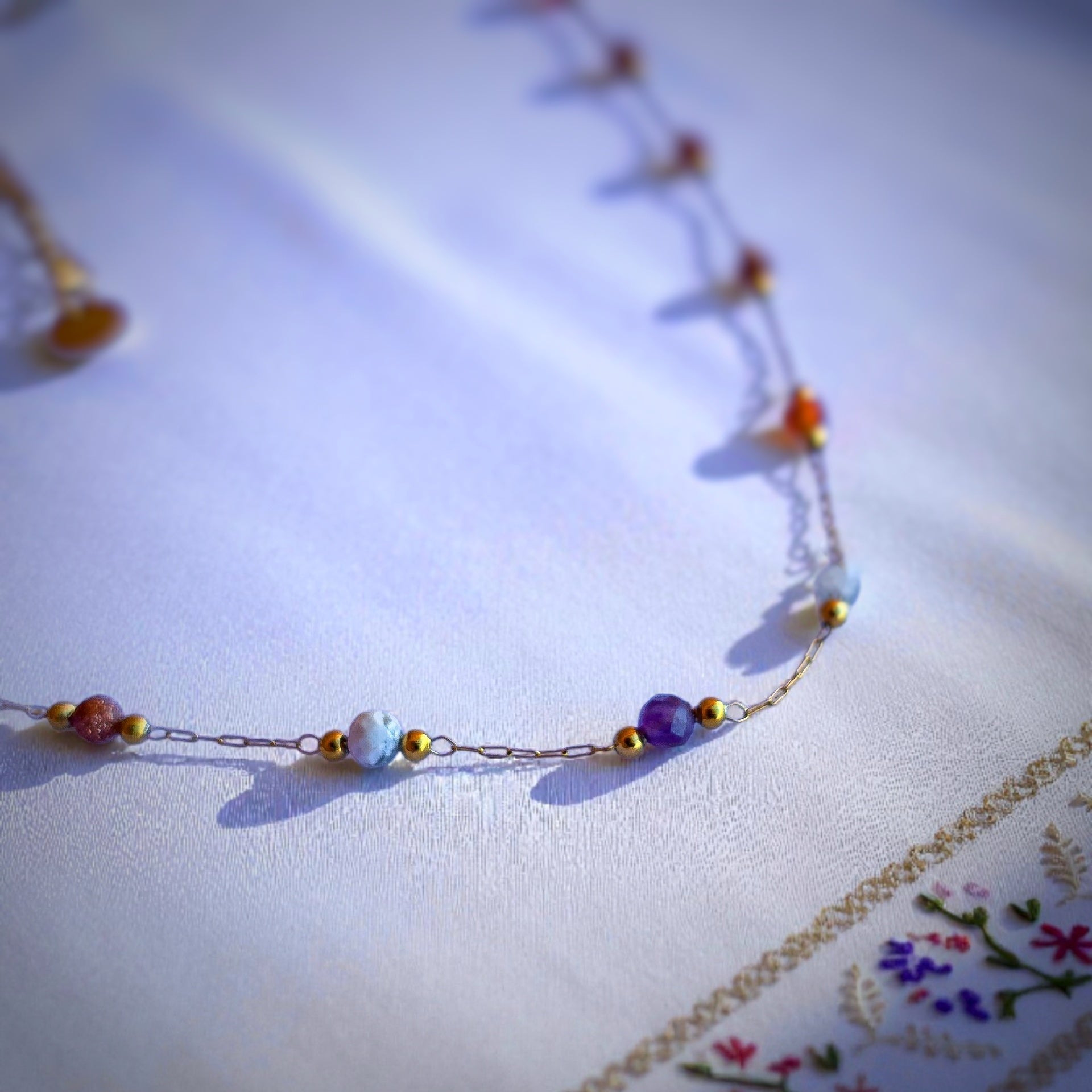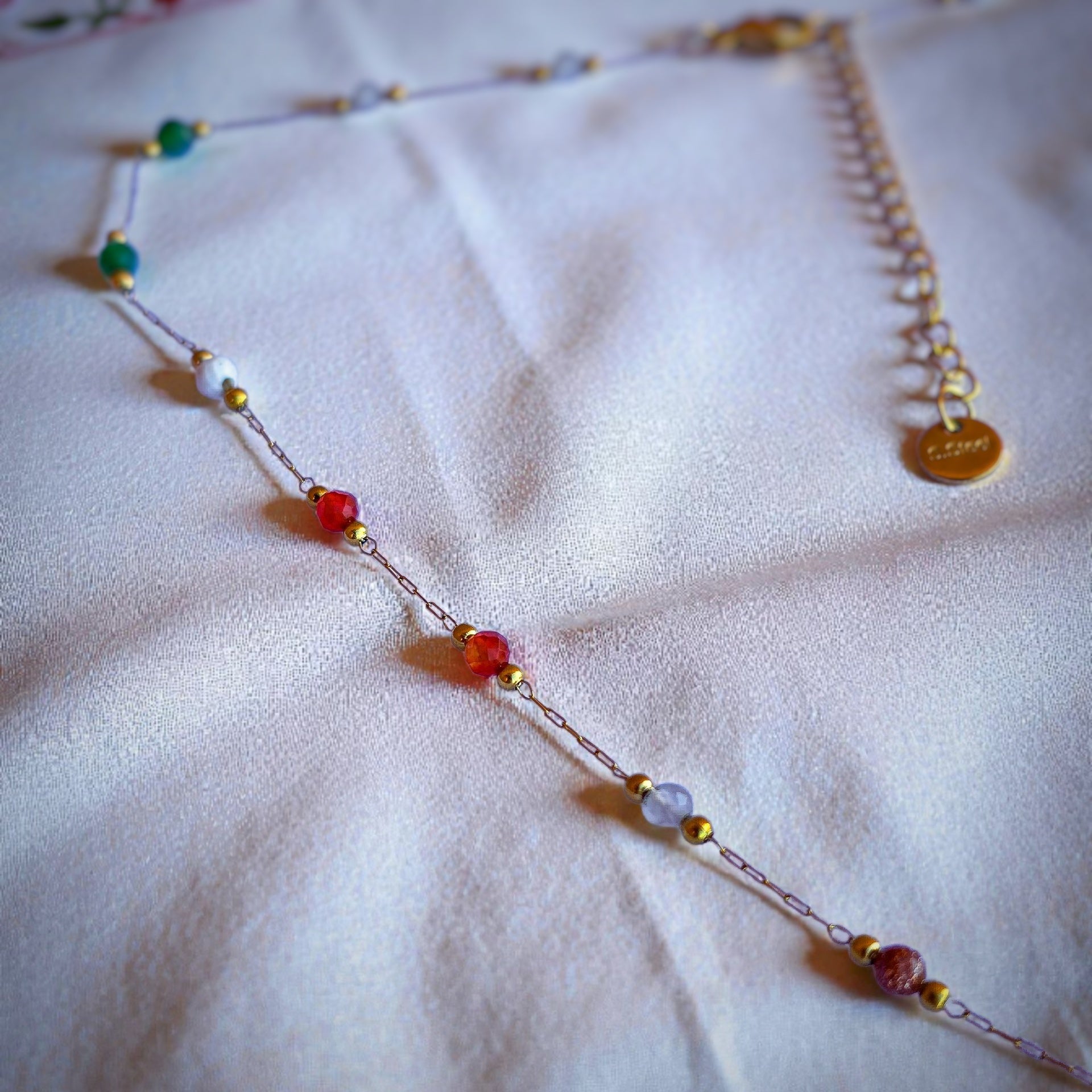 Girocollo realizzato a mano: una catenina finissima, minimale, in acciaio 316L galvanizzato oro 18k, è ritmata da piccole perline di pietre dure naturali sfaccettate, dai toni caldi: agate, eliolite, giada verdi, ametiste.