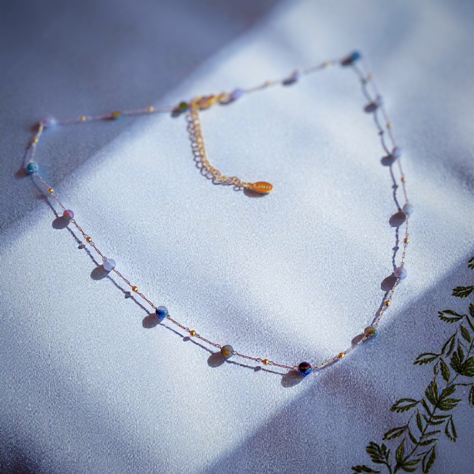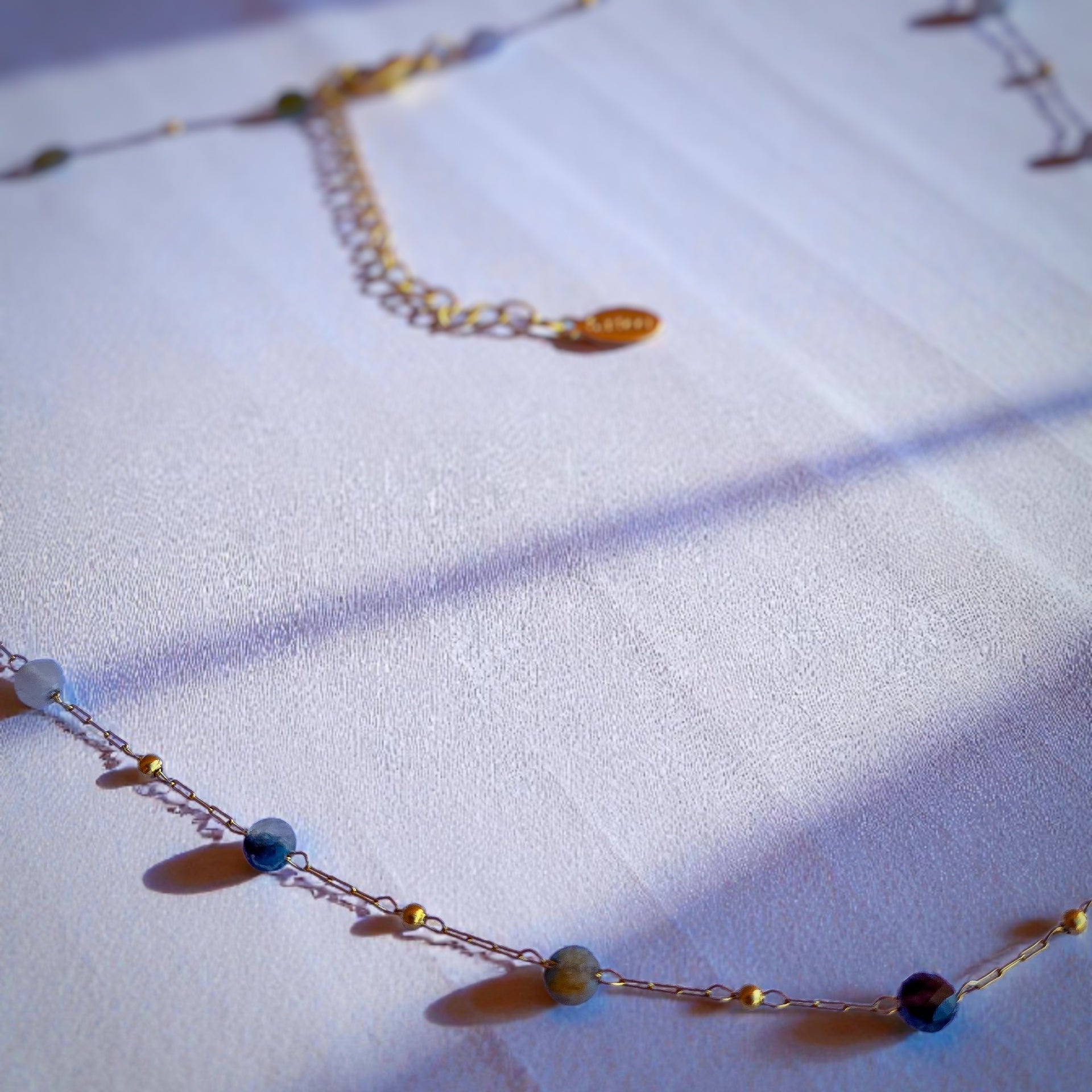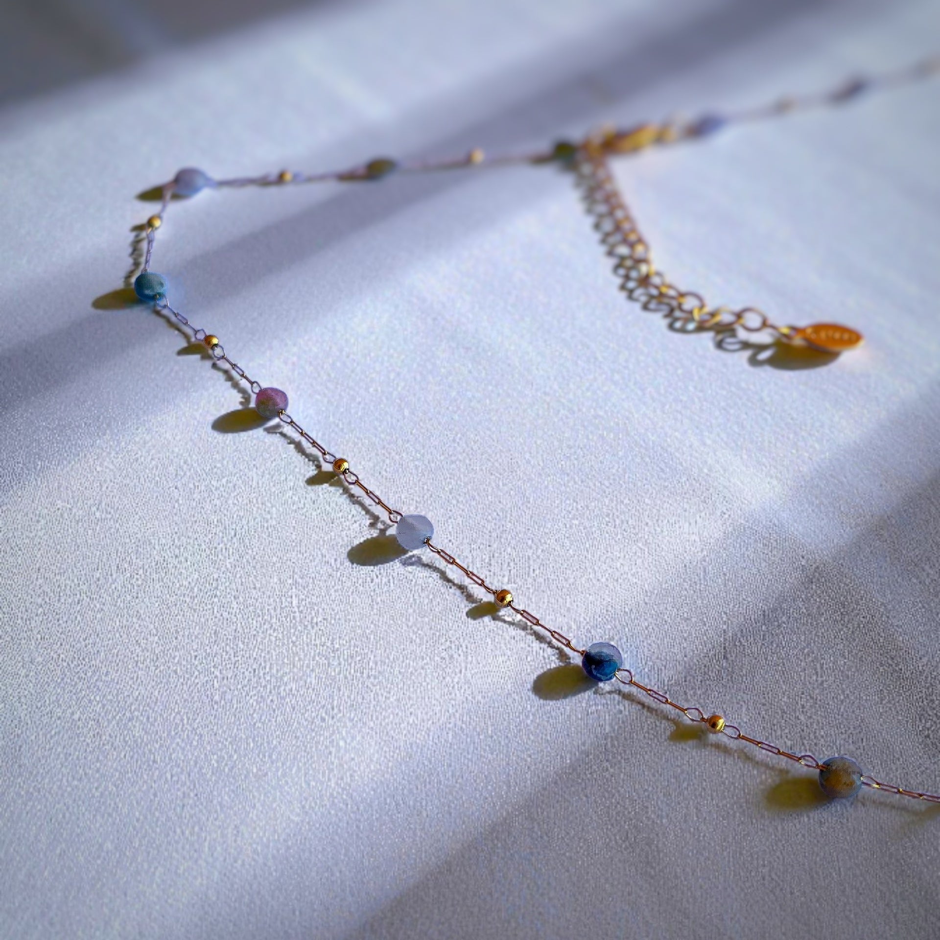 Girocollo realizzato a mano: una catenina finissima, minimale, in acciaio 316L galvanizzato oro 18k, è ritmata da piccole perline di pietre dure naturali sfaccettate, dai toni freddi: agate, unakite, diaspri azzurri, quarzi rosa.