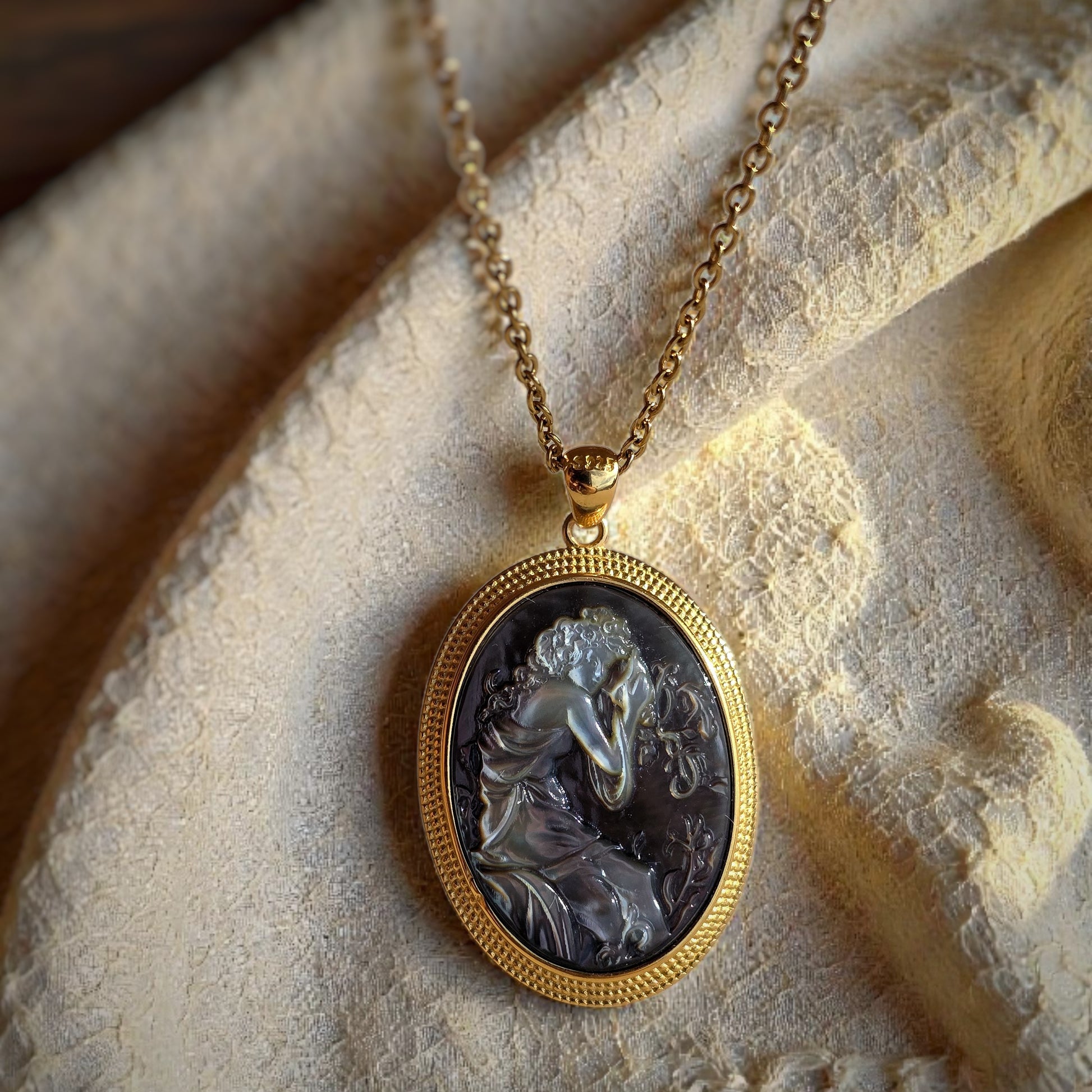 Girocollo con veneziana finissima e leggermente ritòrta a spirale con pendente cammeo in madreperla nera, cassato su montatura in filigrana argento 925 galvanizzato oro 24k.