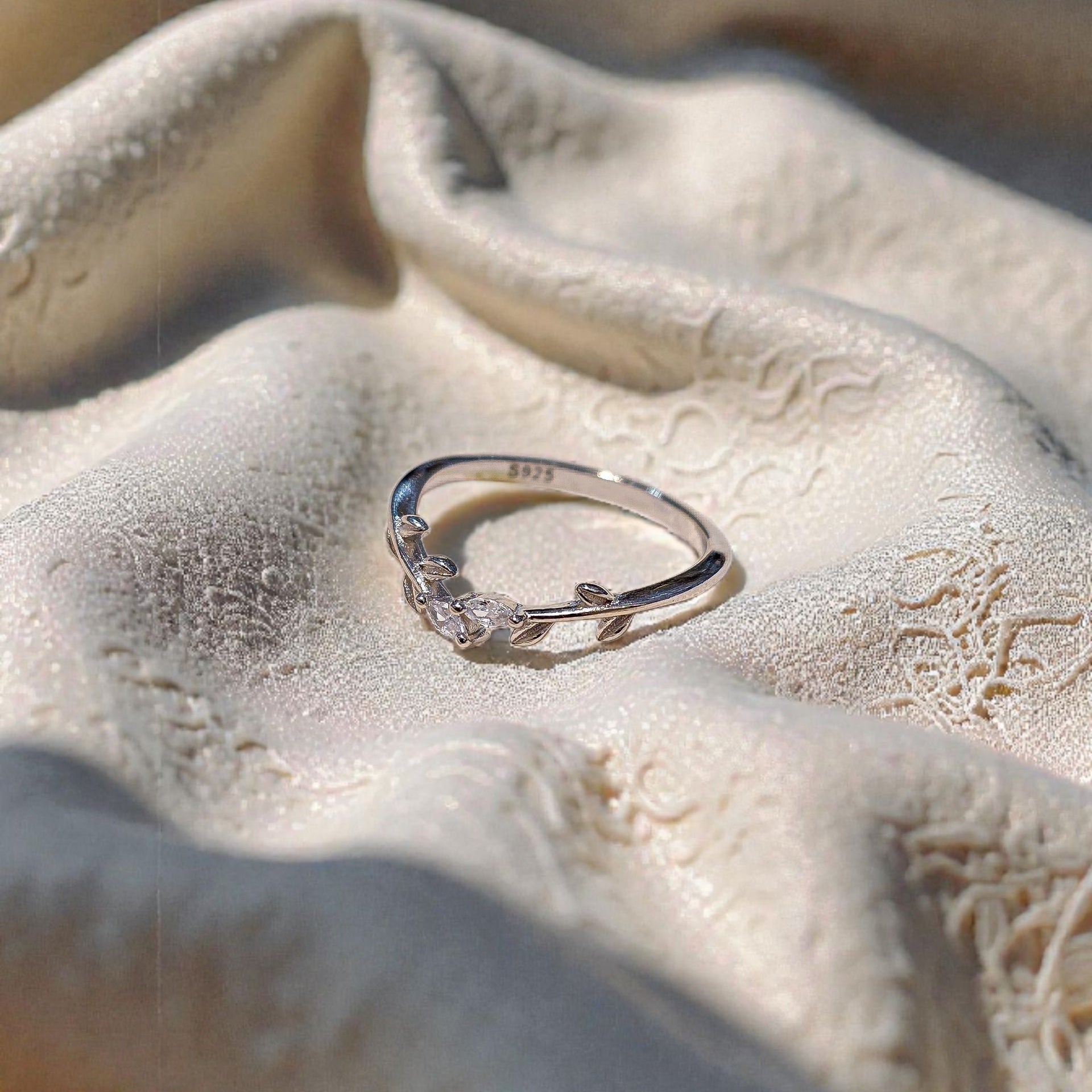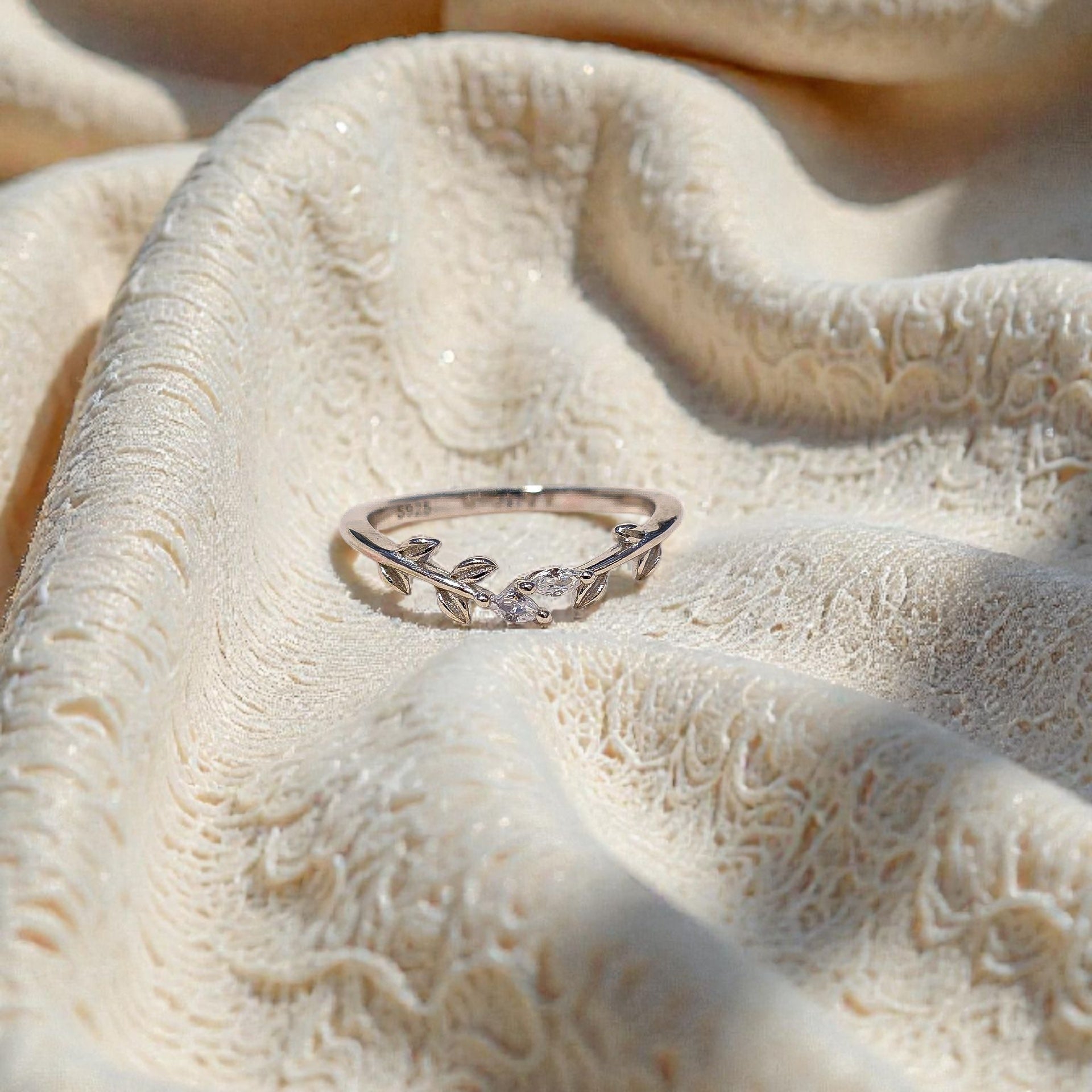 Zaffiri bianchi sulle estreme foglioline di alloro: una fedina elegantissima, stile art decò.
