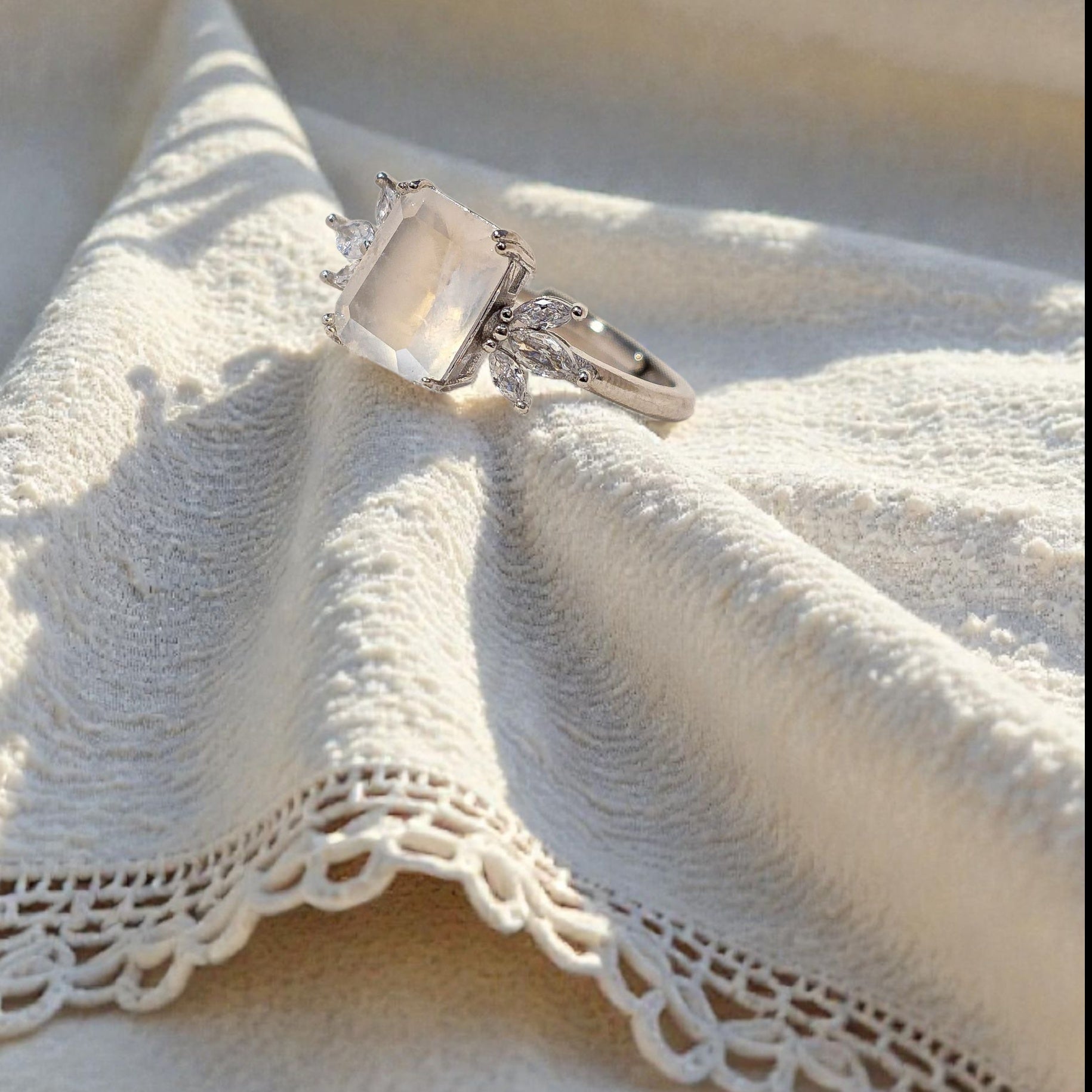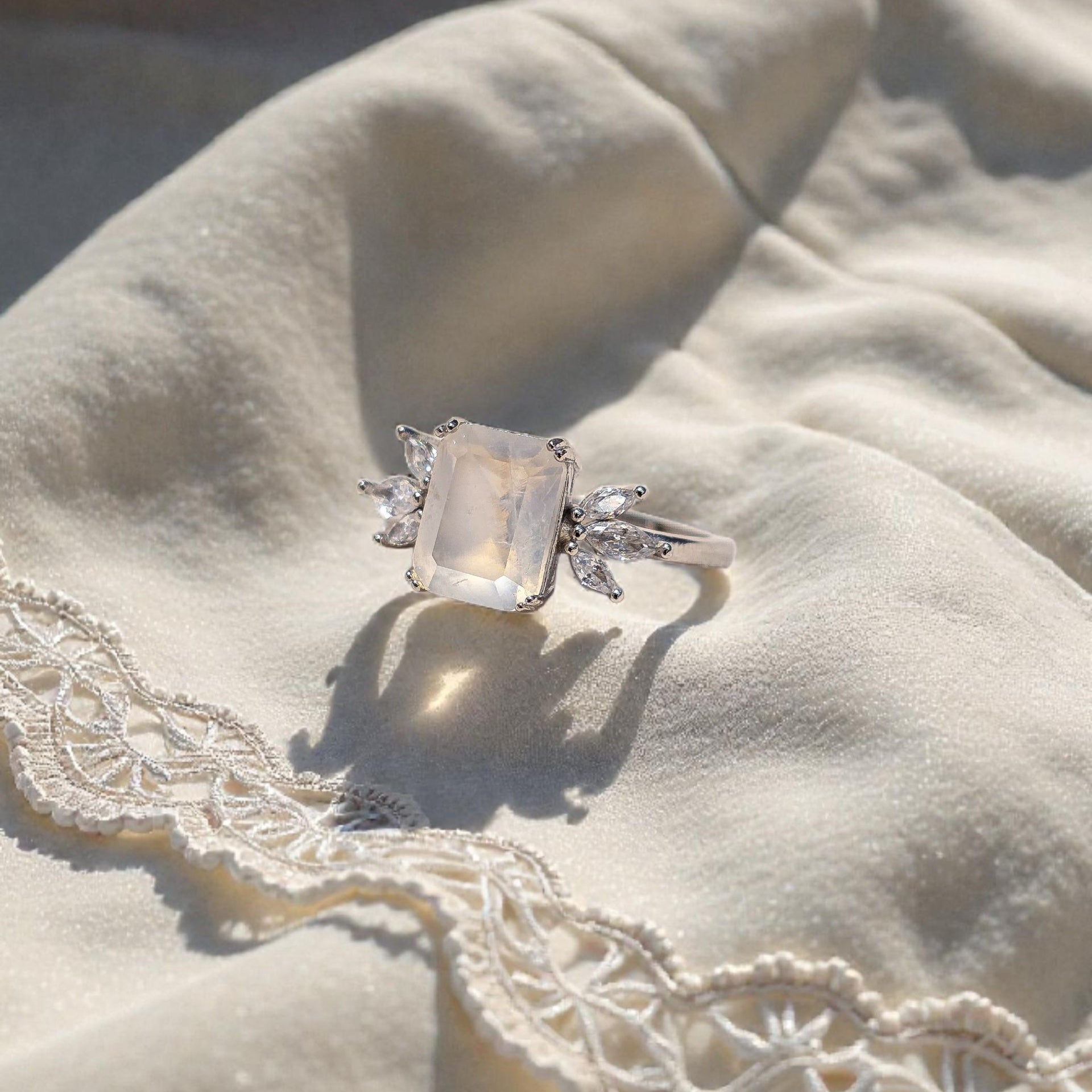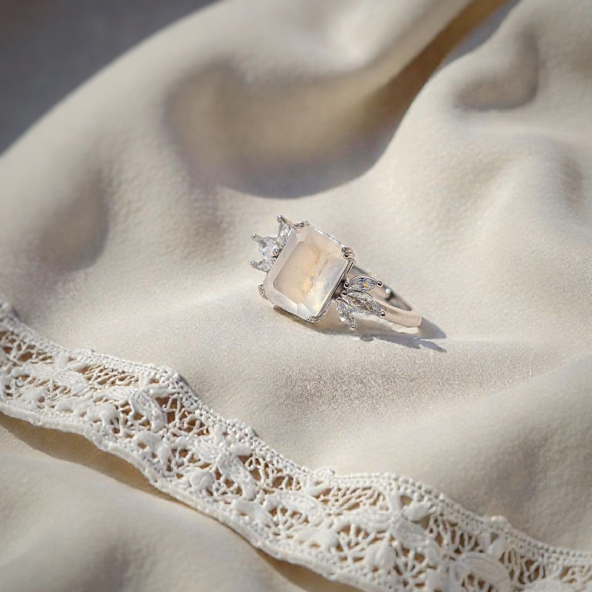 Pietra di luna e zaffiri bianchi su una elegantissima montatura in stile art decò.