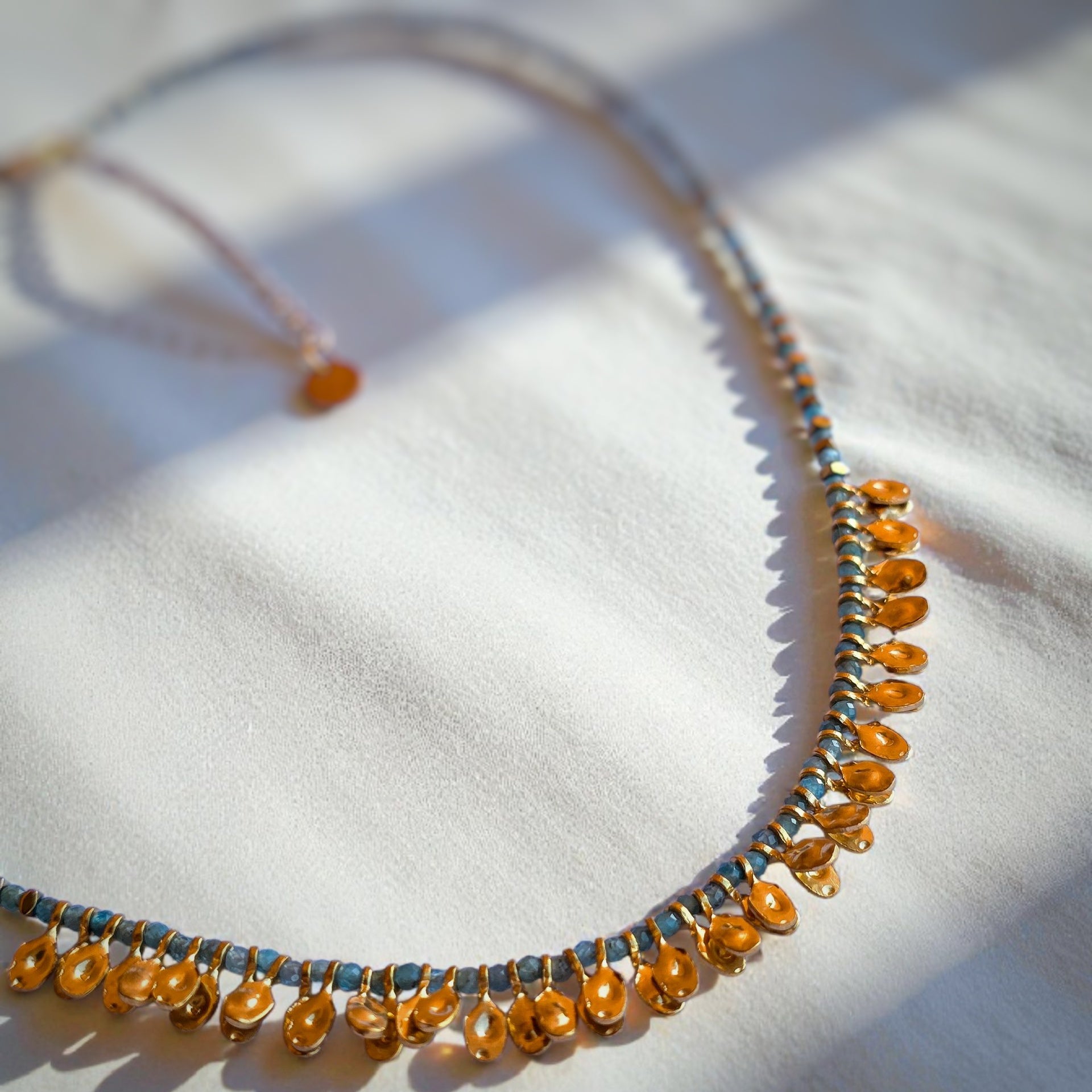 Nella parte centrale, impreziosiscono il girocollo, piccole placchette martellate in acciaio, sempre galvanizzato oro.