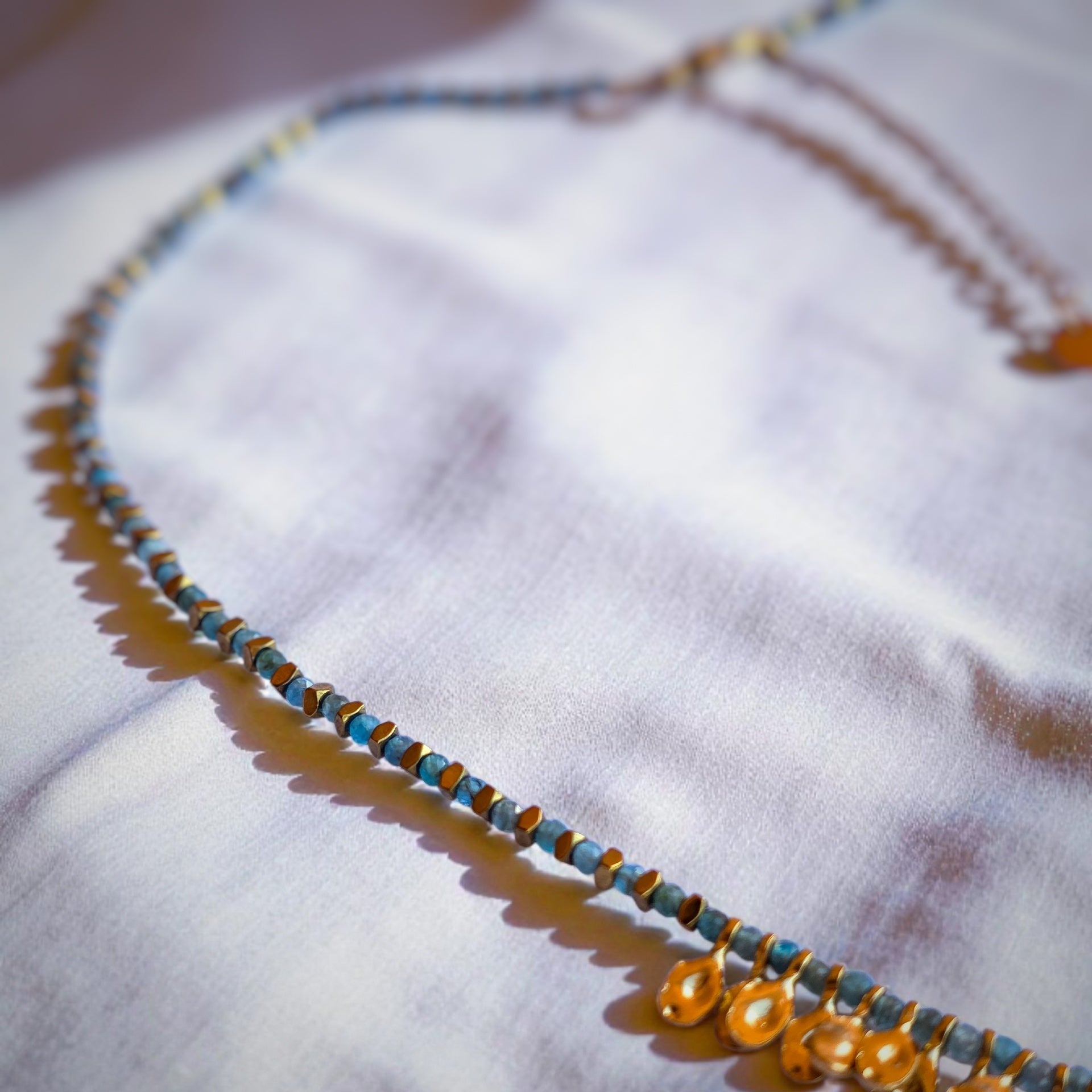 Girocollo realizzato interamente a mano con microperline di unakite dal taglio sfaccettato, inframmezzate da perline in acciaio placcato oro.
