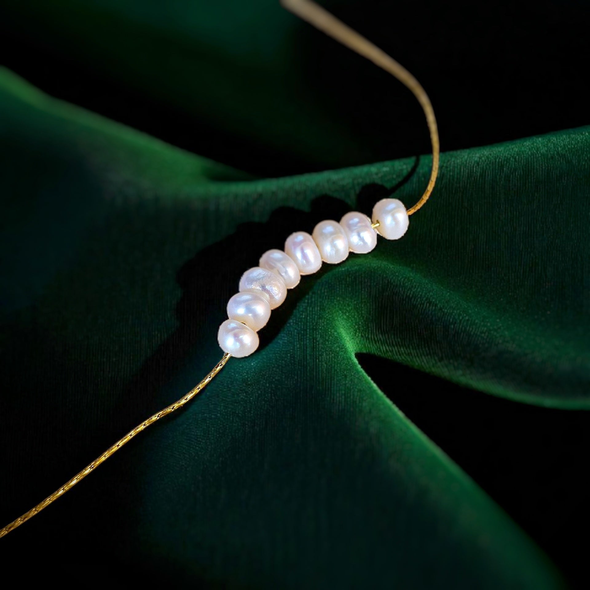 Su un sottilissimo filo d'acciaio chirurgico 316L placcato oro 18k, scorrono piccole perle di fiume.