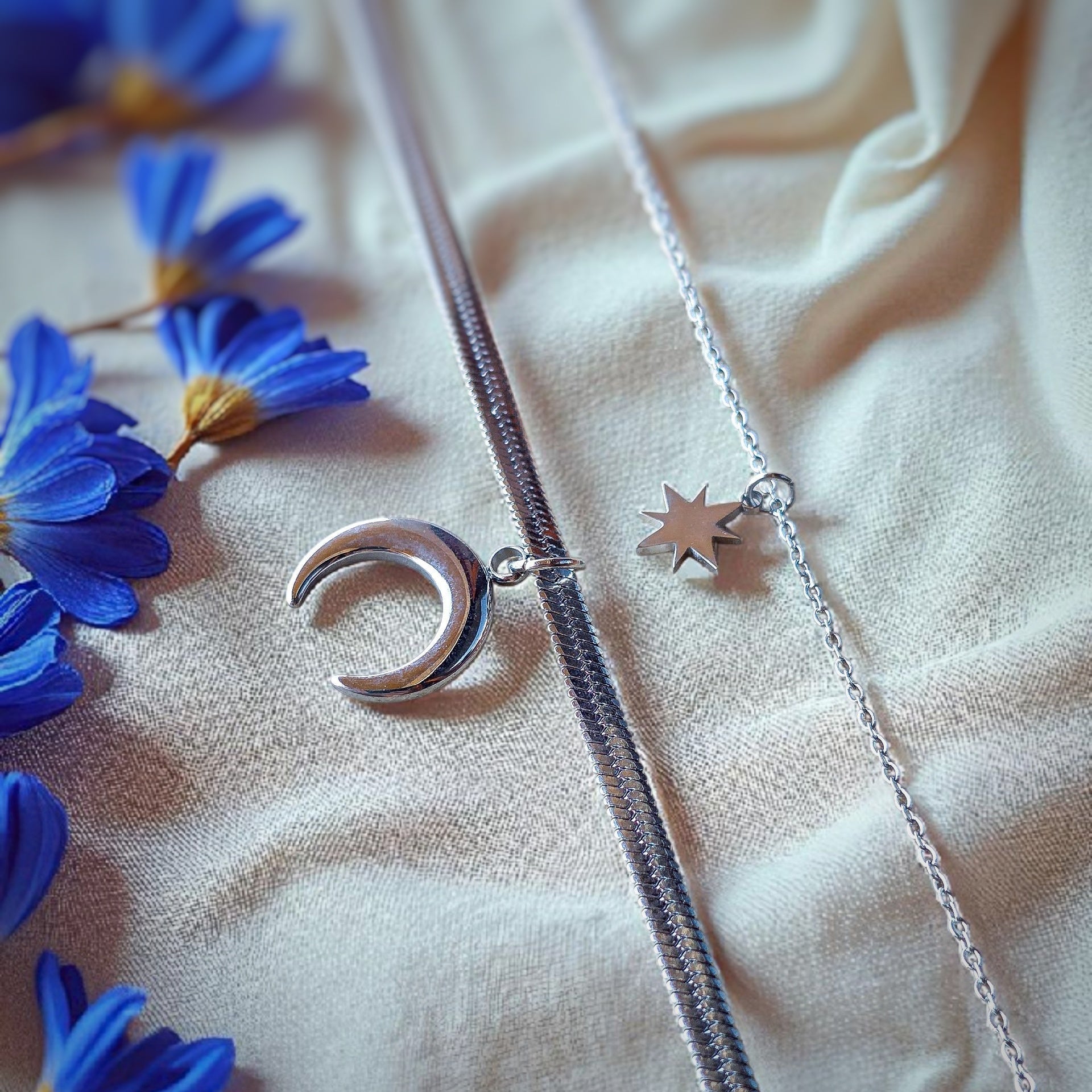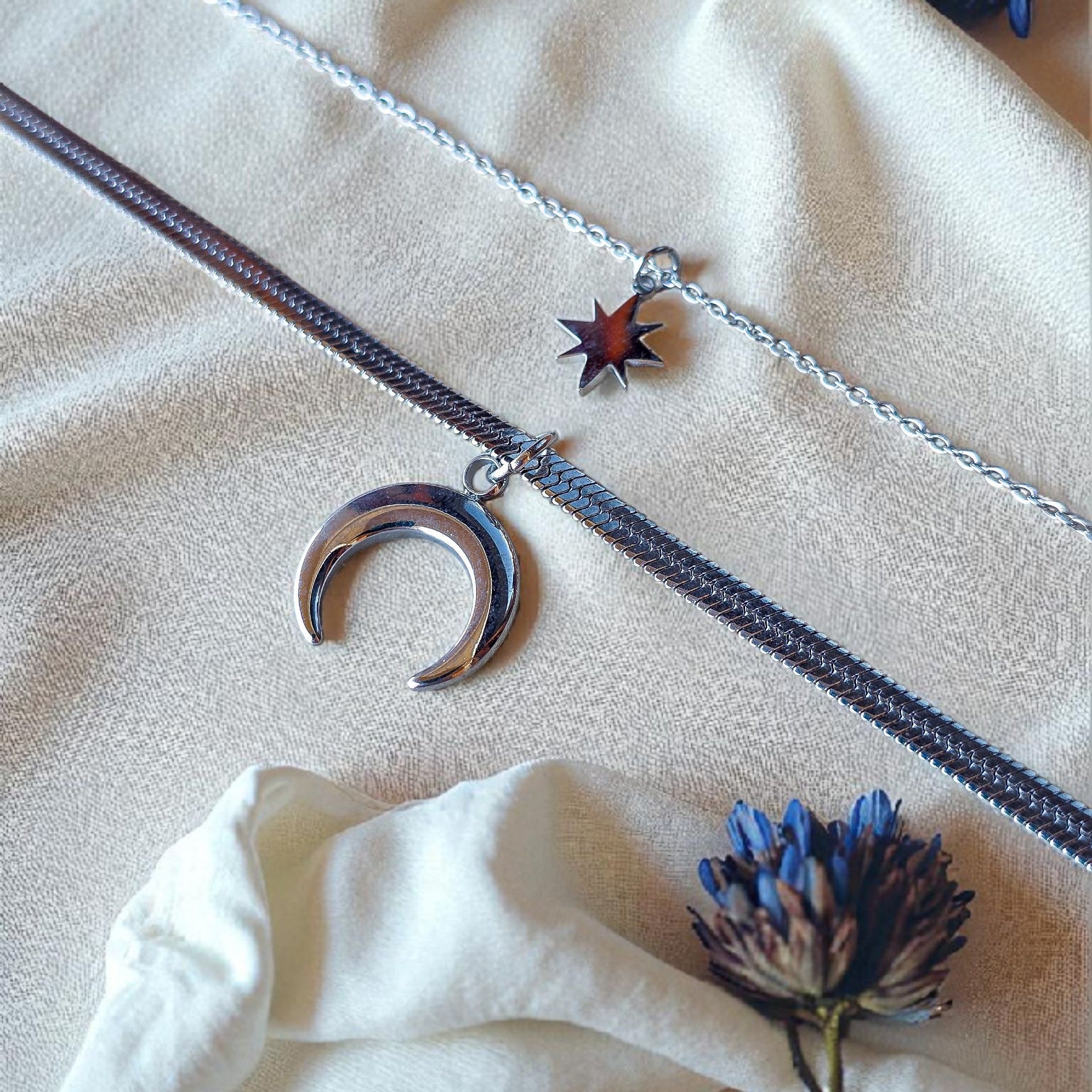 Girocollo doppio (indivisibile) a maglia snake e veneziana in acciaio 316L placcato argento 925 con pendenti: stellina del mattino e lunula calante.