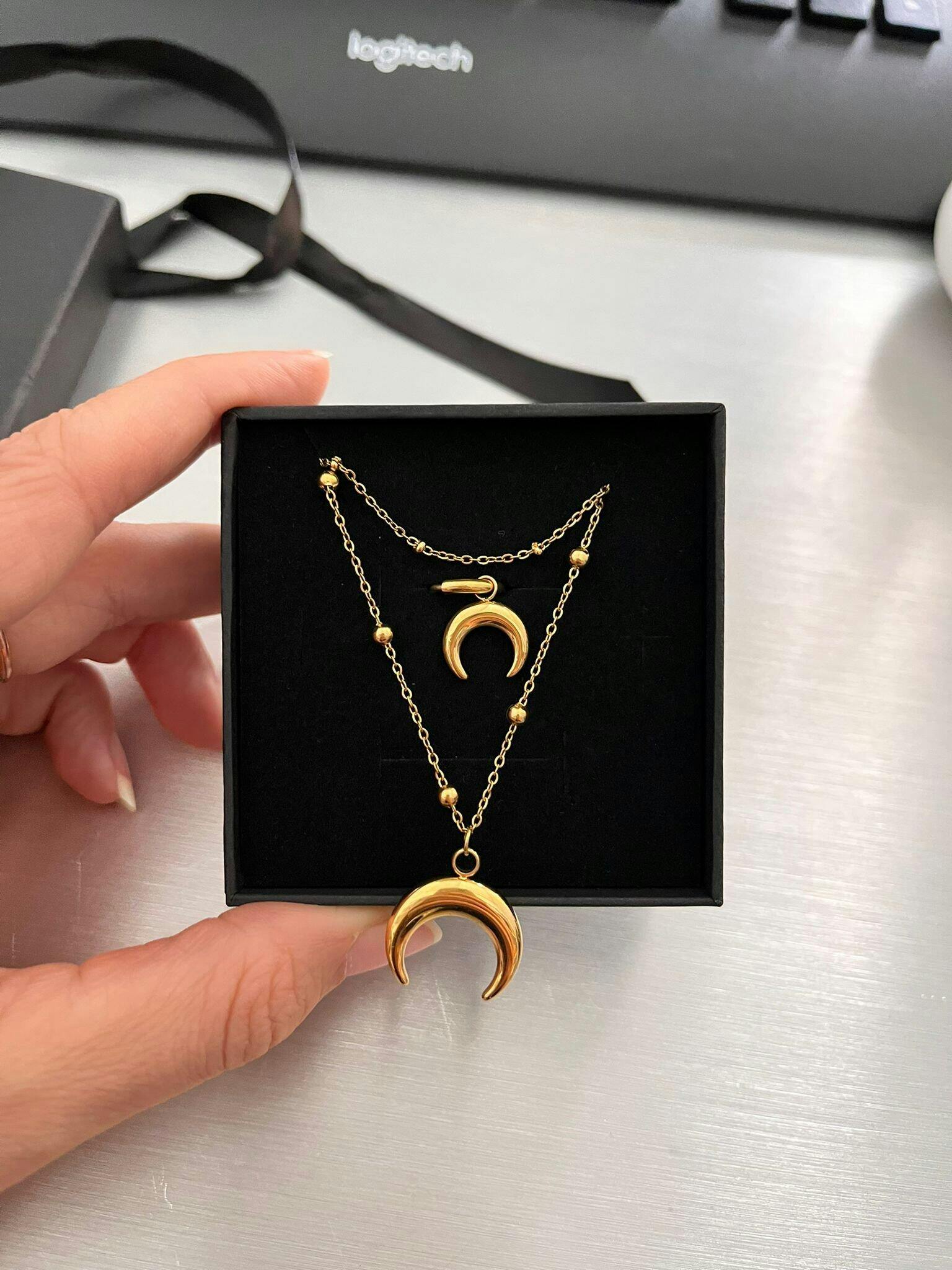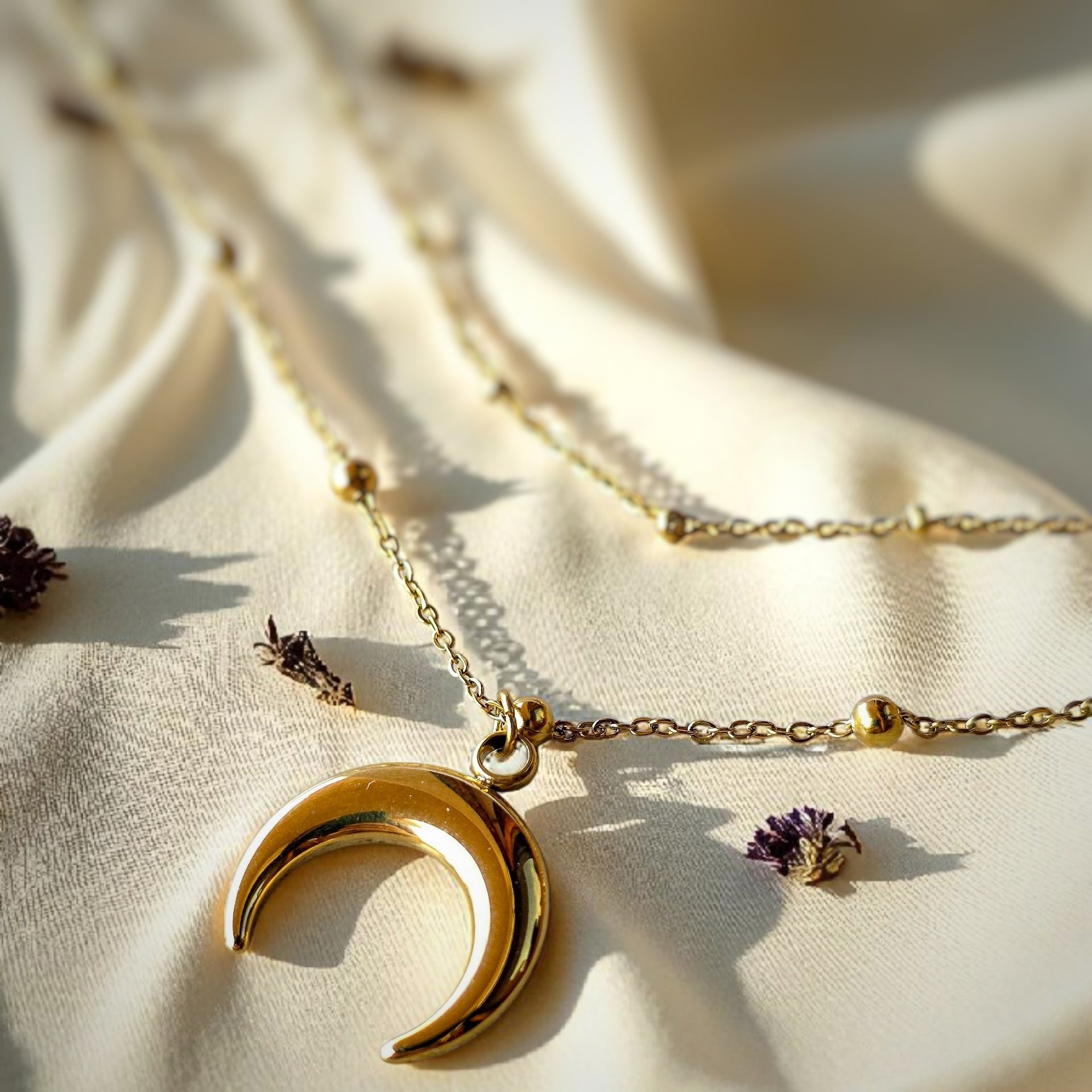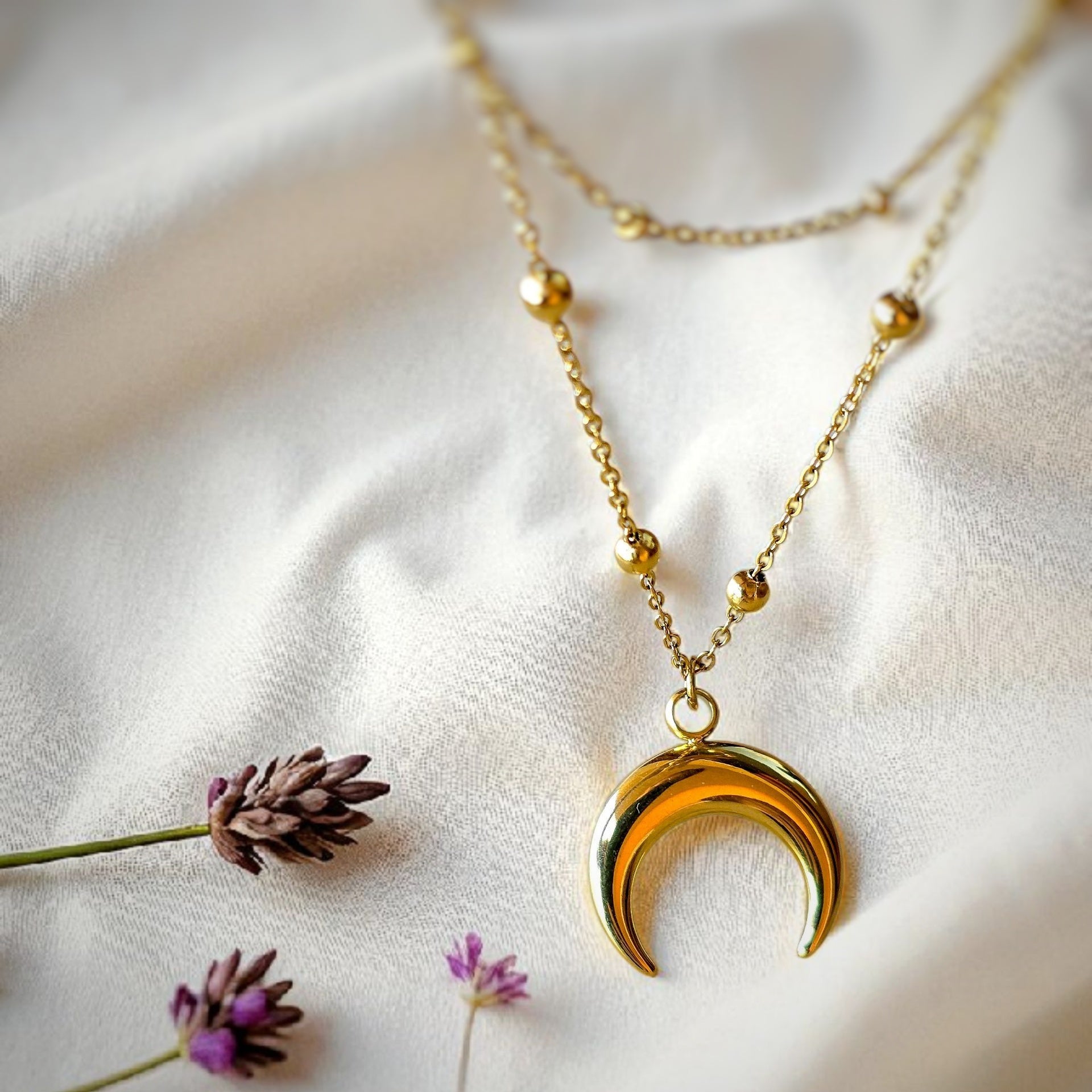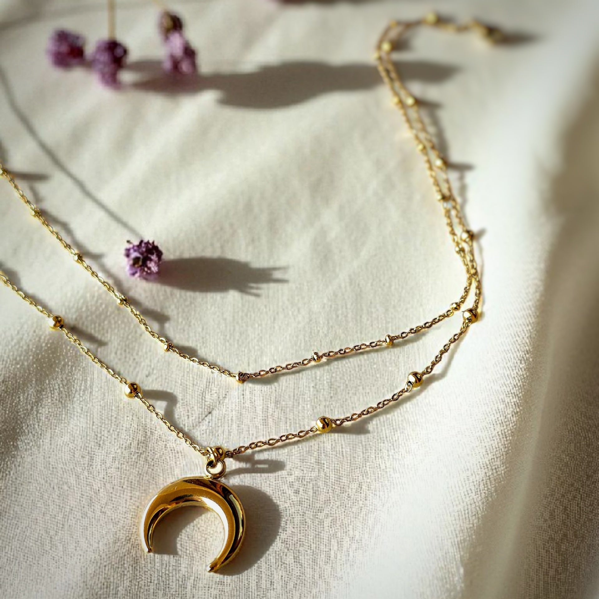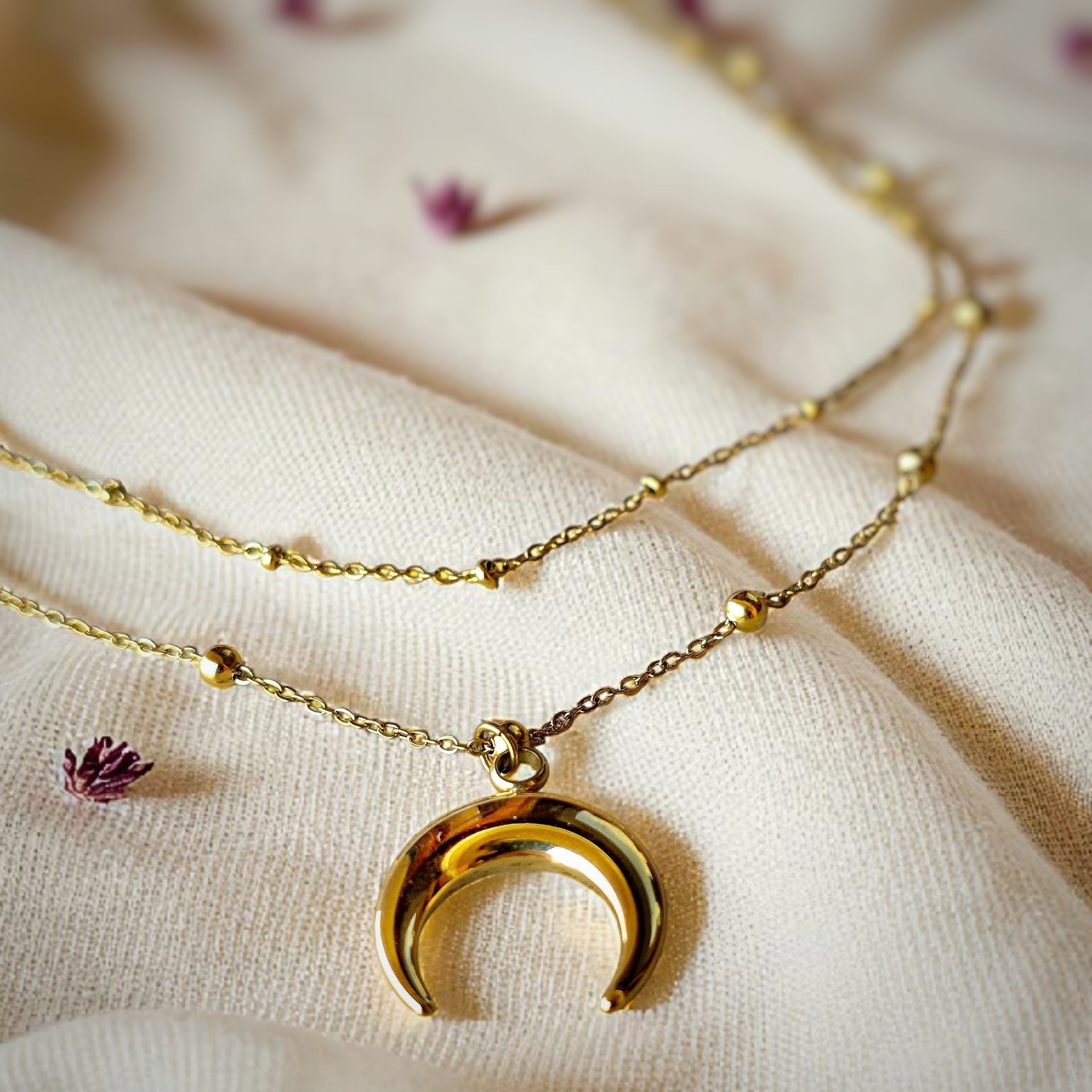 Girocollo doppio a maglia rosario e microosario più piccolo in acciaio 316L placcato oro 18k con pendente a forma di lunula calante, portatrice dell'ultima luce della sera, ergo rappresenta le promesse che si rinnovano di giorno in giorno per un nuovo inizio.
