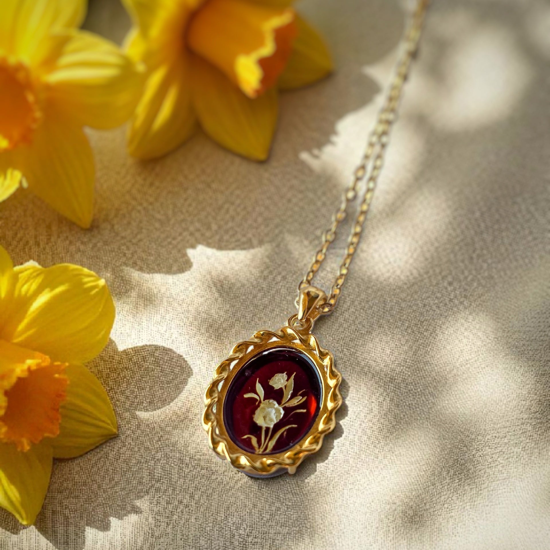L'ambra naturale, di colore bruno/ramato, viene forata sul retro e pian piano scolpita direttamente dall'interno: emerge progressivamente il profilo del fiore petalo dopo petalo, di colore biancastro/giallino (corrisponde allo strato più interno dell'ambra). La piccola pietra ovale è successivamente incastonata su una montatura in argento 925, galvanizzato oro 24k, aperta sul retro proprio per lasciar intravedere la bellezza del lavoro di microscultura.