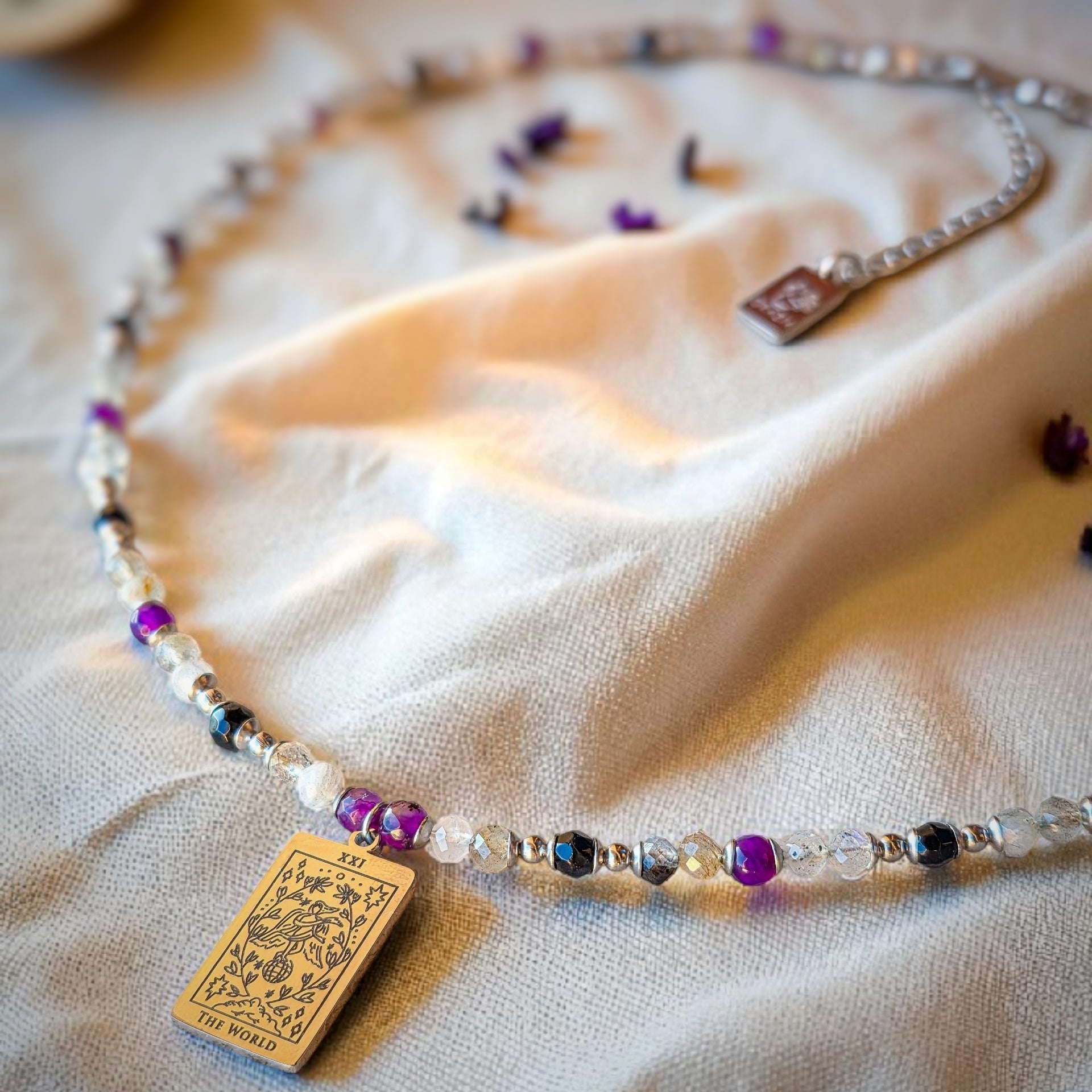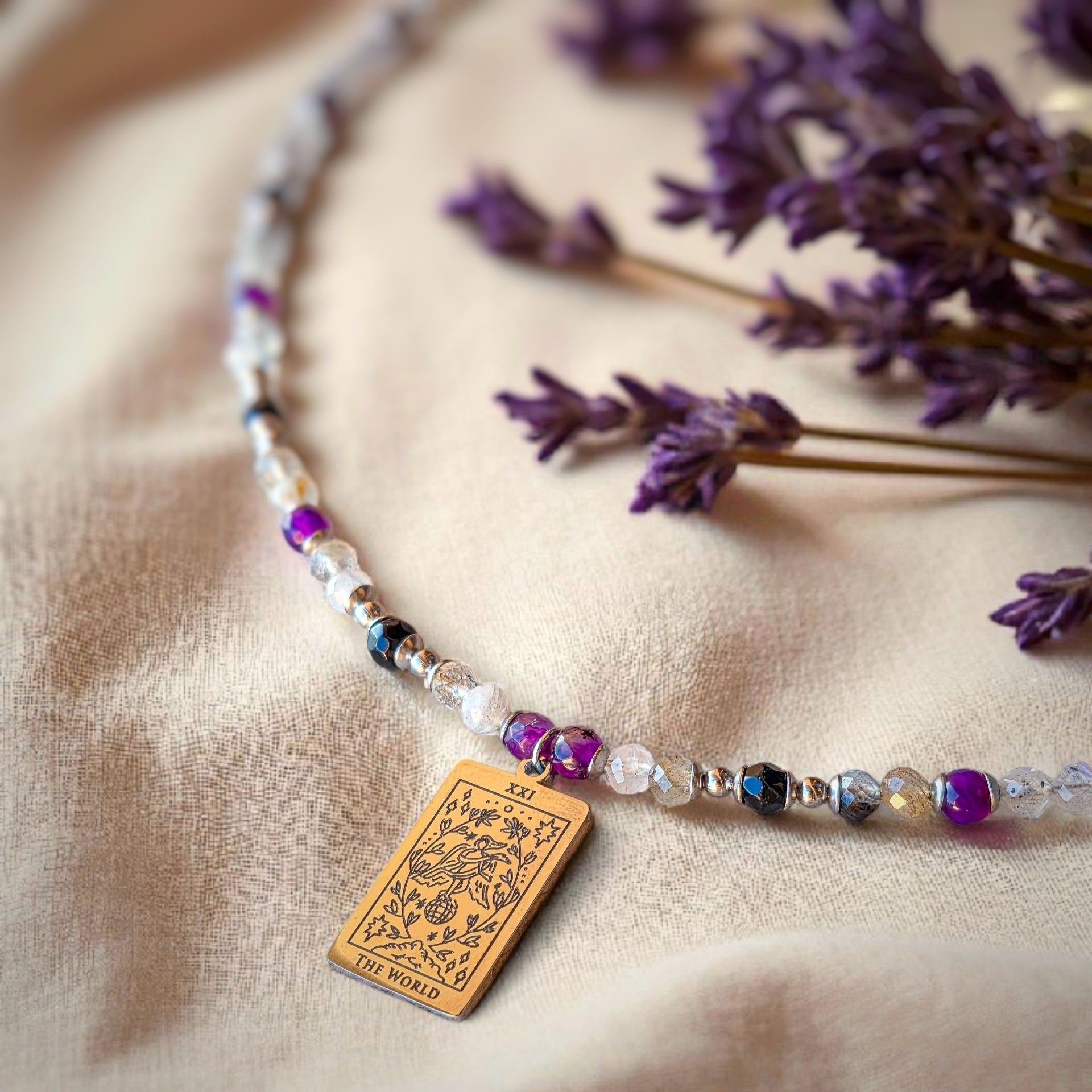 Ametista, quarzo ialino e onice nera sfaccettate, inframmezzate da ematite argento incorniciano il pendente centrale: il tarocco Sketched del Mondo.