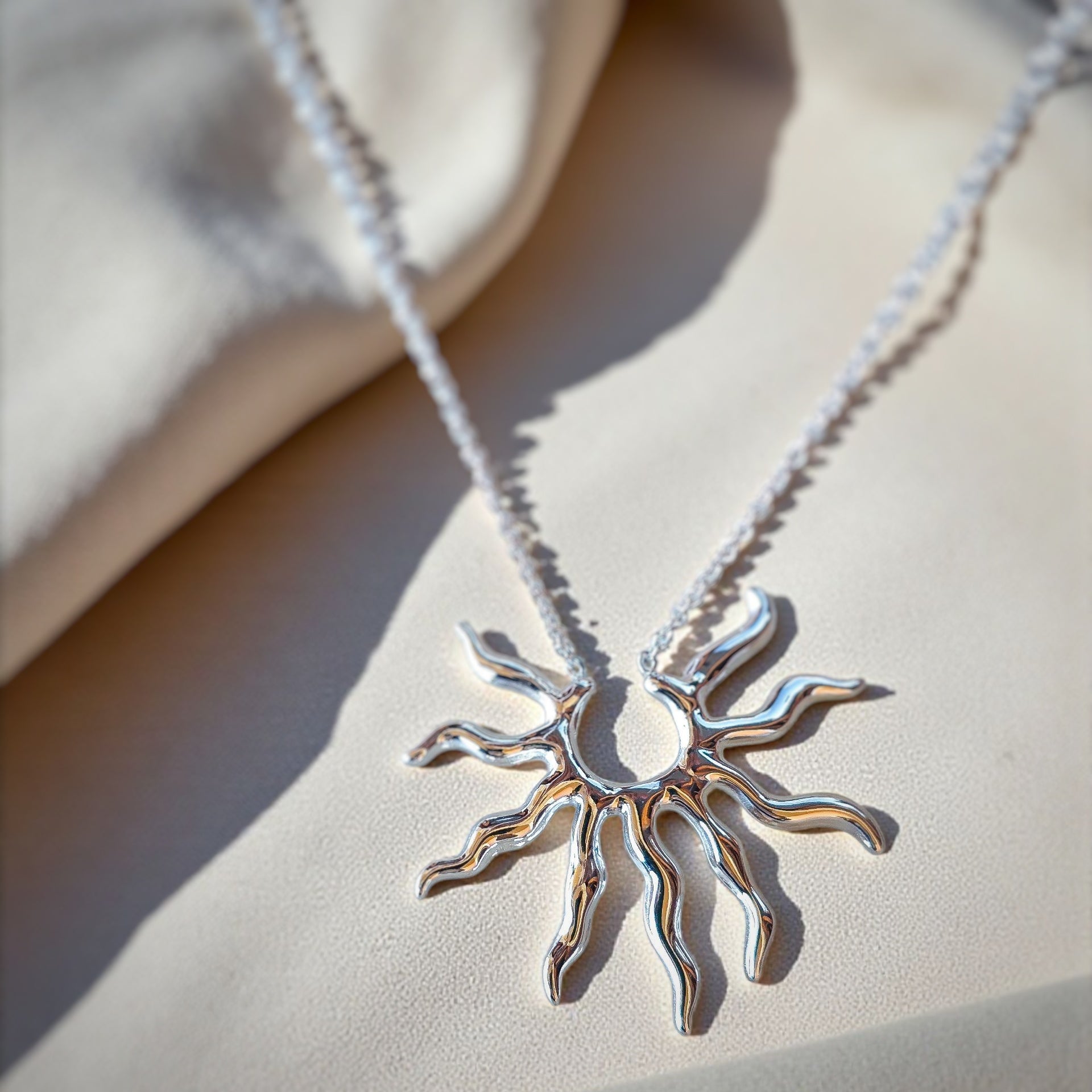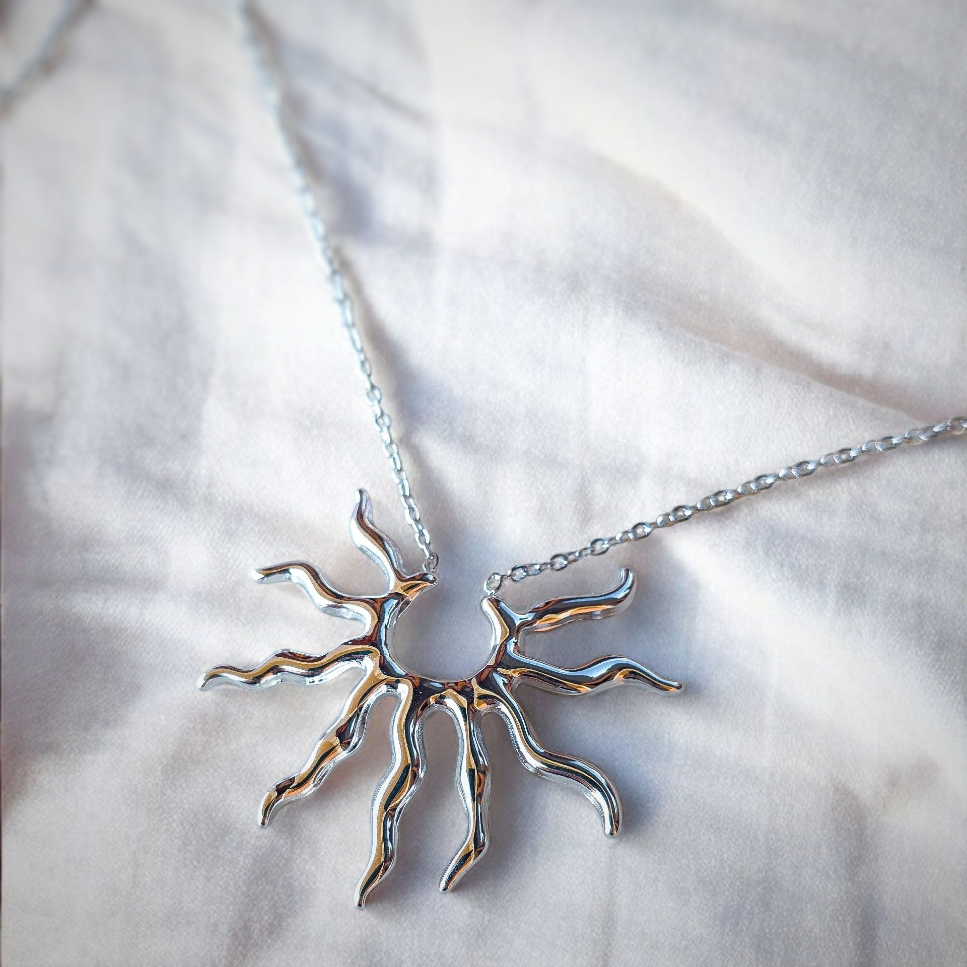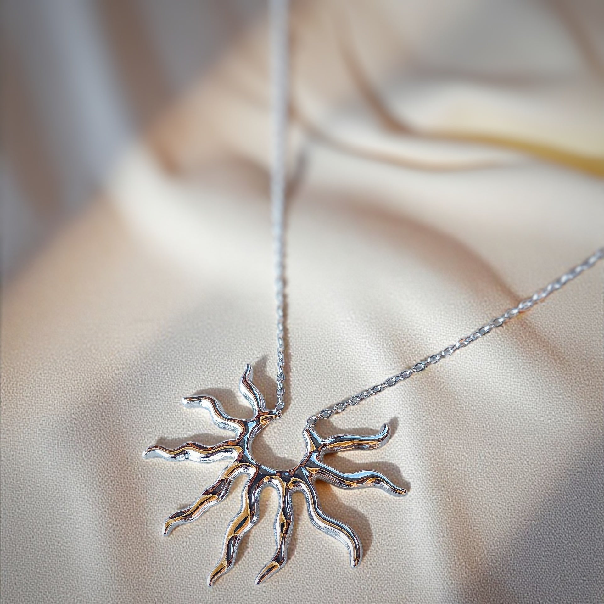 Il centro del girocollo sviluppa un Sole raggiante, appena accennato e dalla forma semicircolare.