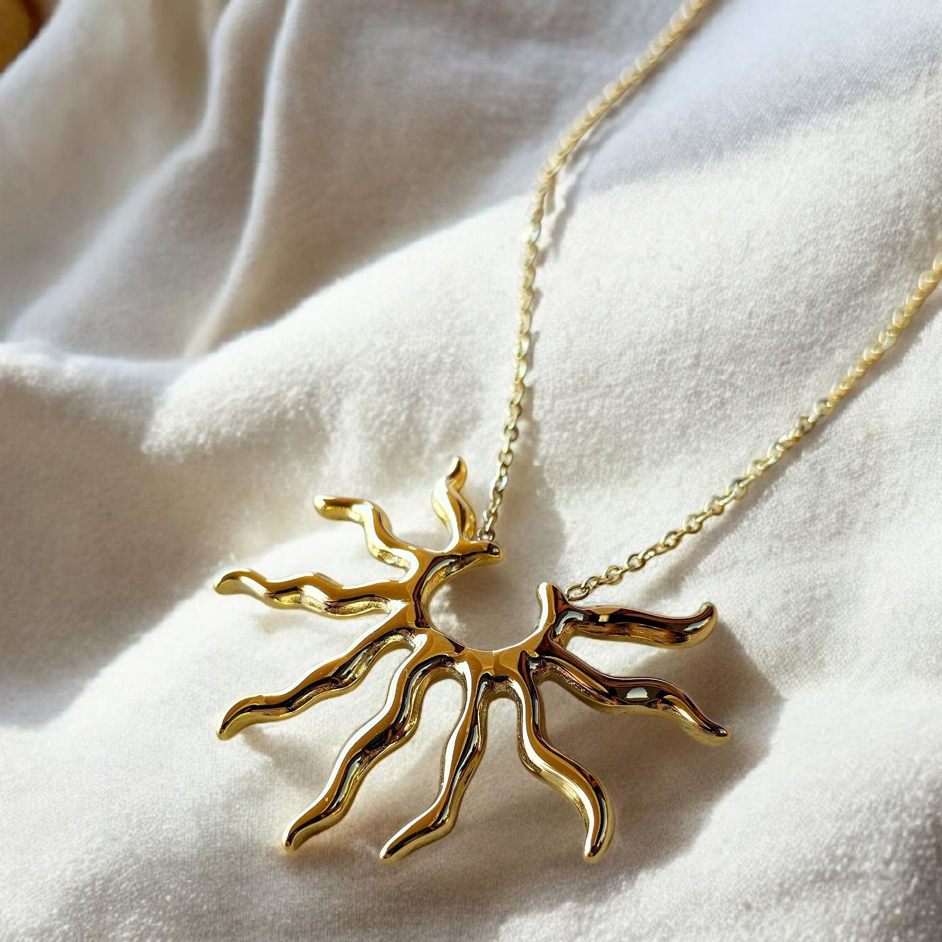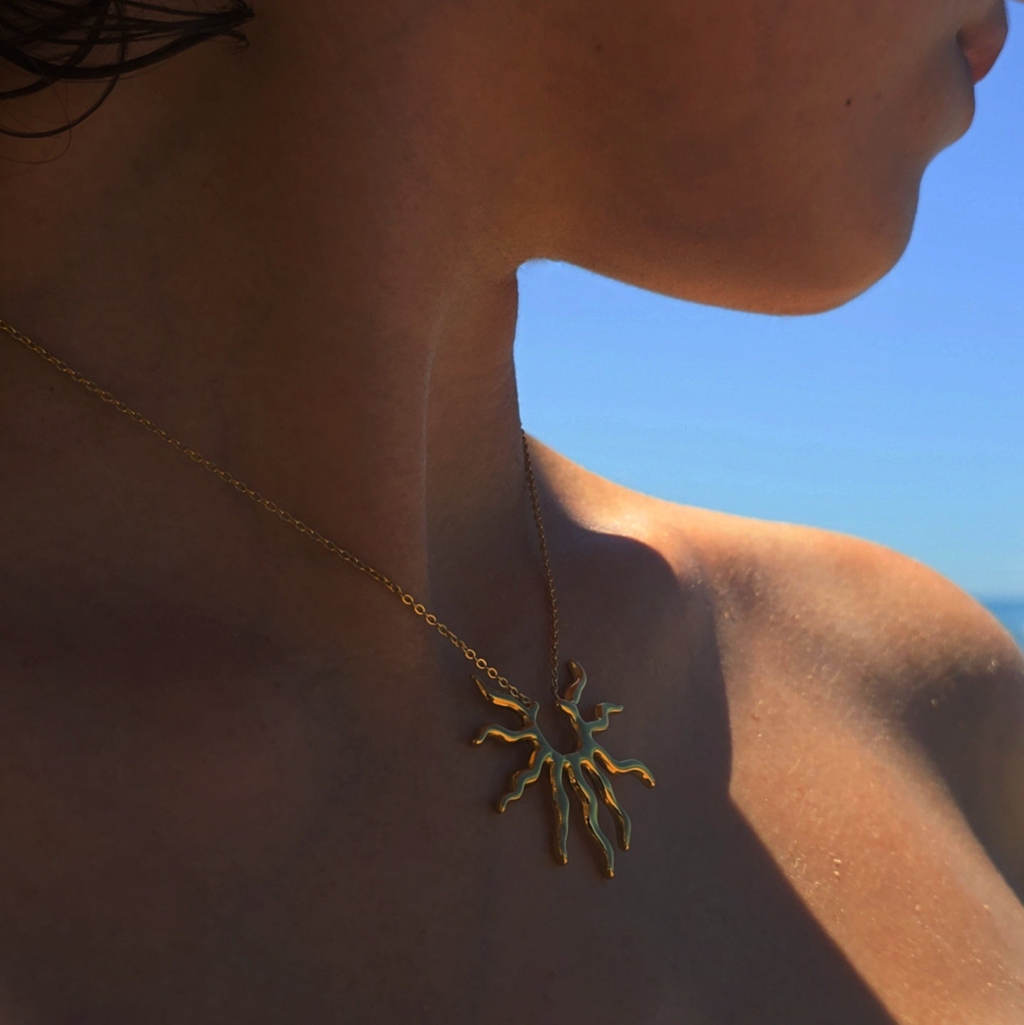 Il centro del girocollo sviluppa un Sole raggiante, appena accennato e dalla forma semicircolare.