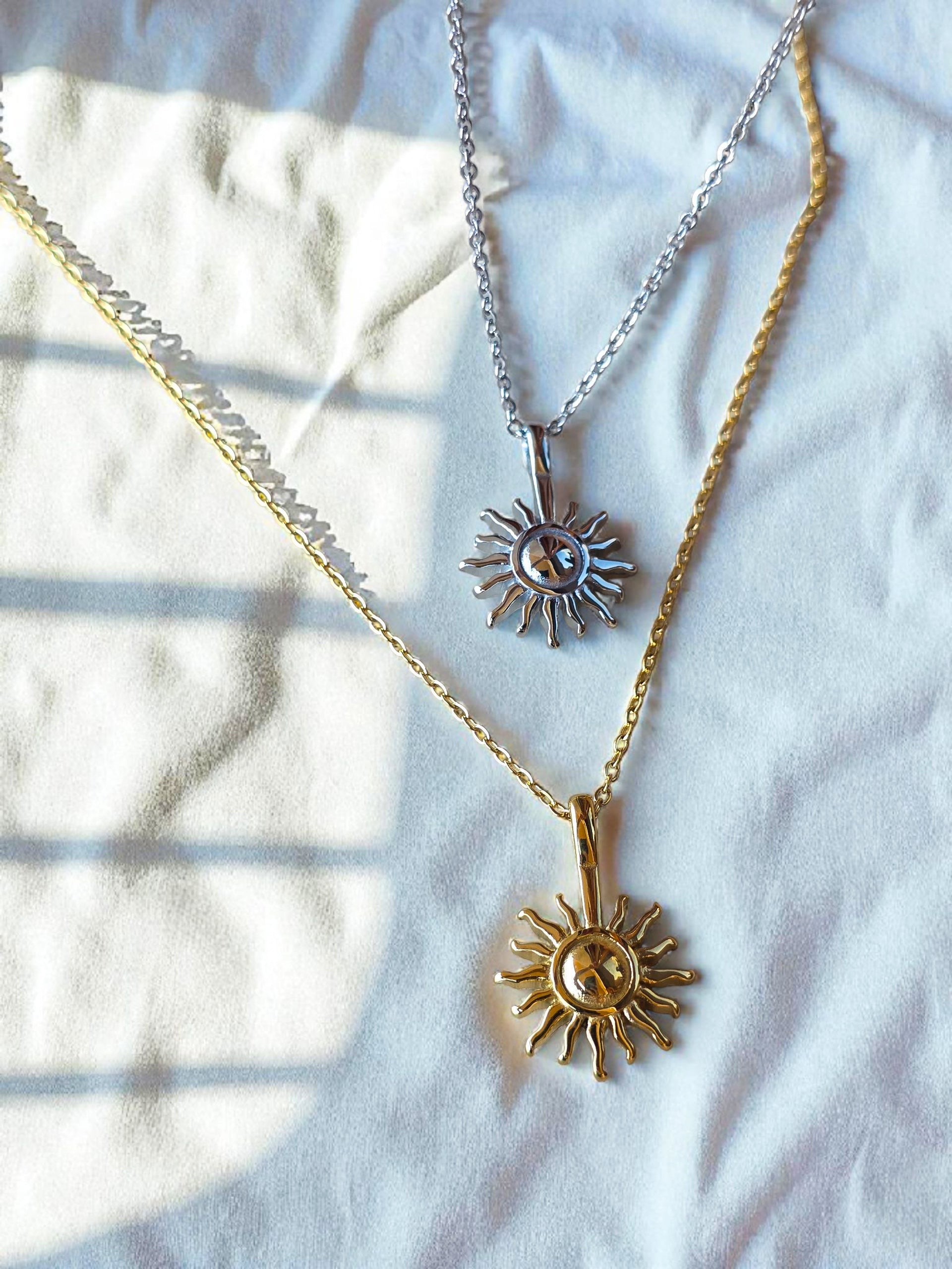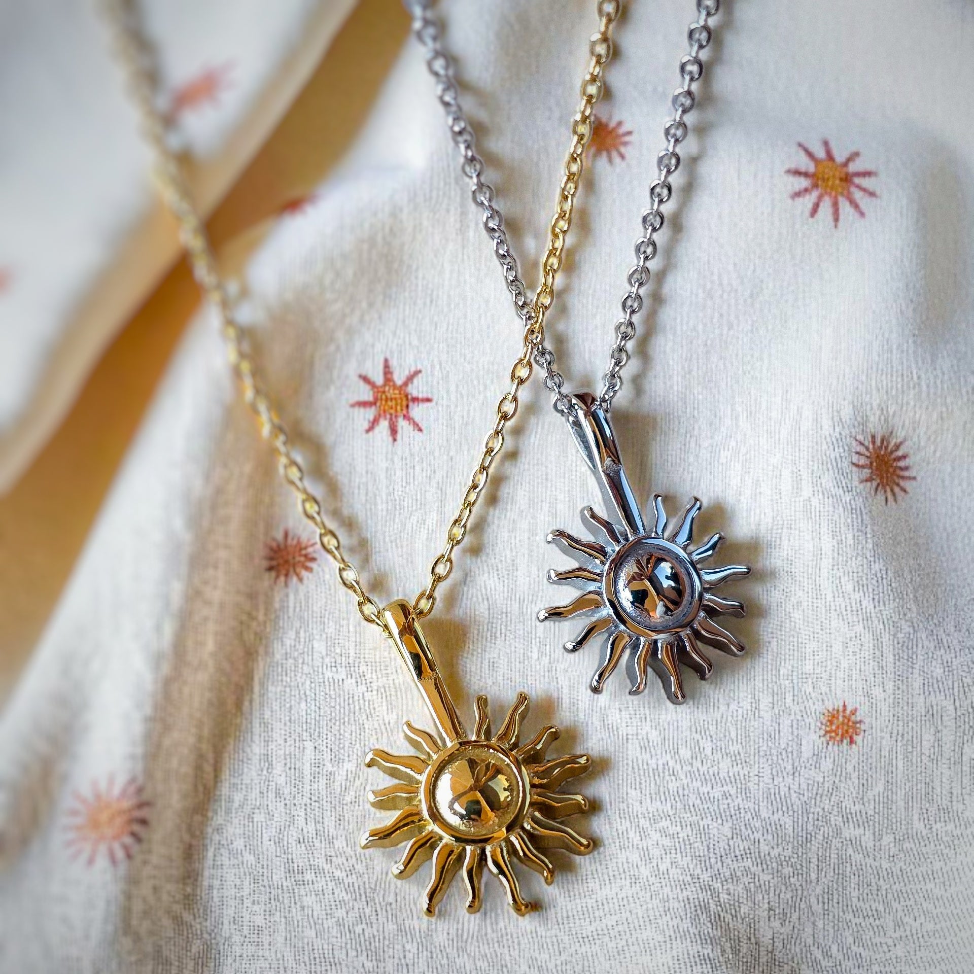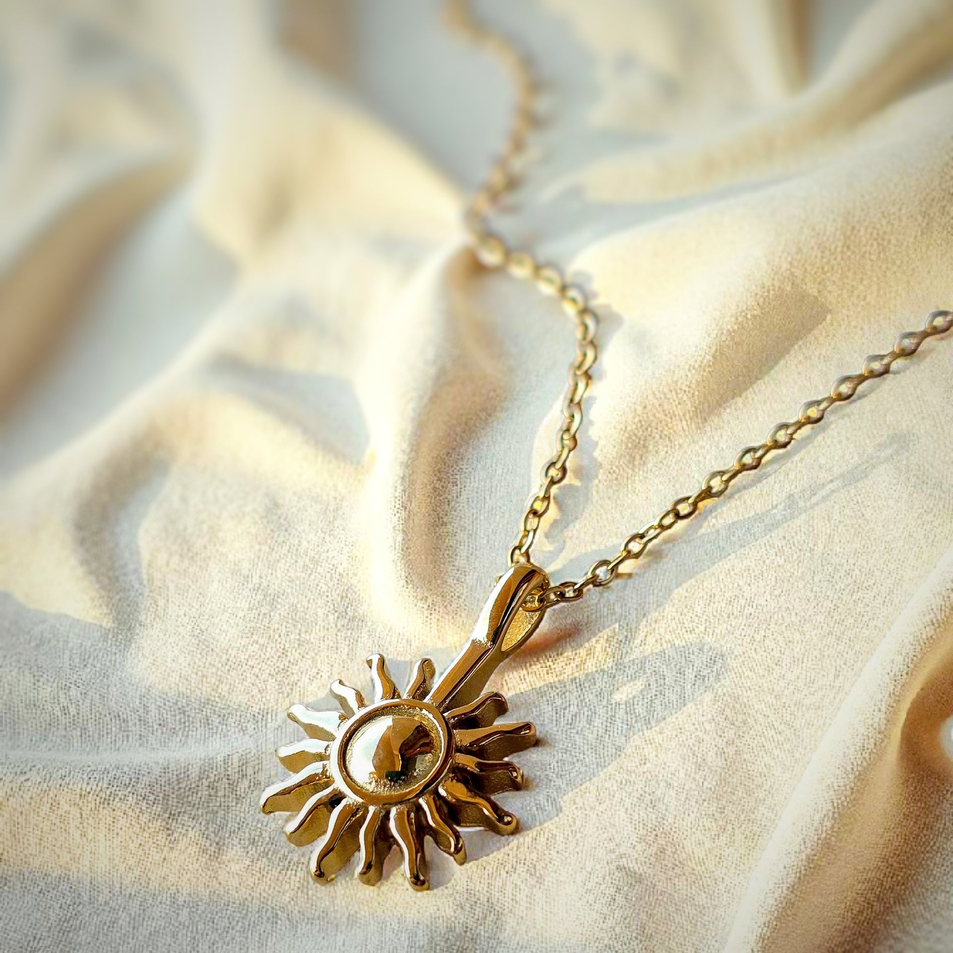 Il centro del girocollo sviluppa un Sole trionfante: i raggi si diramano dal centro come onde.