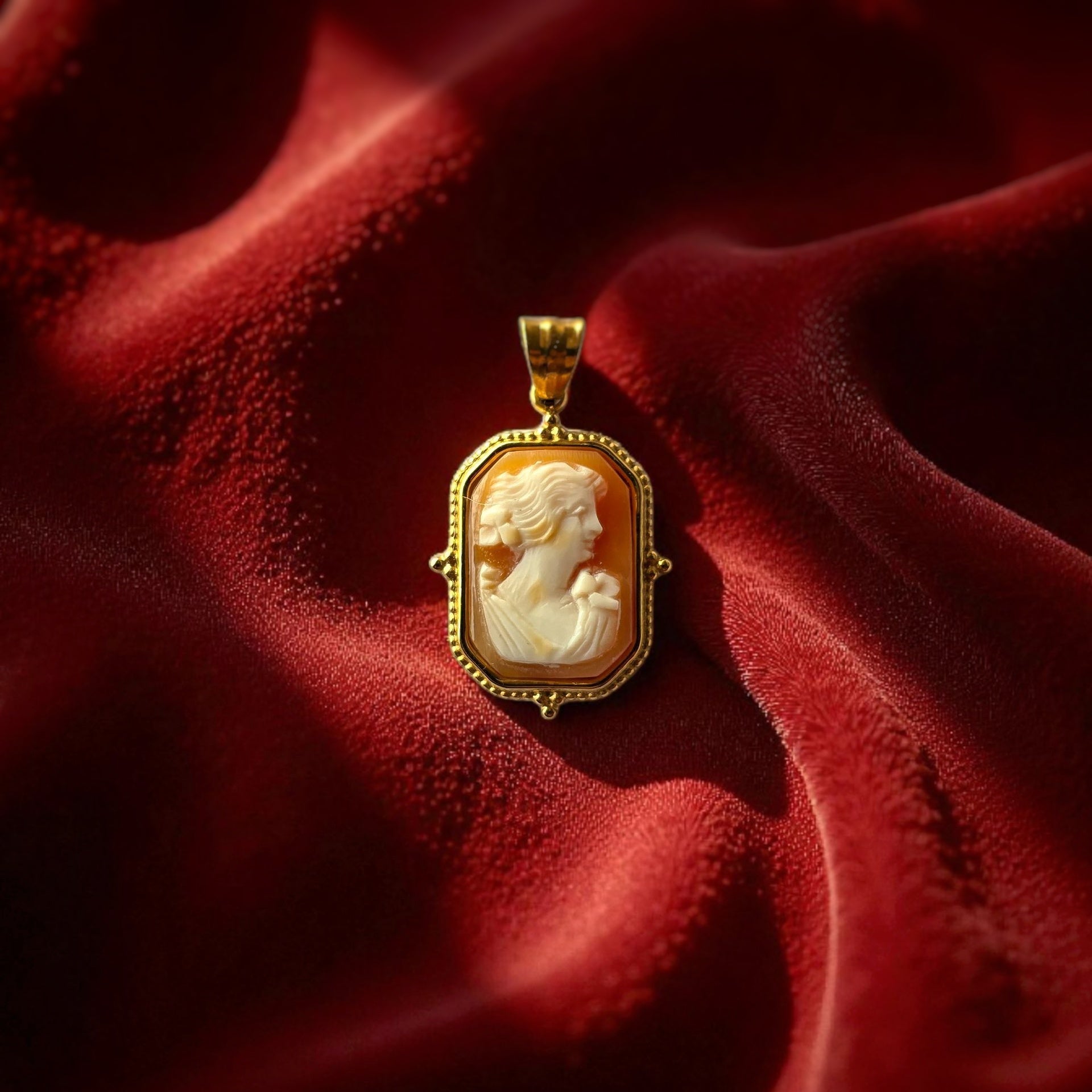 Ciondolo con cameo realizzato in conchiglia sardonica, intagliata a mano e montata su acciaio 316L placcato oro 18k.