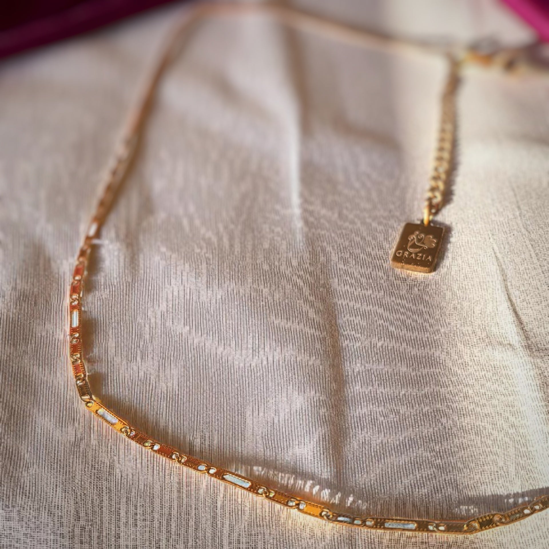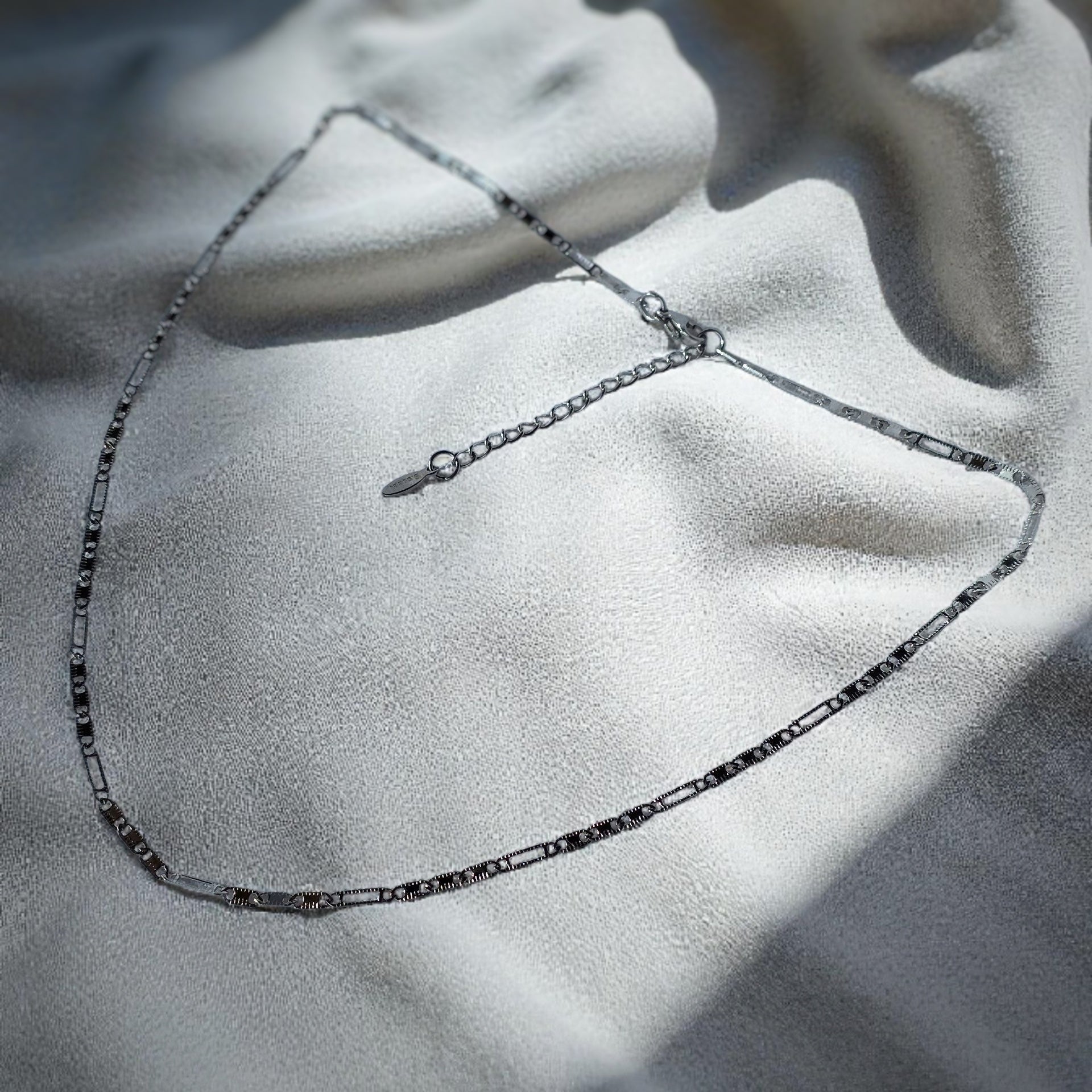 Catenina classica della gioielleria: nota come maglia a graffetta o paper clip chain, è estremamente minimalista ma d'impatto, bellissima sia con pendenti che indossata sola.