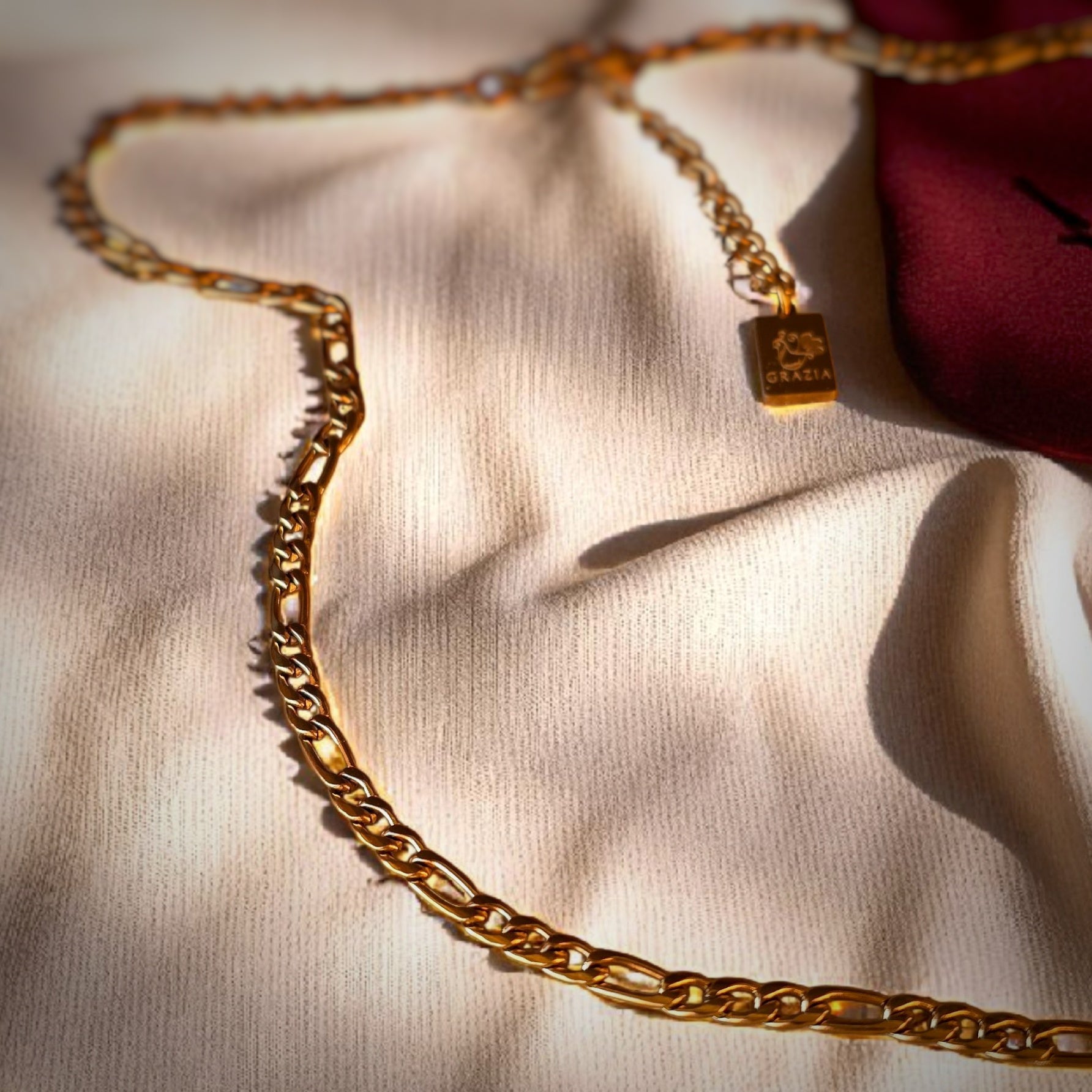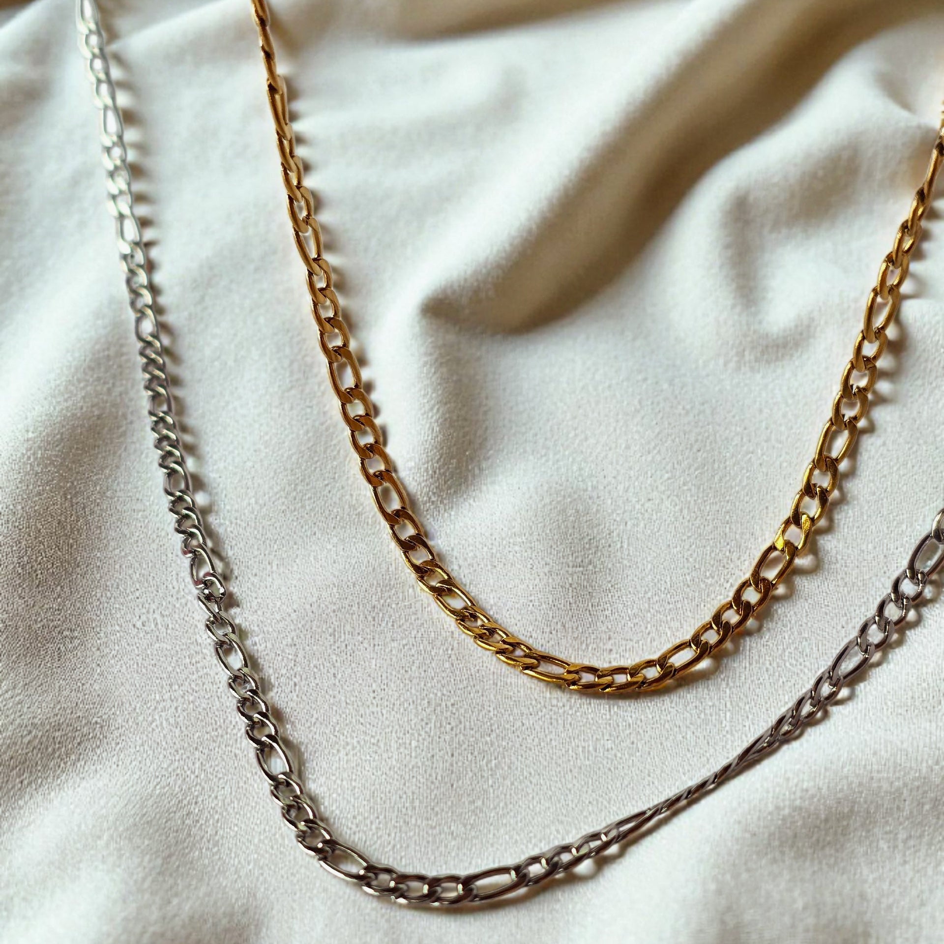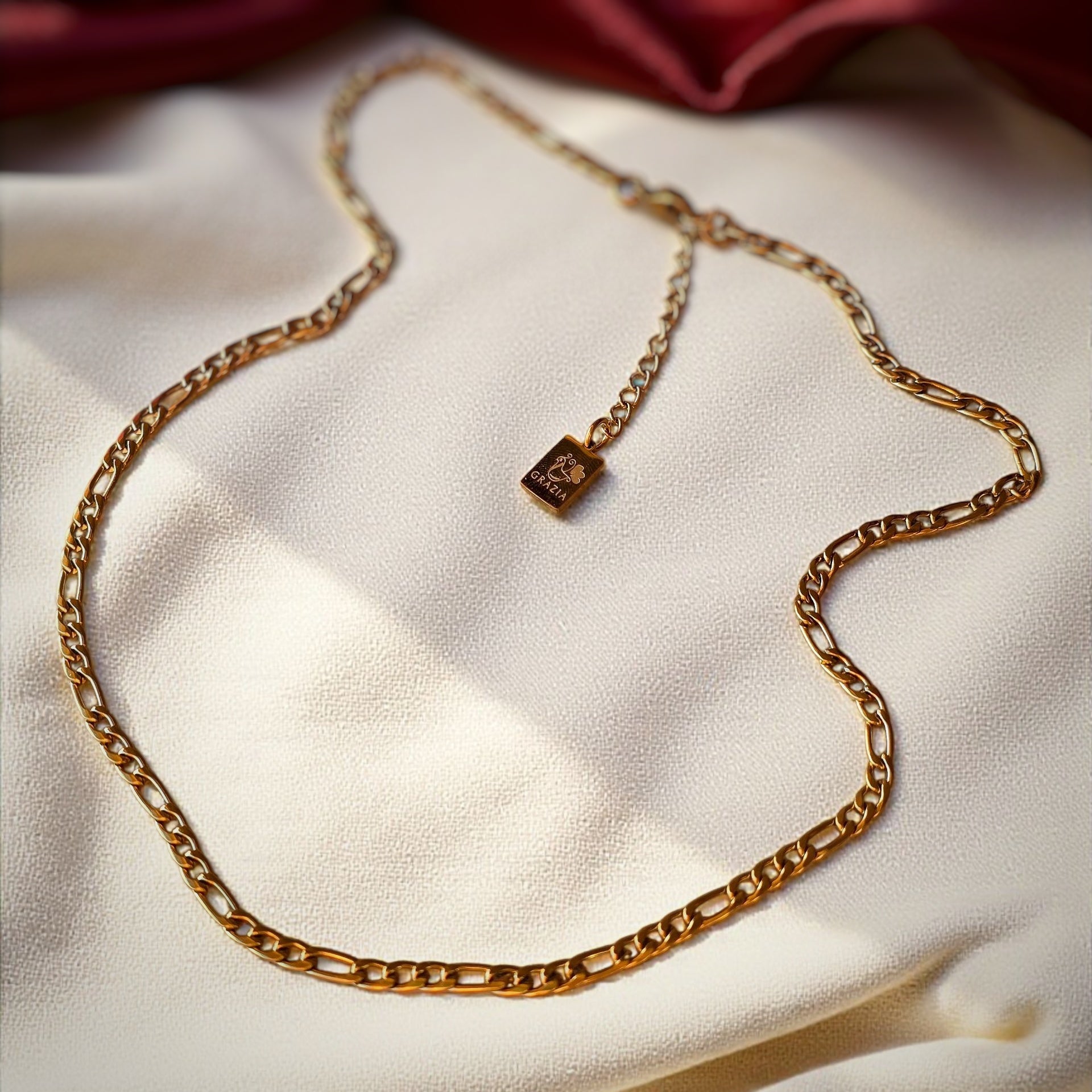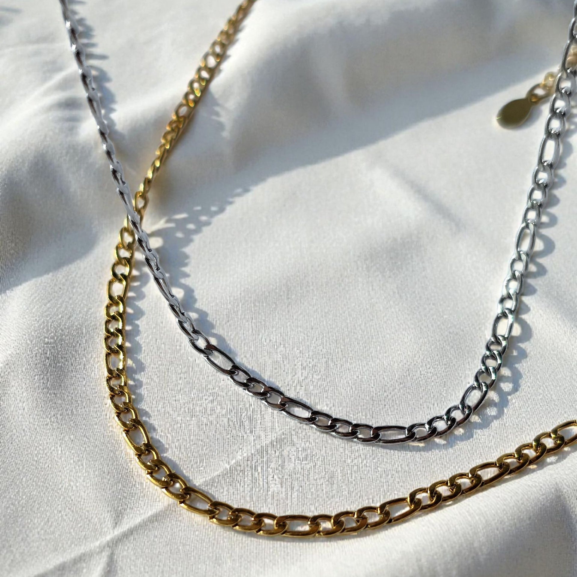 Le maglie sono piatte e leggermente ritorte, il che fa sì che la catena rifletta la luce, donando un effetto luminoso e più brillante.
