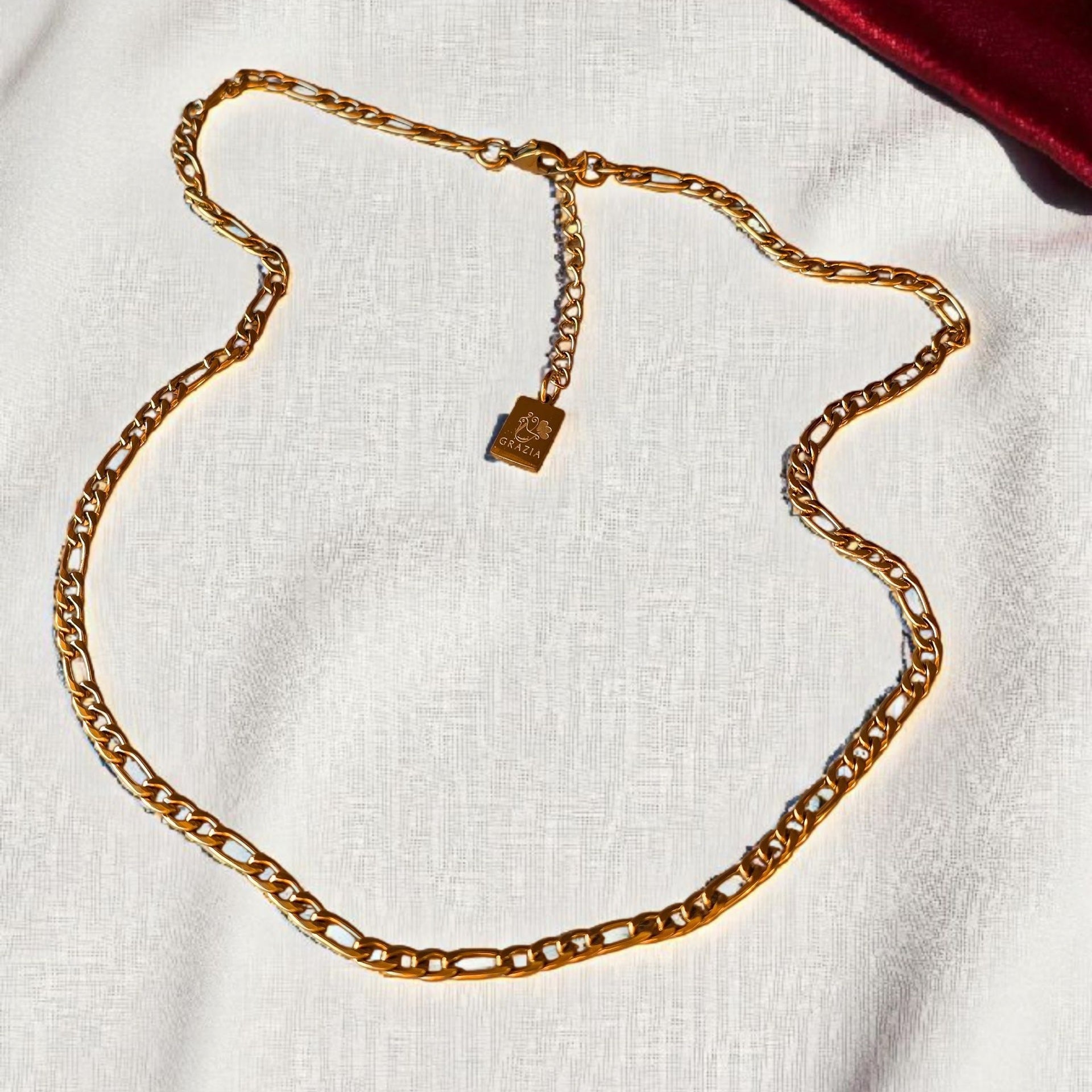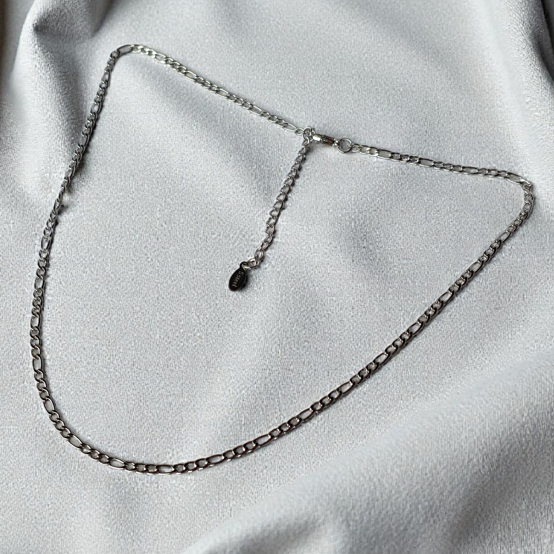 Catenina a maglia piatta tra le più classiche e riconoscibili della gioielleria italiana: composta da una sequenza regolare di tre maglie corte (tipo forzatina o curb) seguite da una maglia lunga leggermente rettangolare o ovale.