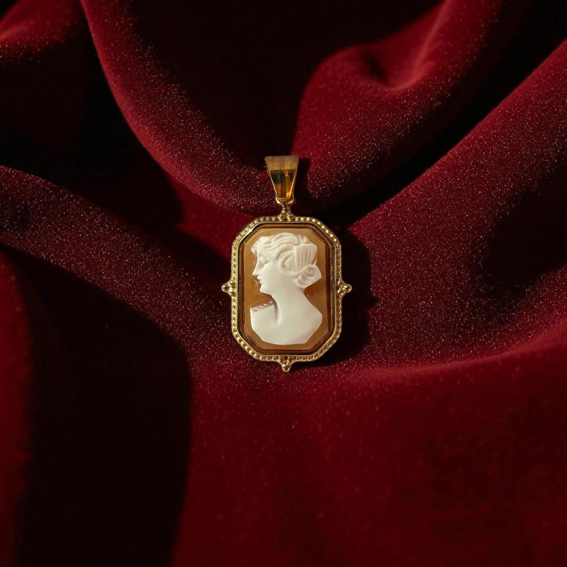 Ciondolo coon cameo in conchiglia sardonica, intagliata a mano e montata su base ottogonale in acciaio 316L galvanizzato oro 18k.