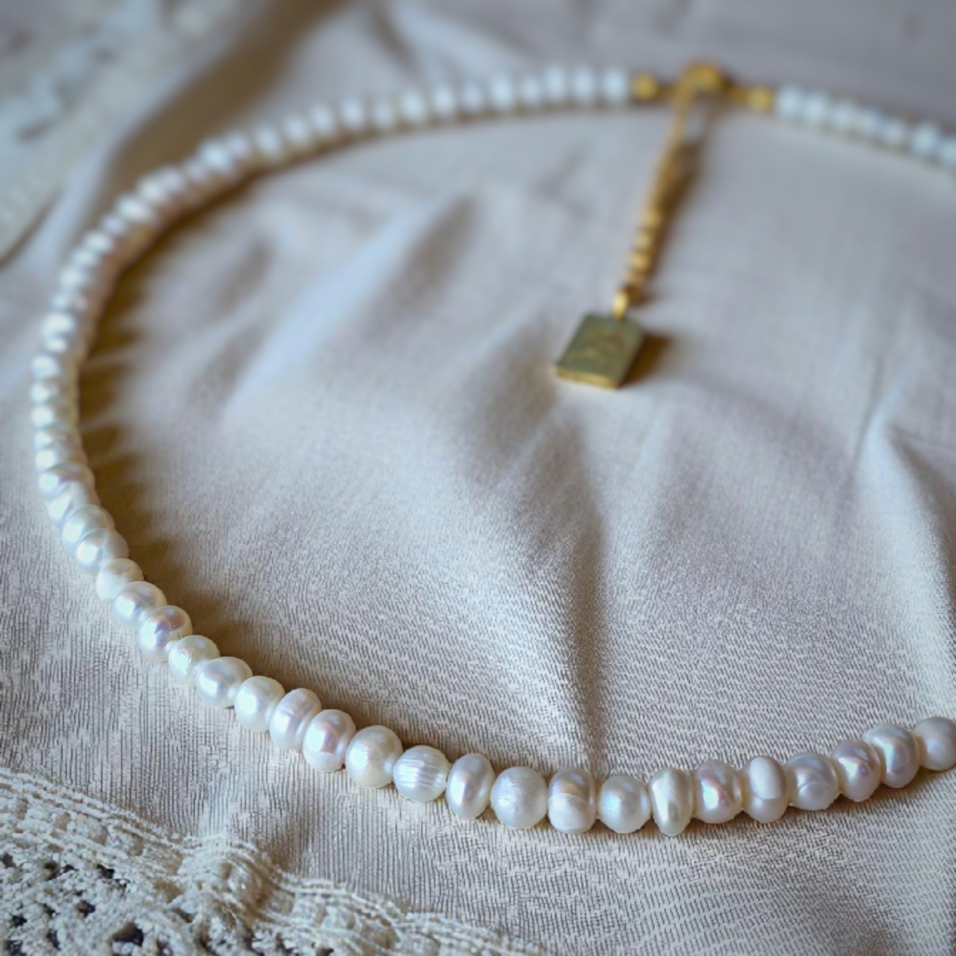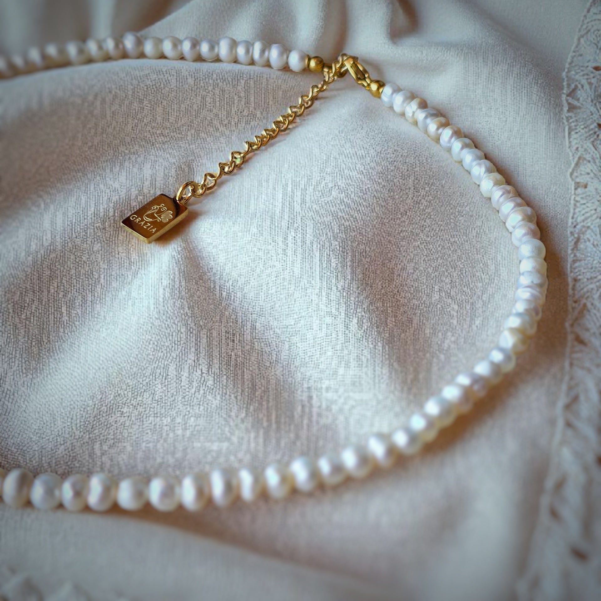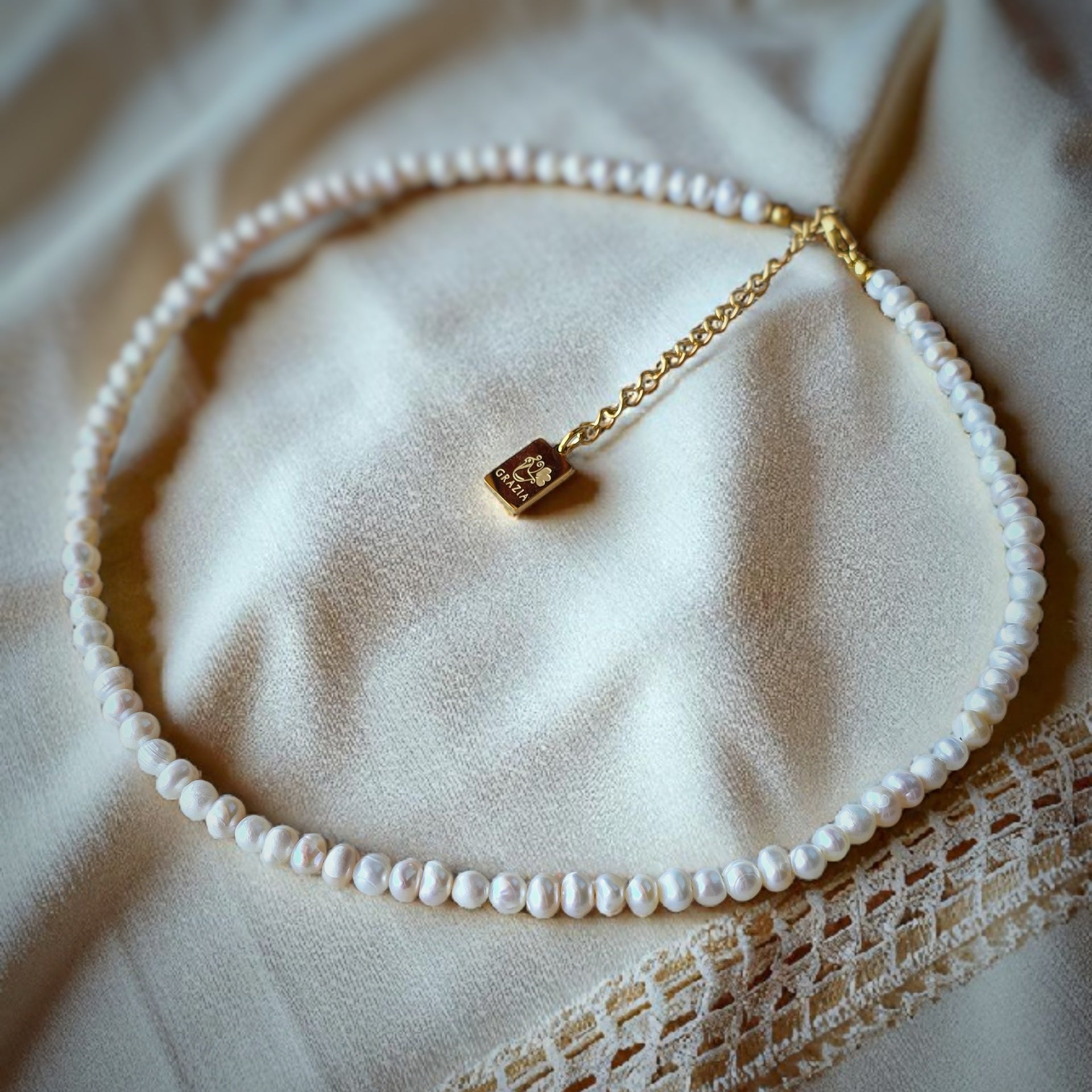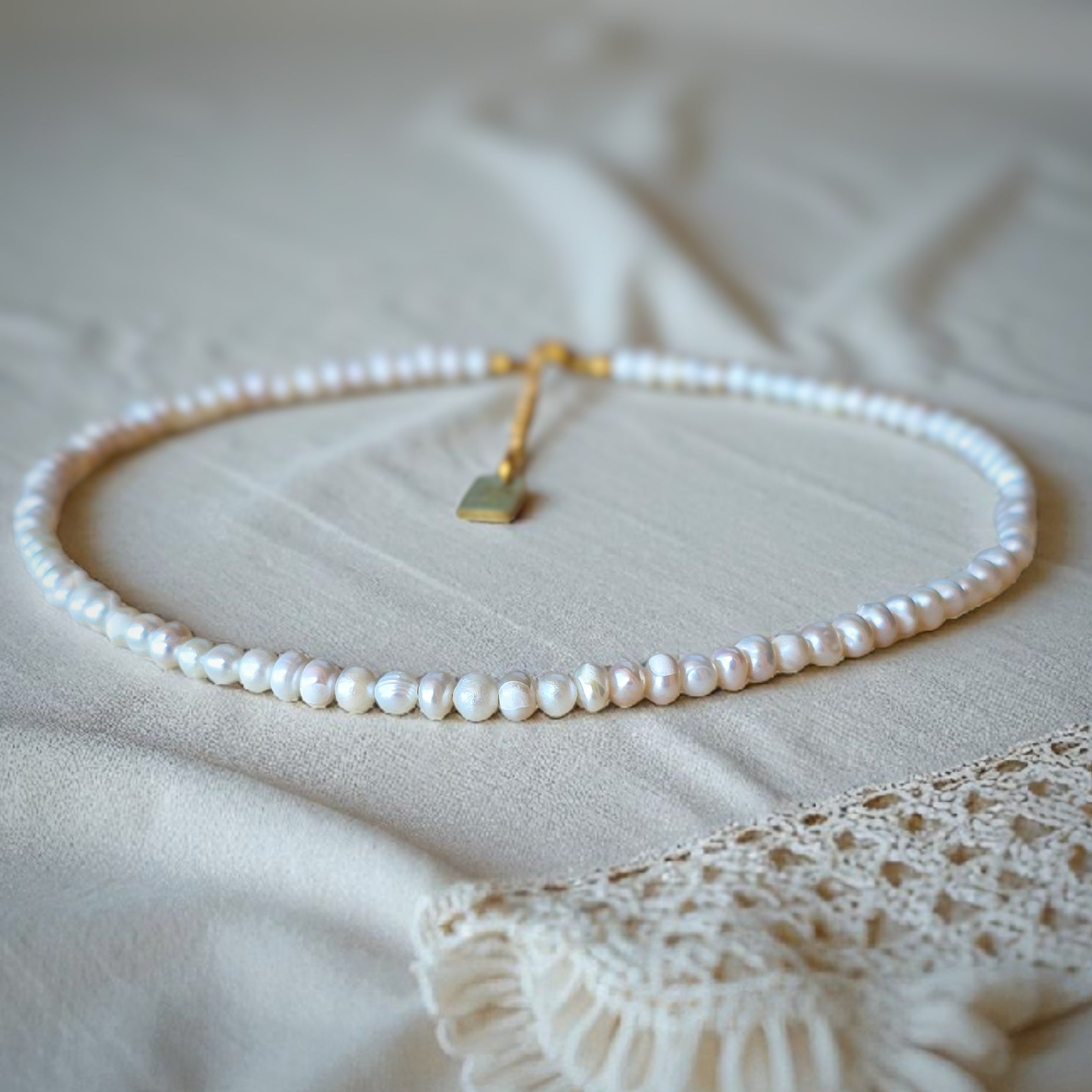 Girocollo completamente realizzato a mano con microperline di fiume bianche.
