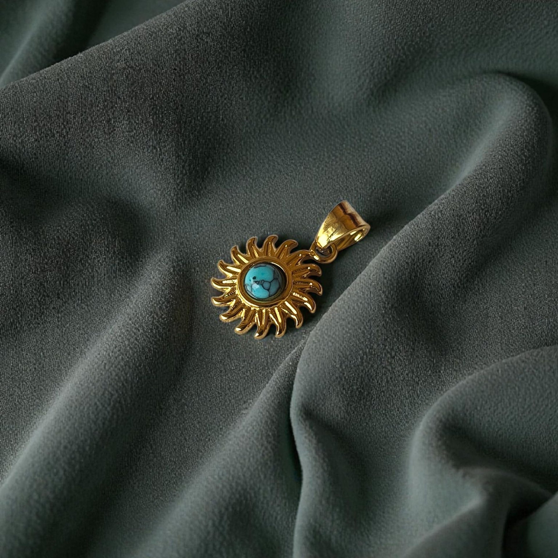 Ciondolo a forma di Sole raggiante con al centro una piccola pietra di turchese.
