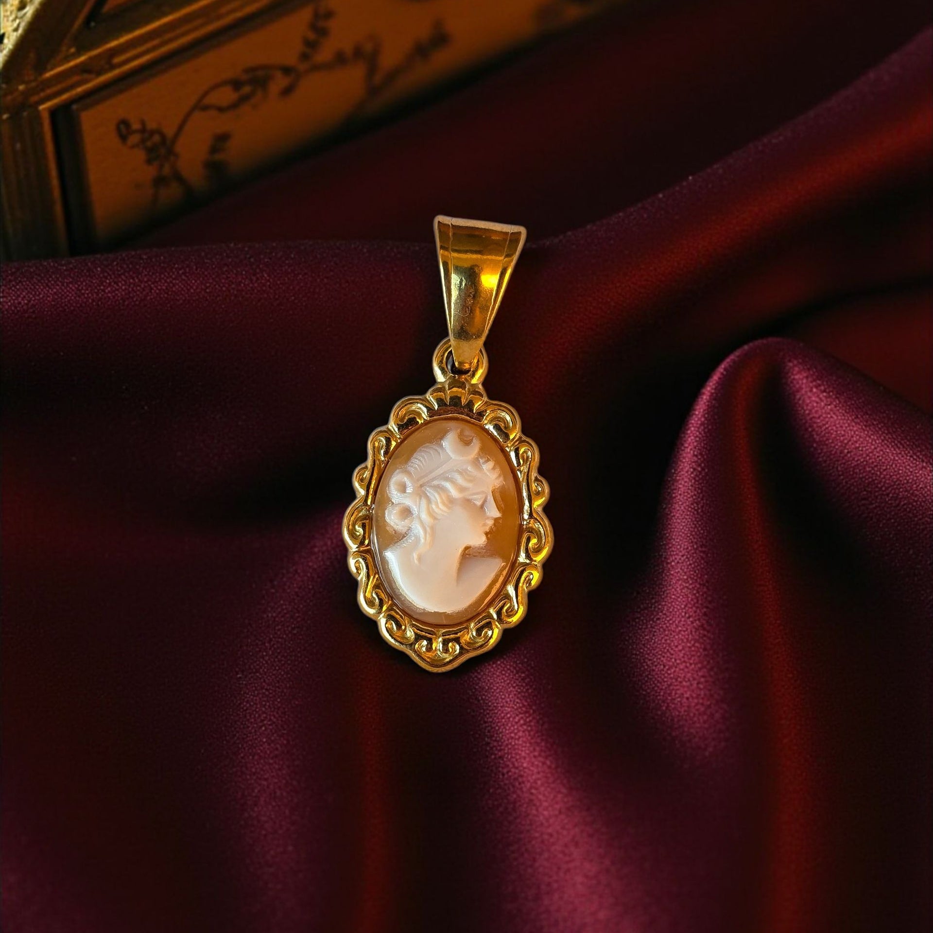 Ciondolo con cameo realizzato in conchiglia sardonica, intagliata a mano e montata su acciaio 316L placcato oro 18k.