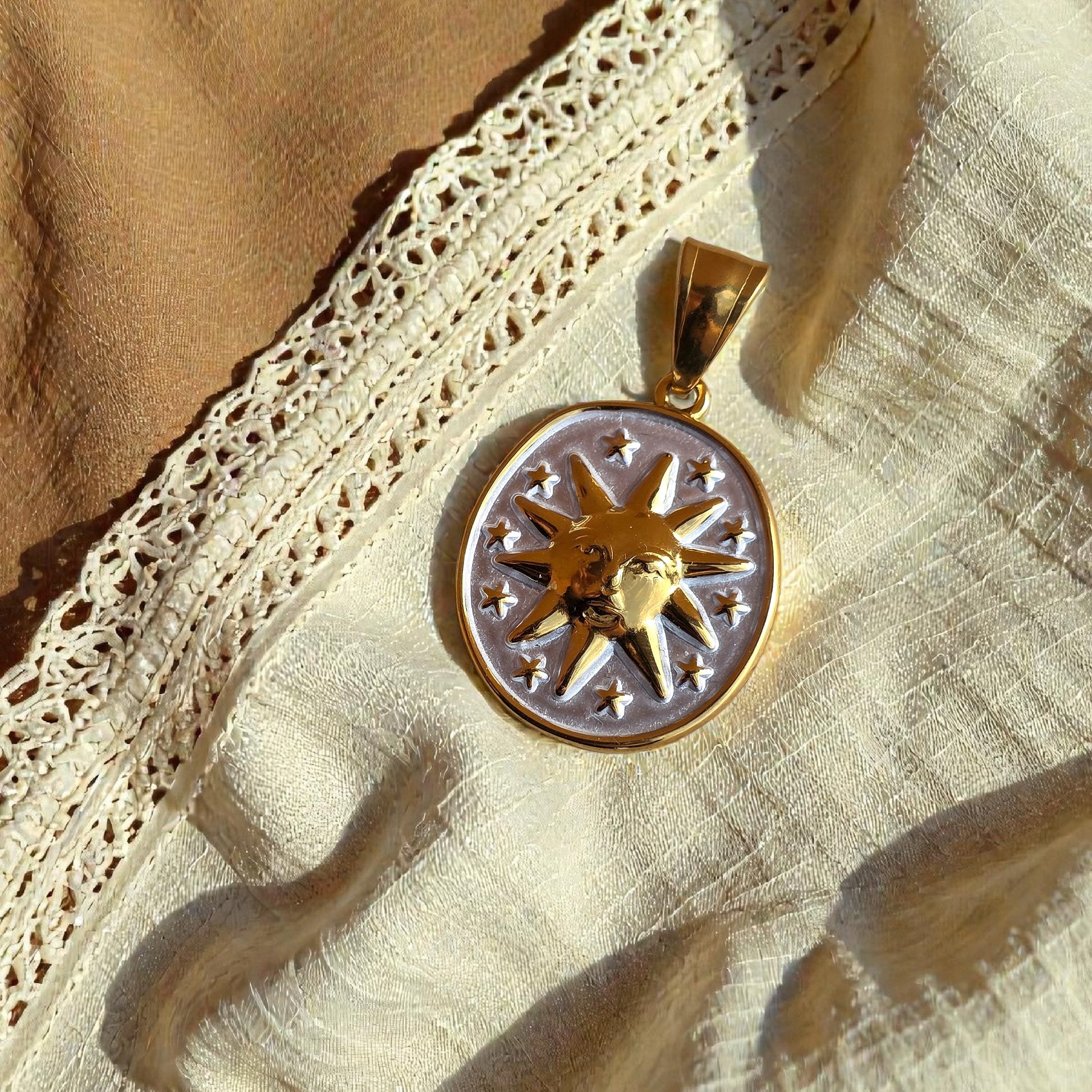 Simbolo di luce guida e armonia cosmica, il sole rappresenta l’energia vitale che illumina il cammino, mentre le stelle ricordano i desideri e la direzione da seguire.