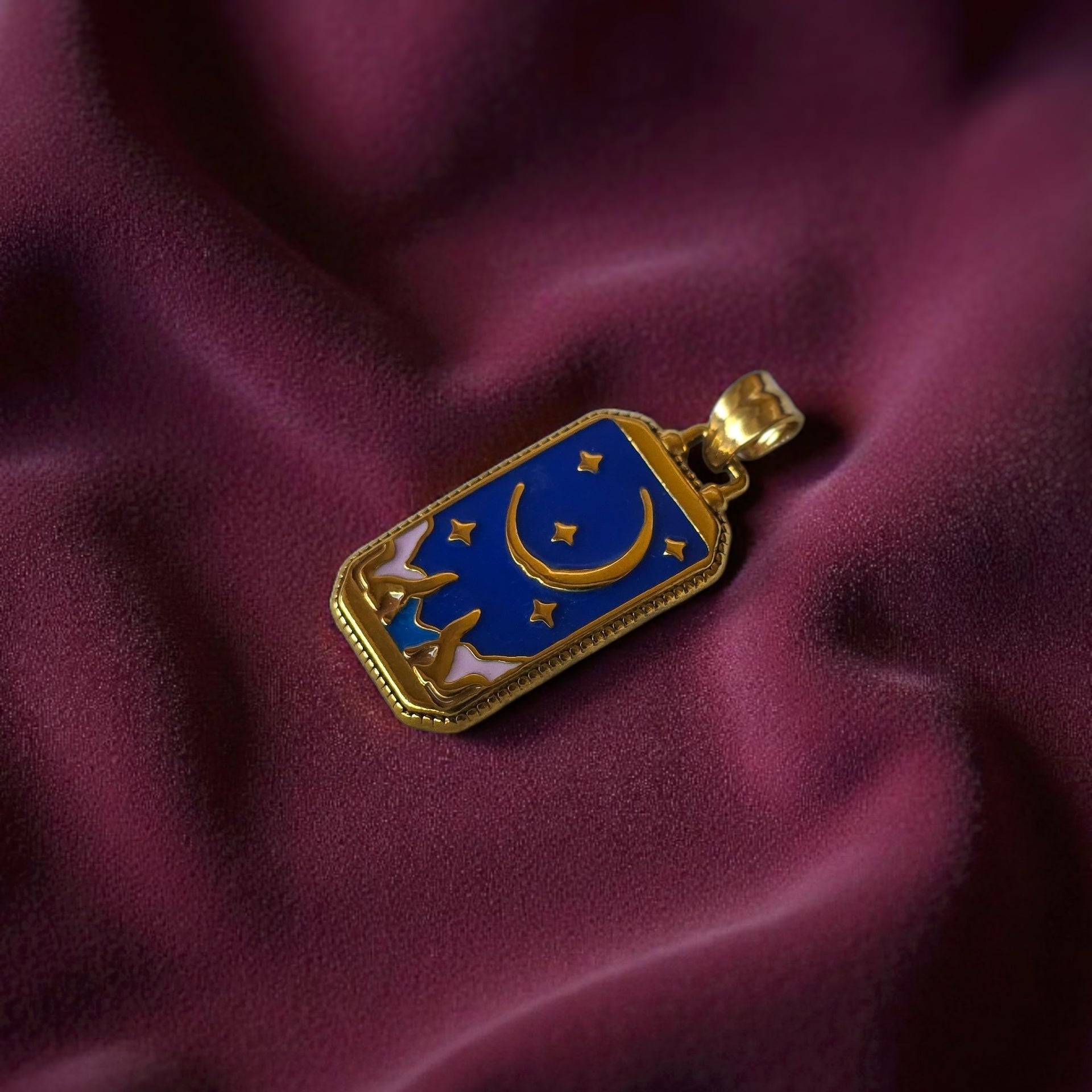 Ciondolo dedicato a uno dei Tarocchi più amati: in acciaio chirurgico 316L galvanizzato oro 18k, inciso a rilievo e smalti colorati.