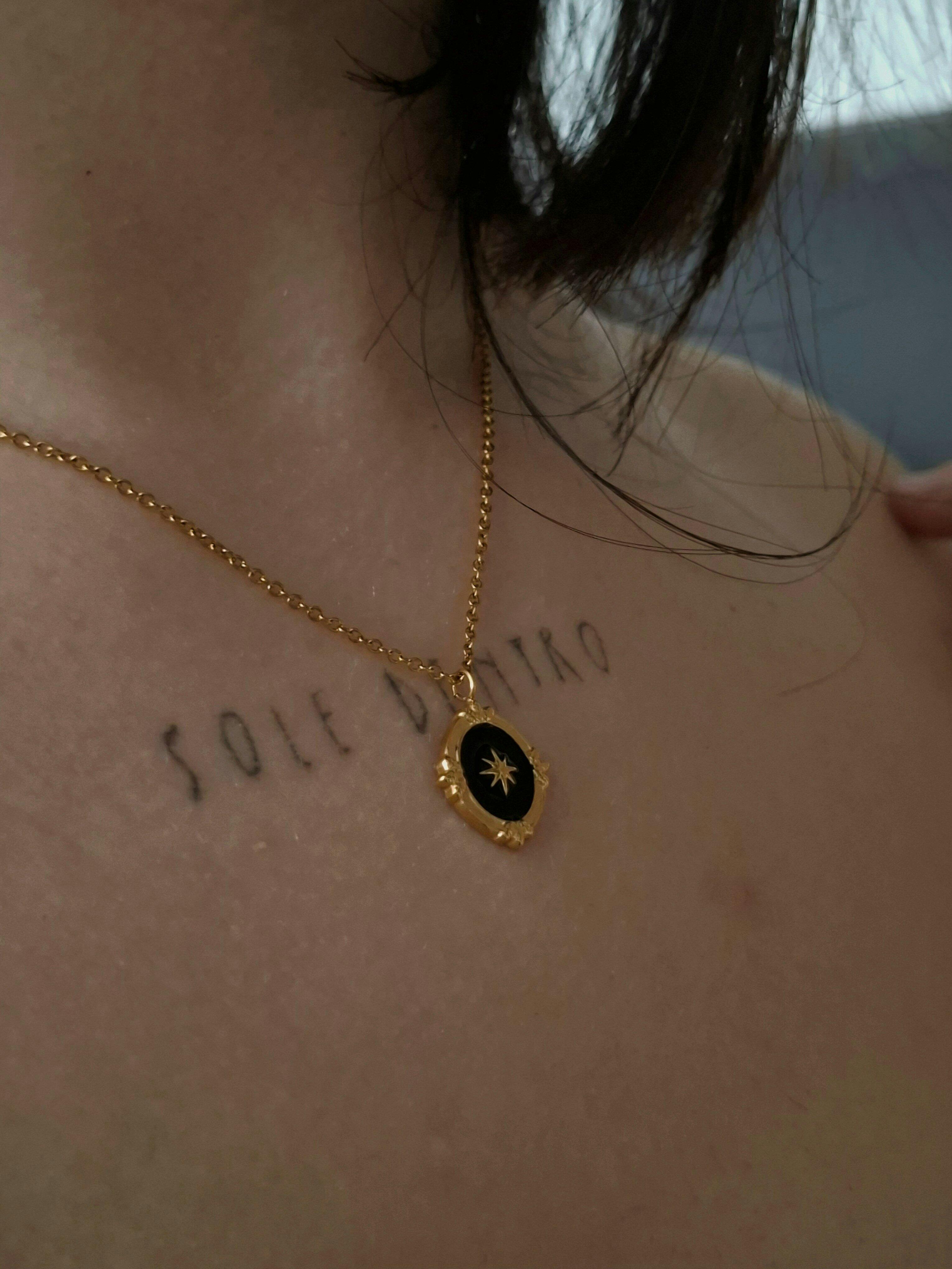 Una piccola stella del mattino al centro è incorniciata da una lavorazione che ricorda molto le cornici dei cammei; sul fondo, smalto nero.